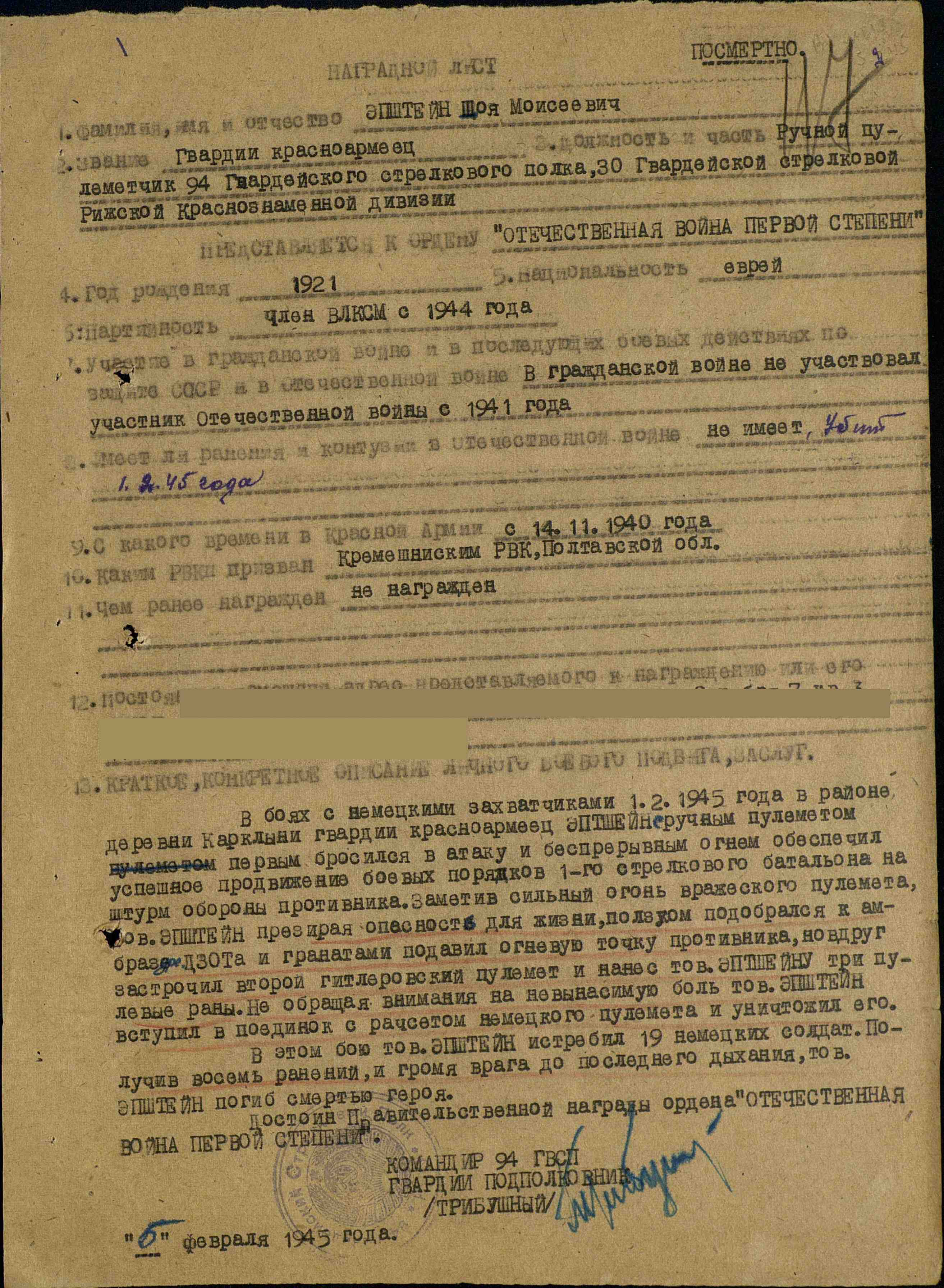 ползком подобрался к амбразуре ДЗОТа и гранатами подавил огненную точку противника, но вдруг застрочил второй гитлеровский пулемет и нанес тов. Эпштейну три пулевые раны.