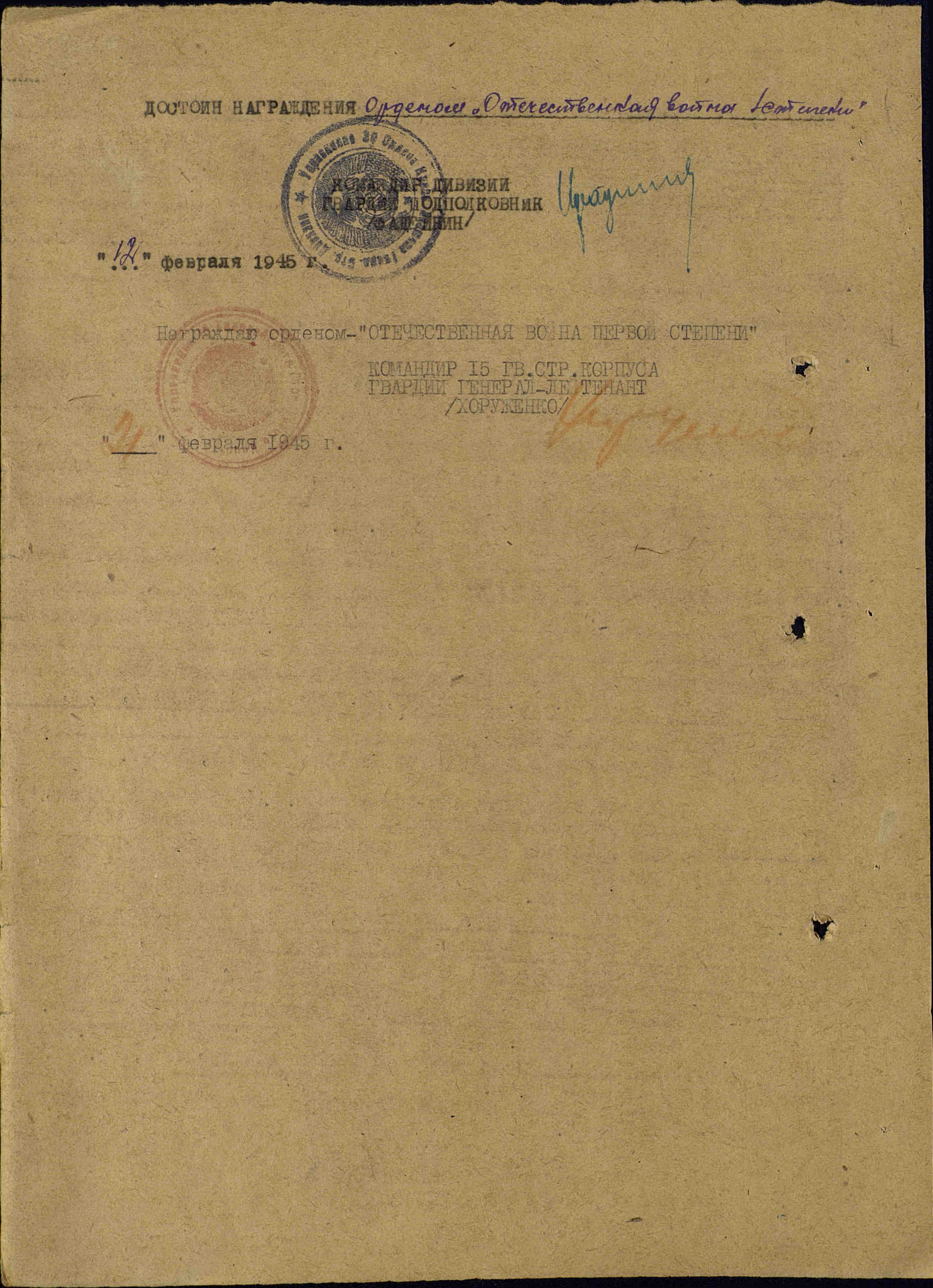 Достоин II правительственной награды орденка «Отечественная Война Первой Степени».
