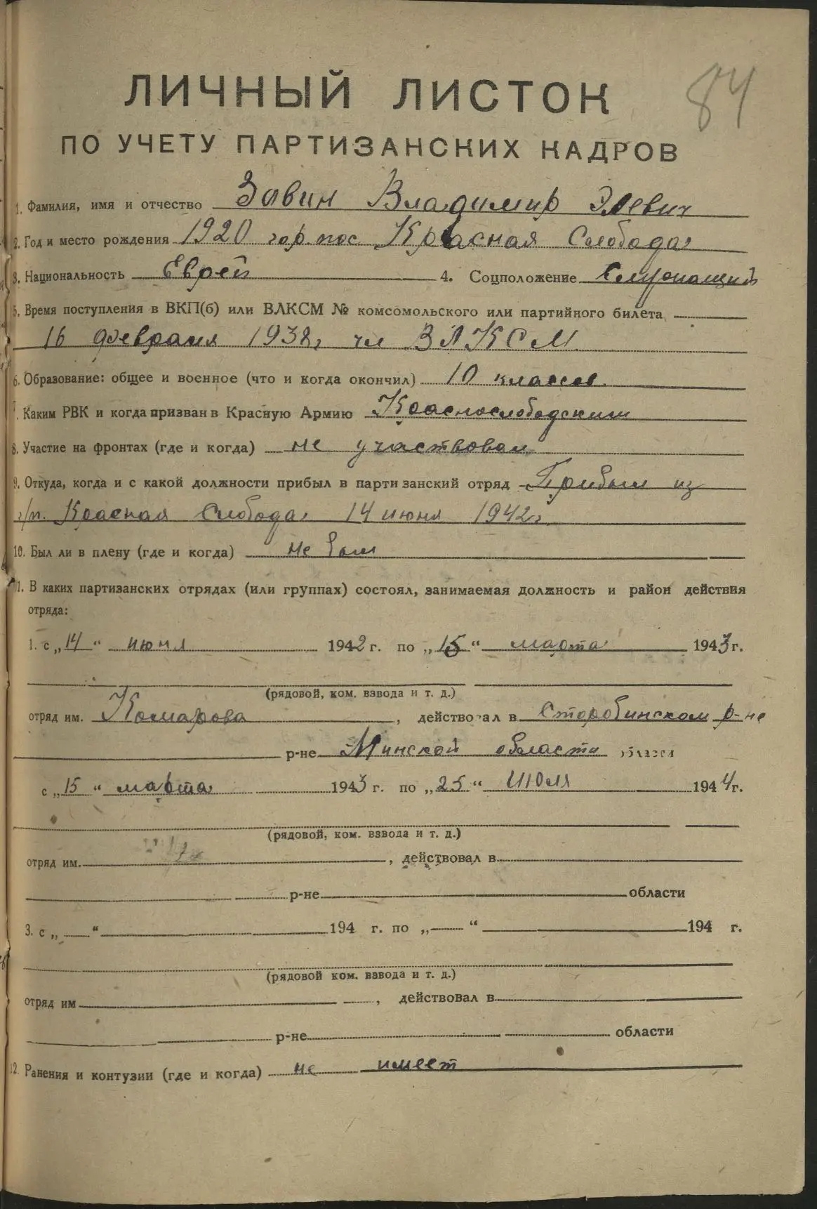 Владимир Ильич (Эльевич) Завин родился в м.Красная Слобода Минской области 20 января 1920 года. Еврей.