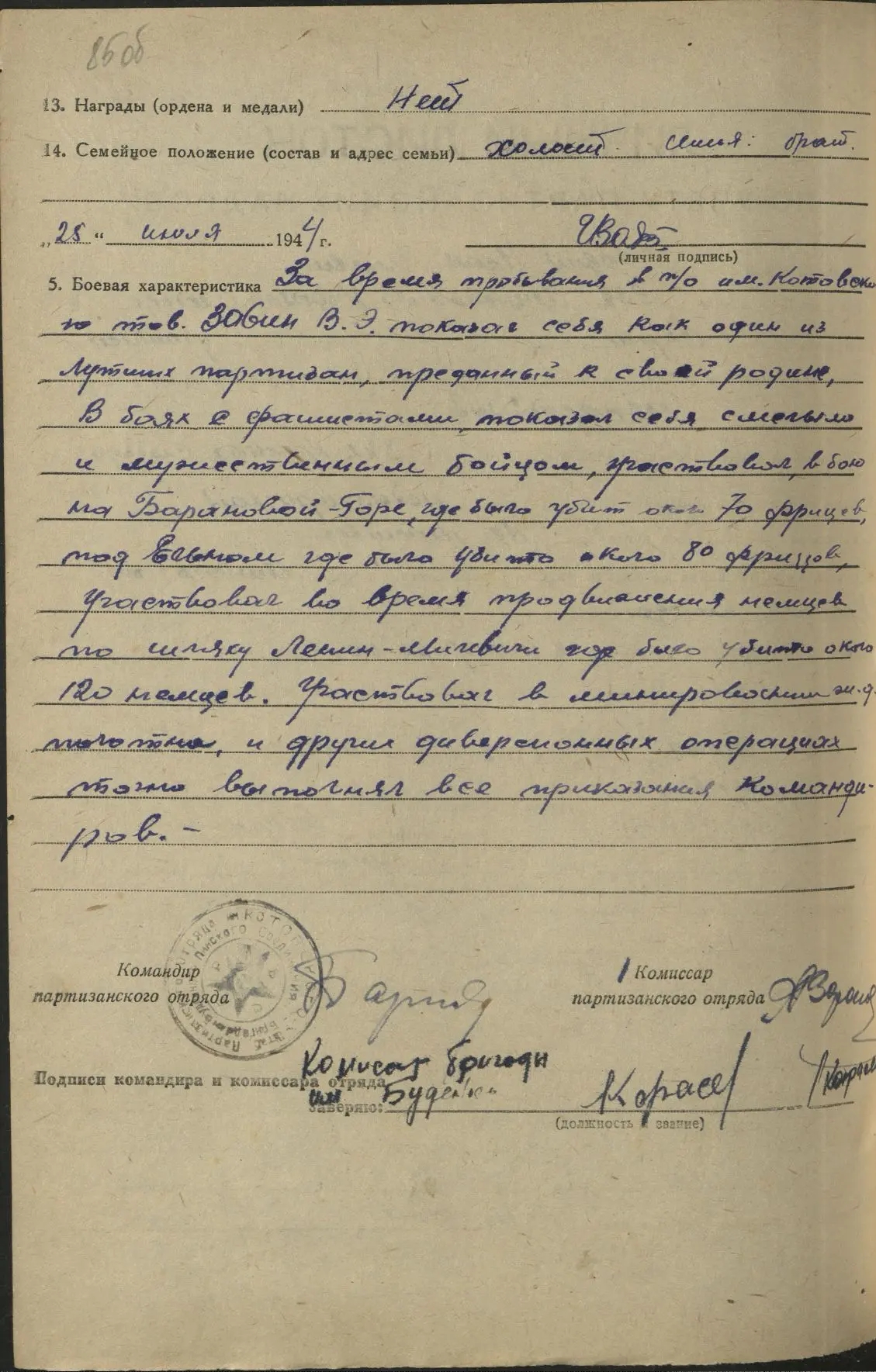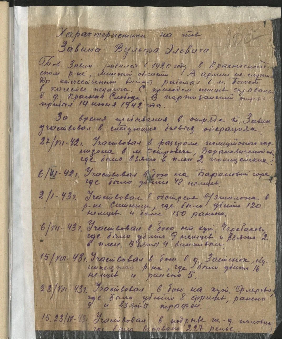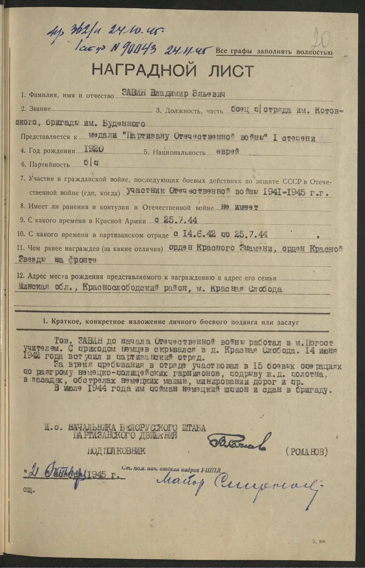 С 14.7.1942 - боец партизанского отряда им.Котовского бригады им.Буденного. Участвовал в 15 боевых операциях. Отличился во многих боях в тылу противника.