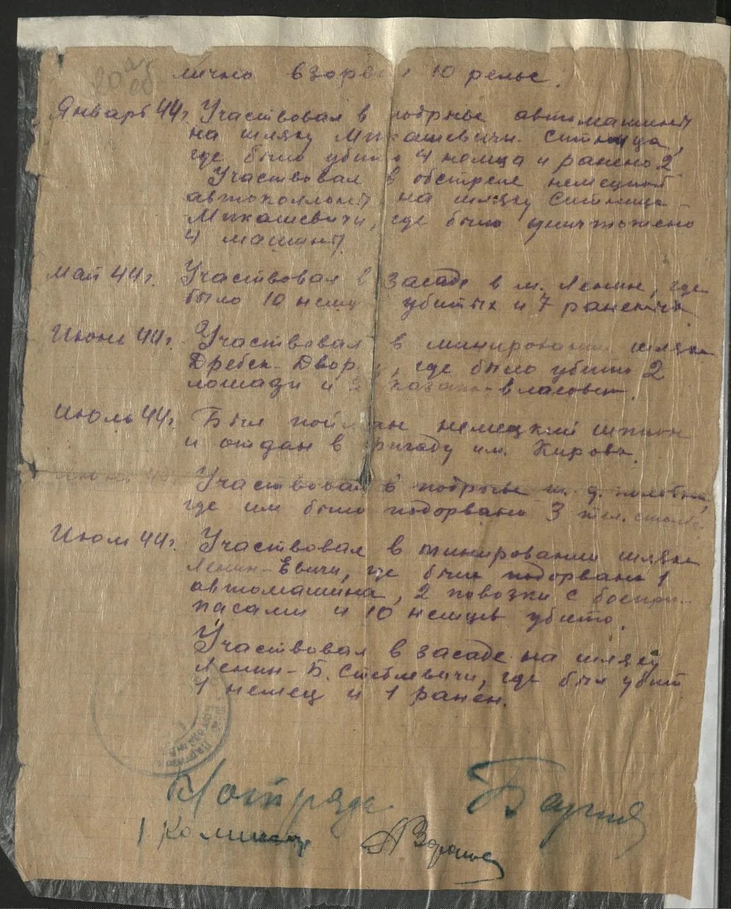 Партизан отряда им.Котовского бригады им.Буденного Пинского партизанского соединения.