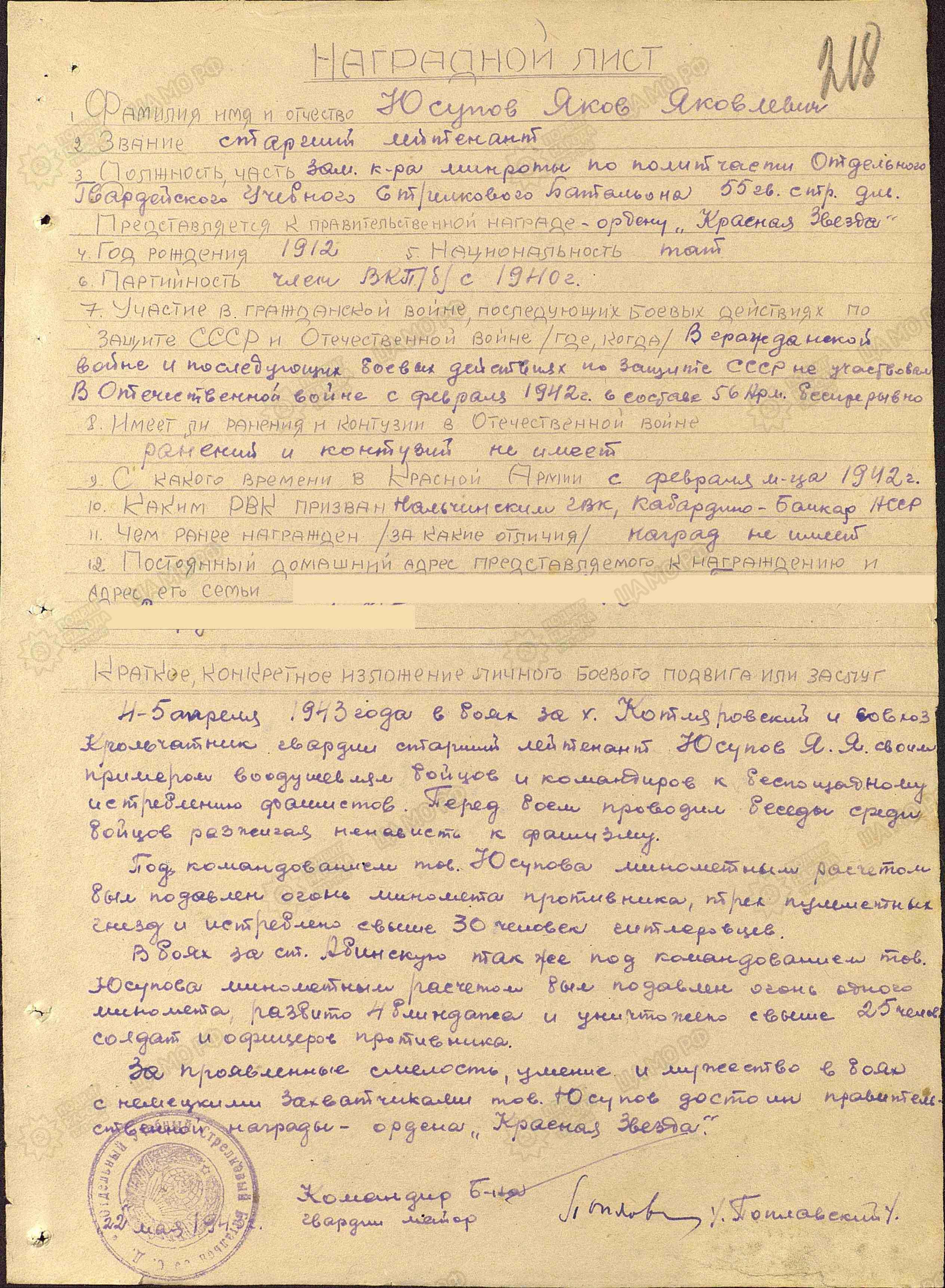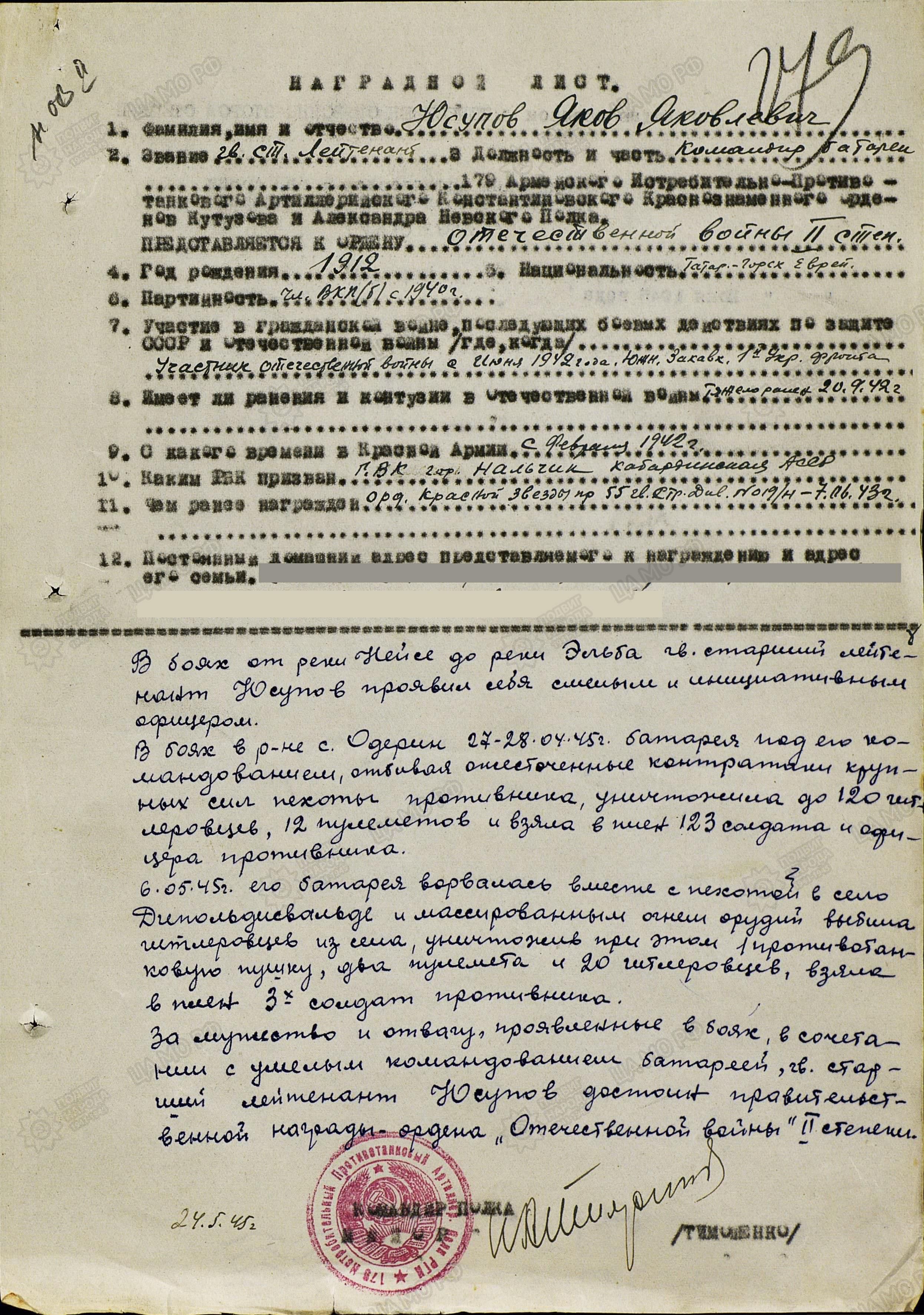 командованием батареей, гв. старший лейтенант Юсупов достоин