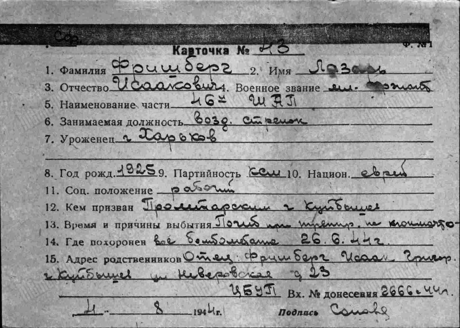 Младший сержант ФРИШБЕРГ ЛАЗАРЬ ИСААКОВИЧ, 1925 года рождения, место рождения - СССР, Украинская ССР, Харьковская область, г. Харьков, еврей. В РККА призван Пролетарским РВК, г. Куйбышева, 08.1943 года и направлен, на учебу, во 2 ОШМАС - Ораниенбаумскую (Ломоносовскую) школу младших авиационных специалистов, дислоцированную в г. Саранске, Мордовской АССР, готовившую специалистов, для Военно-воздушных сил флотов. Филиал 2 ОШМАС, готовившей воздушных стрелков-радистов, находился в г. Рузаевка, 25 км. от г. Саранска. В Великой Отечественной войне, с начала, 1944 года в составе ВВС ВМФ (Краснознамённый Северный флот) в должности (последняя): Воздушного стрелка - радиста экипажа штурмовика ИЛ-2 46 штурмового авиационного Печенгского дважды Краснознамённого полка, 14 смешанной авиационной дивизии, ВВС ВМФ ( Краснознамённого Северного флота). Ранения: нет. Боевые награды: нет. С Великой Отечественной войны не вернулся: 26.06.1944 года, на самолёте-штурмовике Ил-2, при отработке топмачтового бомбометания (способ бомбометания, применявшийся военно-морской авиацией противоборствующих сторон для борьбы с надводными судами во время Второй мировой войны, использующий свойство авиабомб рикошетировать от водной глади) , на морском полигоне, самолёт врезался в мачты, экипаж погиб. Извещение: Куйбышевский ГВК, РСФСР, г. Куйбышев, ул. Неверовская, дом 9, кв.№27, отец - Фришберг Исаак Григорьевич. Захоронен: СССР, Мурманская область, пос. Губа Ваенга-1, кладбище, братское воинское захоронение (предварительно); Россия, Мурманская область, г. Североморск, воинский участок кладбища, по ул. Корабельной (недалеко от берега залива, в районе штаба Северного флота; в настоящее время). Вечная Слава и Память лётчикам и воздушным стрелкам-радистам ВВС Краснознамённого Северного флота!