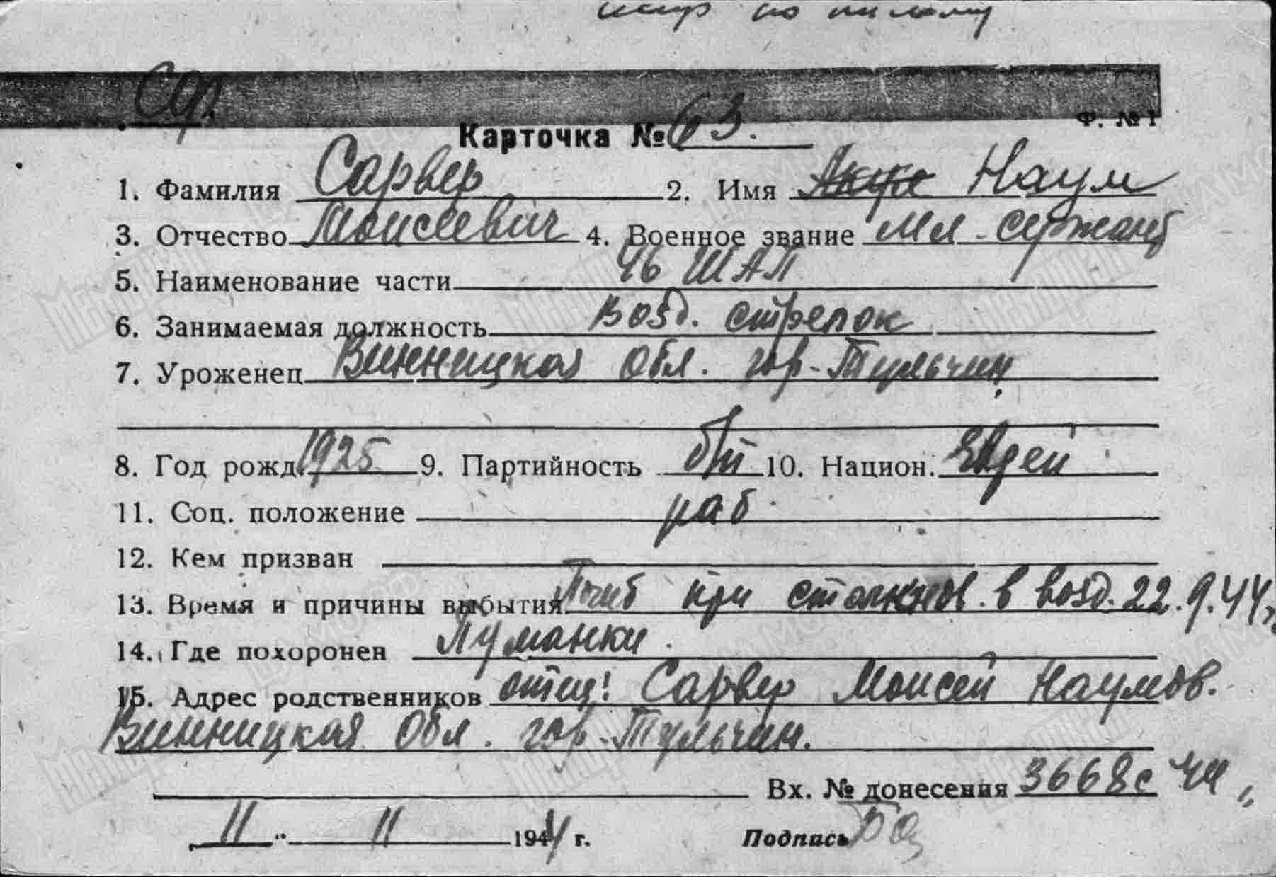 Сарвер Наум МоисеевичДокумент в учетной картотекеДата рождения: __.__.1925Место рождения: Украинская ССР, Винницкая обл., Тульчинский р-н, г. ТульчинВоинское звание: мл. сержантПоследнее место службы: сф 46 штурм. апДата выбытия: 22.09.1944Причина выбытия: погиб