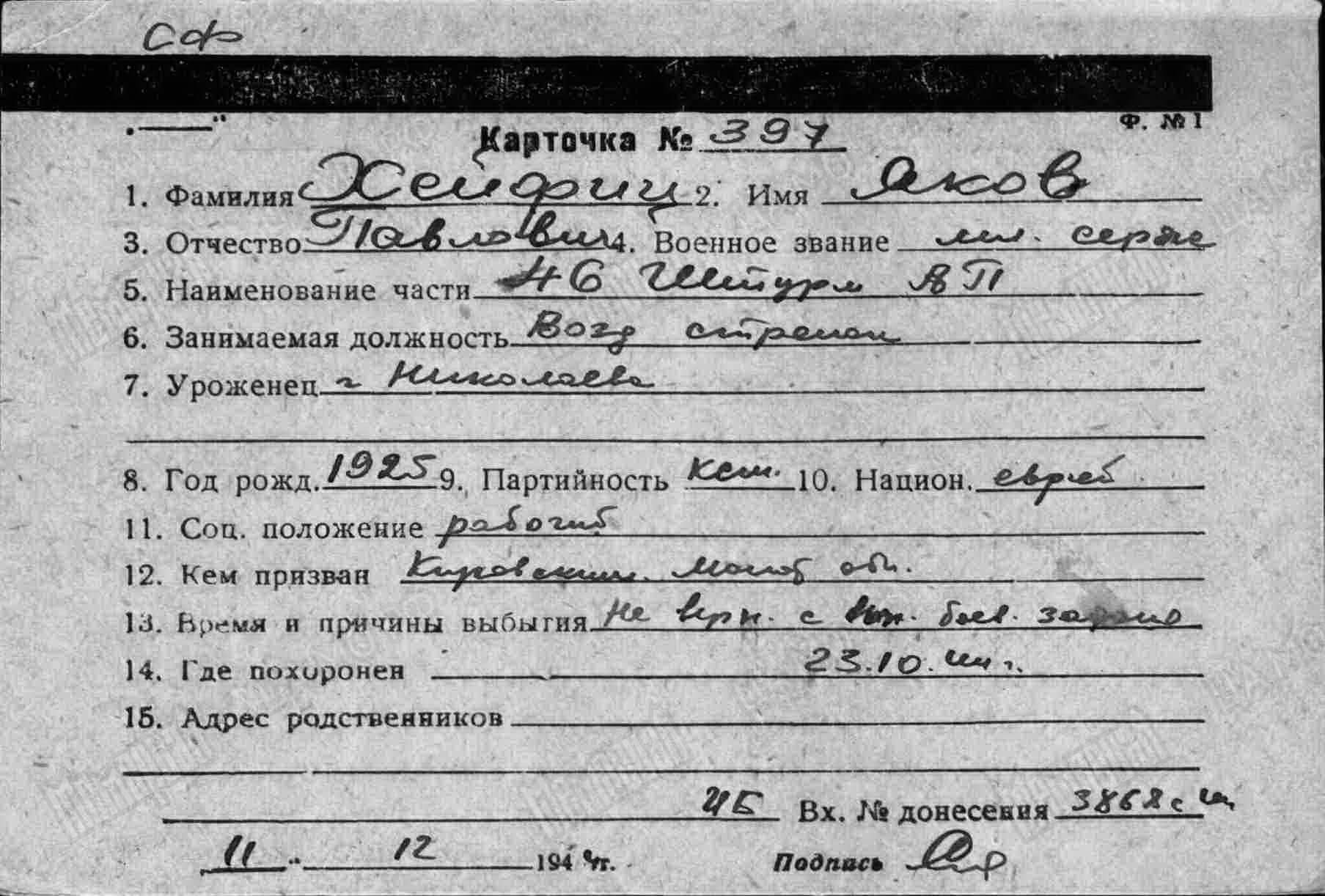 Младший сержант ХЕЙФИЦ ЯКОВ ПАВЛОВИЧ, 1925 года рождения, место рождения - СССР, Украинская ССР, Николаевская область, г. Николаев, еврей. В РККА призван Кировским РВК, г. Кирова, Молотовской(Пермской) области, РСФСР, в 1943 году и направлен на учебу во 2 ОШМАС: Ораниенбаумскую(Ломоносовскую) школу младших авиационных специалистов, дислоцированную в г. Саранске, Мордовской АССР, обучающую специалистов, для Военно-воздушных сил флотов. Филиал 2 ОШМАС, готовившей воздушных стрелков-радистов, находился в г. Рузаевка, 25 км. от г. Саранска. В Великой Отечественной войне, с конца, 1943 года в составе ВВС ВМФ (Краснознамённый Северный флот) в должности (последняя): Воздушного стрелка -радиста экипажа штурмовика ИЛ-2 46 штурмового авиационного Печенгского дважды Краснознамённого полка, 14 смешанной авиационной дивизии, ВВС Краснознамённого Северного флота. Ранения: нет. Боевые награды: нет. С Великой Отечественной войны не вернулся: 23.10.1944 года, при нанесеннии бомбо-штурмового удара, по кораблям противника, в районе Варангер-фьорд, Северная Норвегия, сбит зенитно-артиллерийским огнём противника, над целью. Погиб с экипажем(командиром младшим лейтенантом КАДИЕВЫМ КОНСТАНТИНОМ ЗАХАРОВИЧЕМ,1923 года рождения, место рождения - РСФСР, Северо-Осетинская АССР, осетин.). Извещение: наличие родственников и место проживания - неизвестно. Захоронен: неизвестно. Вечная Слава и Память экипажу штурмовика Ил-2, морской авиации ВВС Краснознамённого Северного флота младшему лейтенанту КАДИЕВУ КОНСТАНТИНУ ЗАХАРОВИЧУ и воздушному стрелку-радисту младшему сержанту ХЕЙФИЦУ ЯКОВУ ПАВЛОВИЧУ!