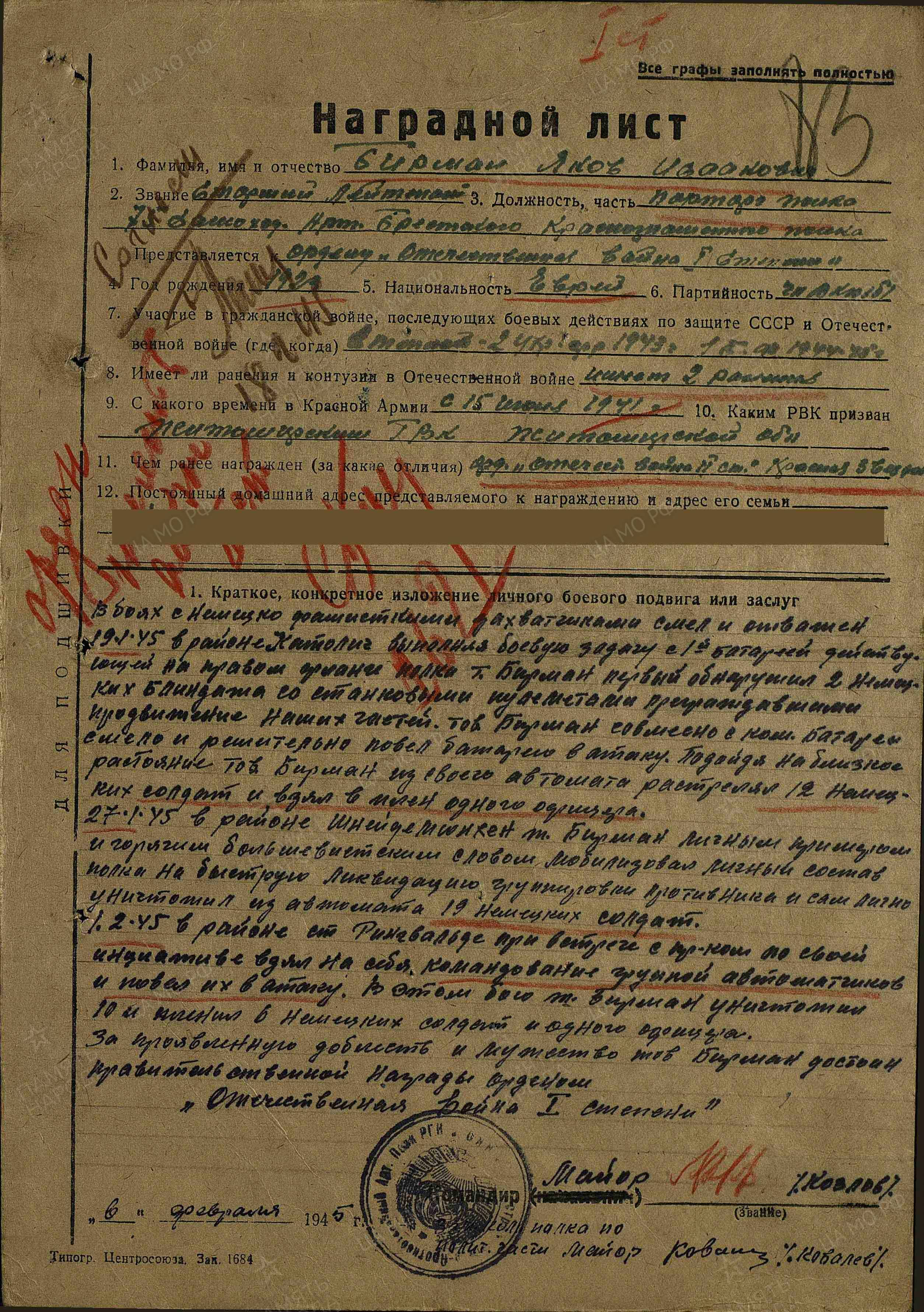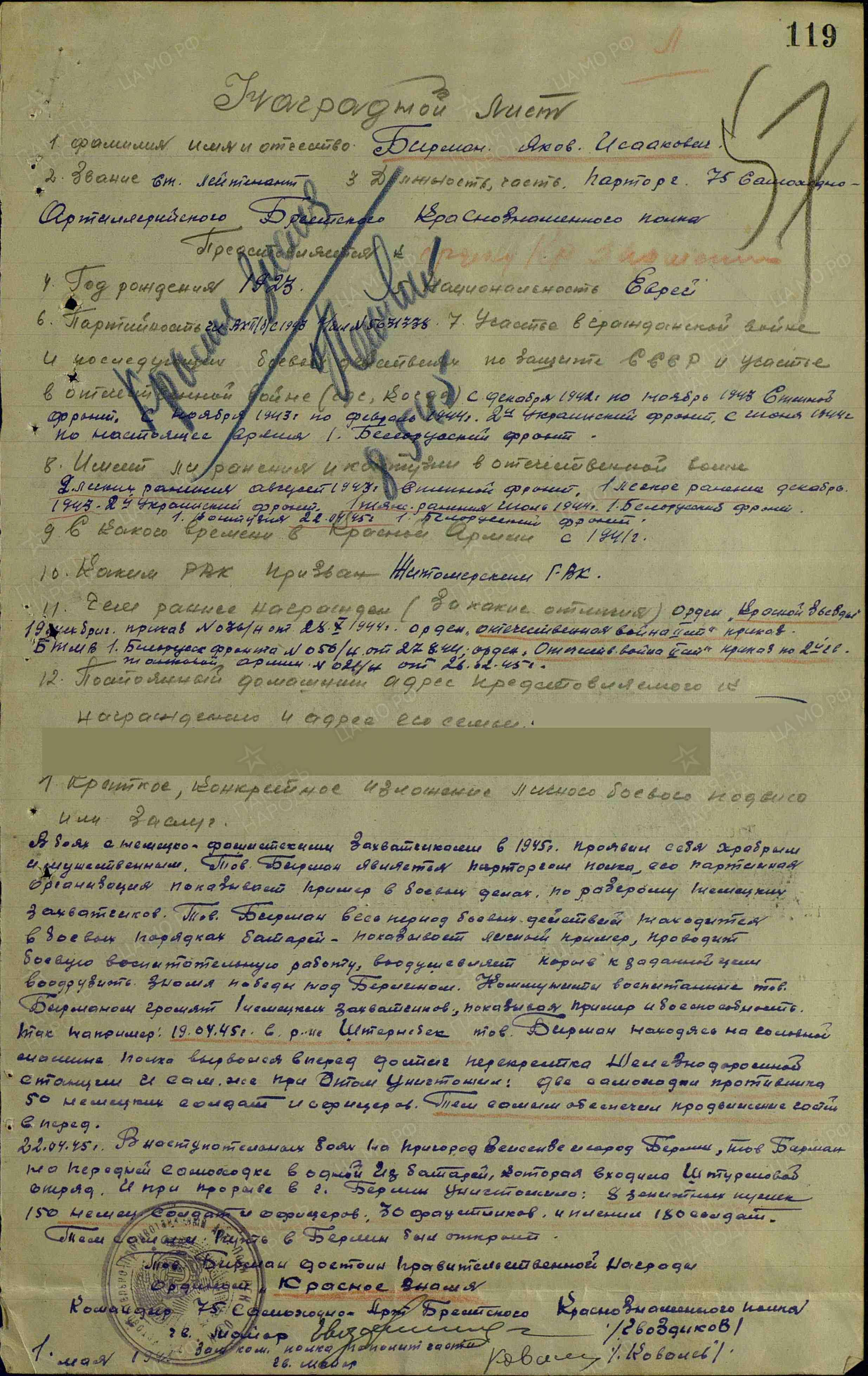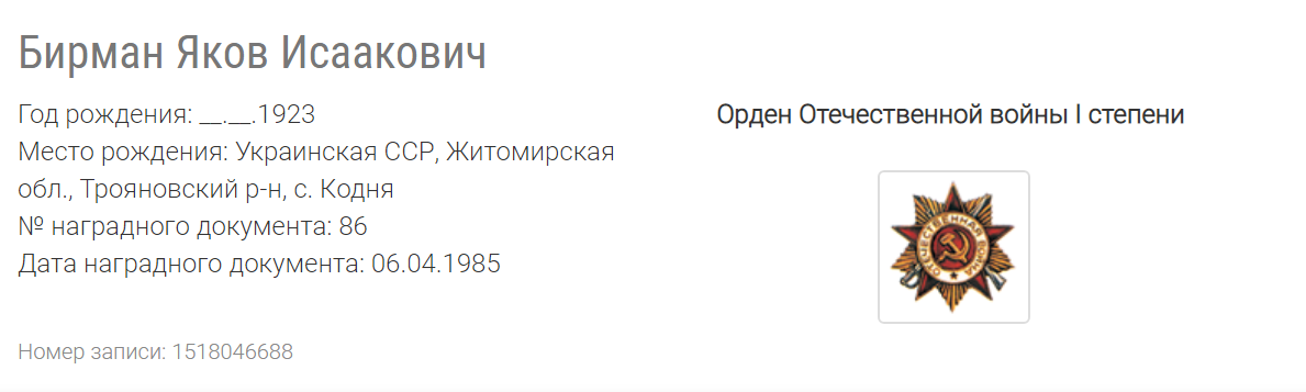 Бирман Яков Исаакович родился в 1923 году в Украинская ССР, Житомирская обл., Трояновский р-н, с. Кодня. Еврей.
