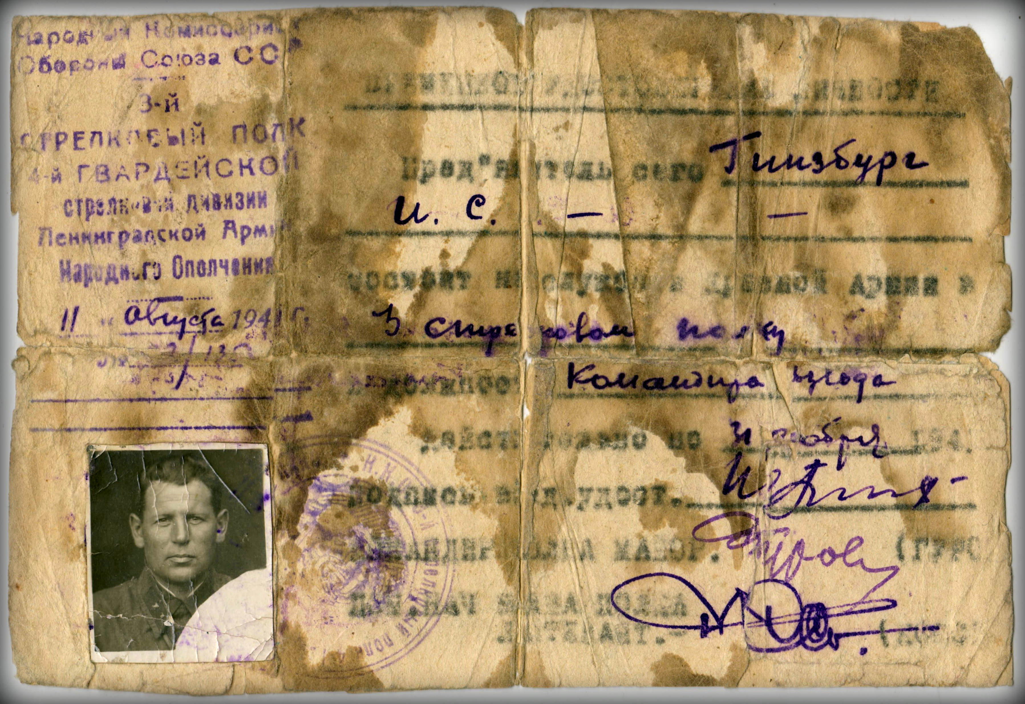 10.07.1941 г. ,имея «бронь», в возрасте 38 лет добровольцем уходит в Народное ополчение на защиту Ленинграда.