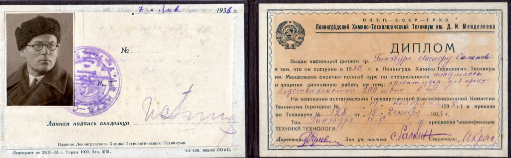 С 1930-1933г.-учеба в Ленинградском химико-технологическом техникуме им. Д.Менделеева. После окончания получает специальность техник-технолог по пластмассам.