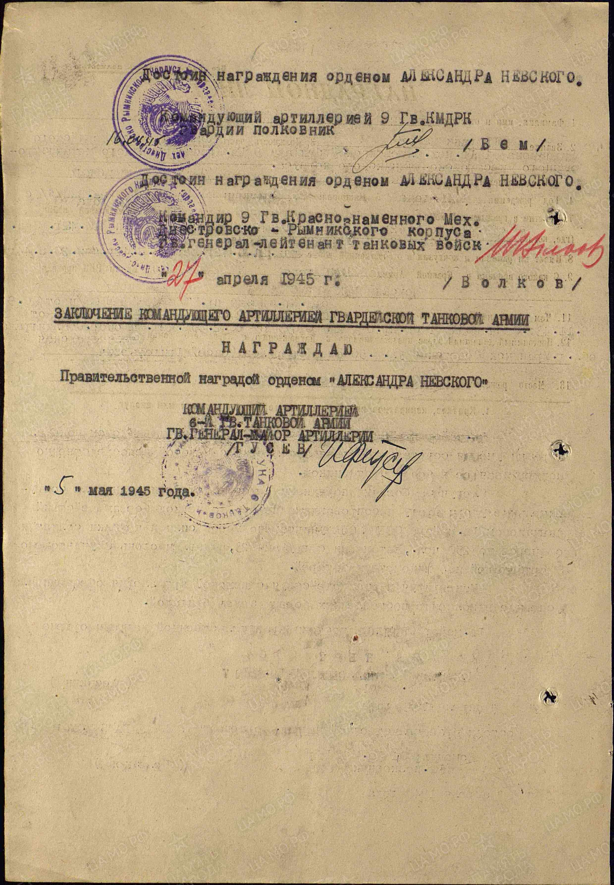-  краткая информация - из списка "Еврейские офицеры Красной Армии, награждённые орденом Александра Невского в 1941 - 1945" ( базовый список 735 имён) - автор Борис Хейфец ( https://clck.ru/NEqdt ); 70 имён, в базовый список, добавил -сотрудник проекта www.jewmil.com  "ВОИНЫ - ЕВРЕИ"  Георгий Койфман.