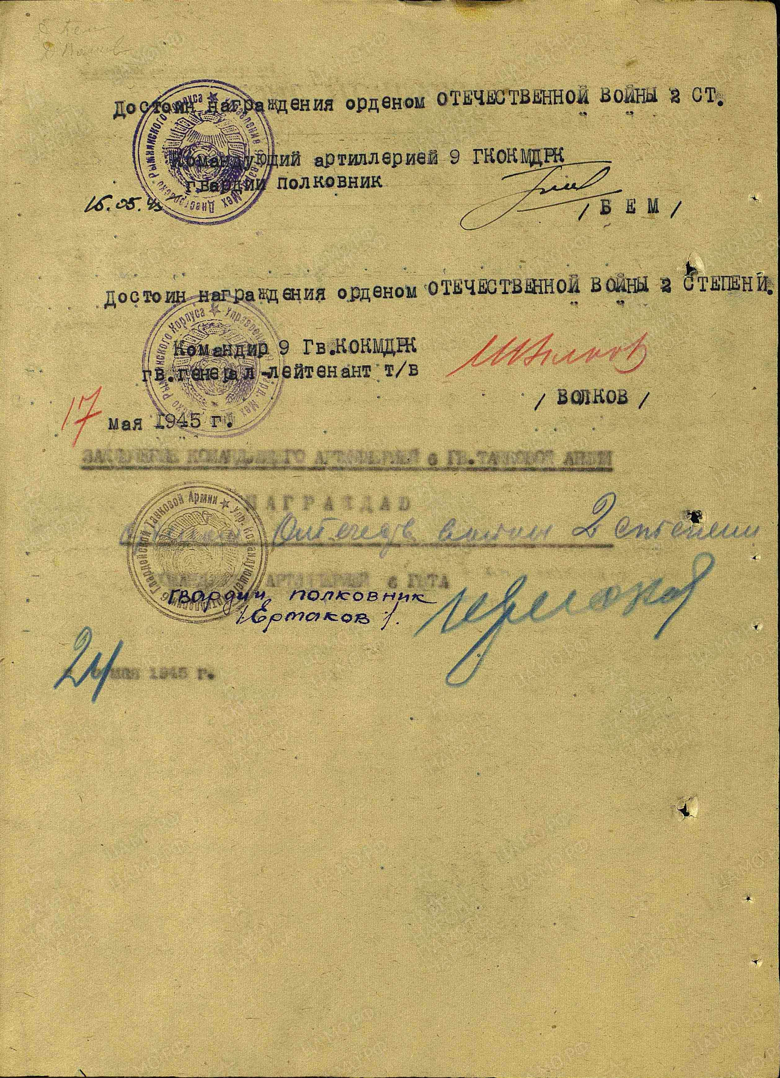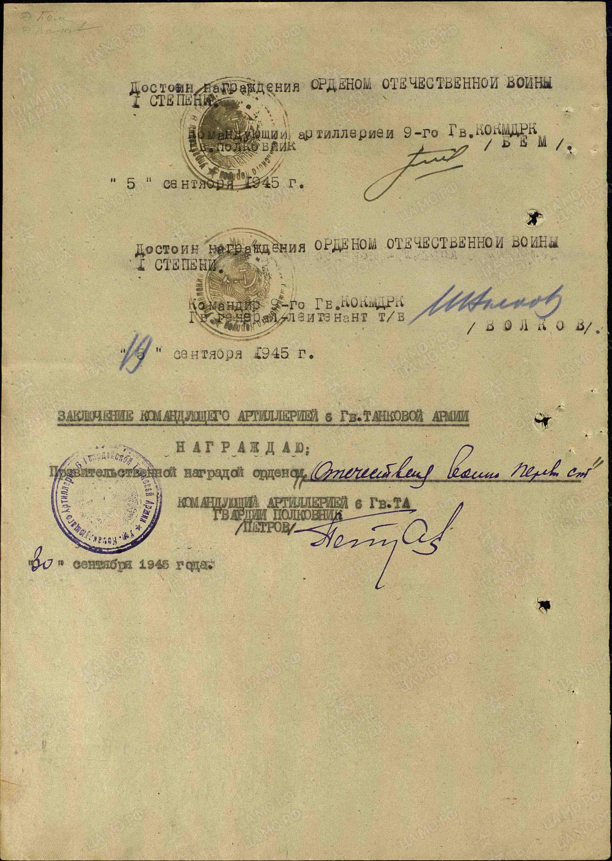Командир артиллерийского дивизиона 31 гвардейской механизированной Плоештинско - Порт-Артурской ордена Богдана Хмельницкого бригады, 9 гвардейского механизированного Днепровско - Рымниковского Краснознамённого корпуса, 6 гвардейской танковой армии, 2 Украинского фронта.