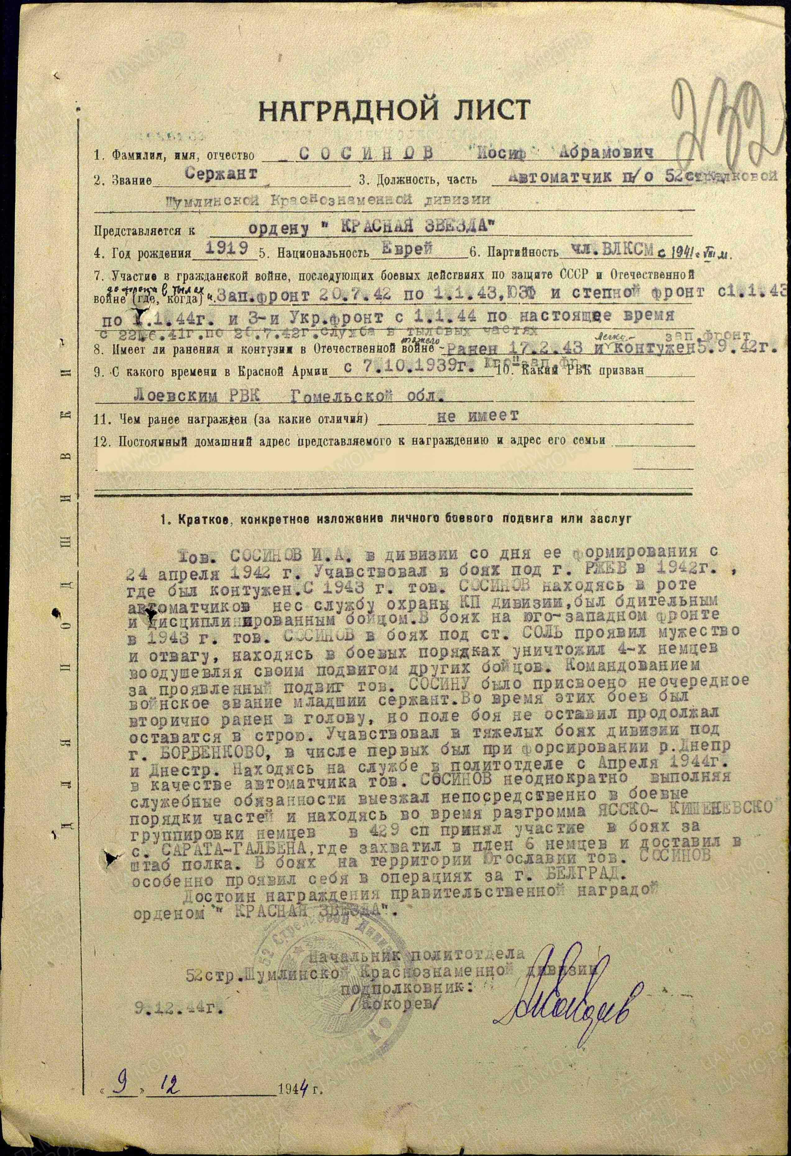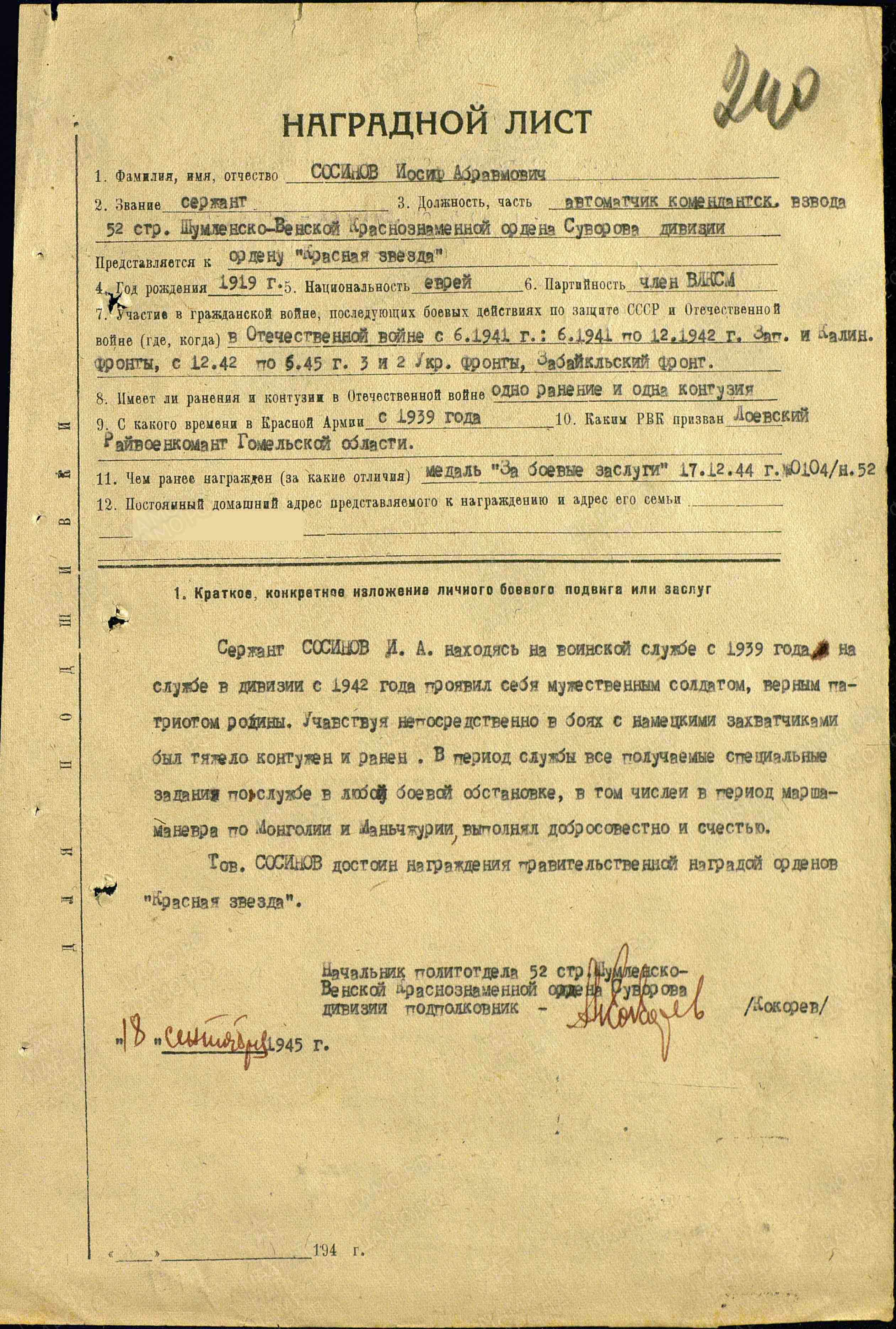 Иосиф Сосинов был призван в Красную Армию Лоевским РВК Гомельской обл. Белоруссии 7.10.1939 г. Учавствовал в боевых действиях , выходил из окружения под гор.Ржев, Смоленской области, прошел с боями всю Европу, учавствовал в разгроме Квантунских войск в Манжурии уже после 9 мая 1945 г. Был контужен 5.9.1942 г., тяжело ранен 17.2.1943 г. За свой ратный труд был награжден орденом "Красной Звезды", медалью "За боевые заслуги", медалями за освобождение и штурмы таких городов как Будапешт, Прага, Вена,Белград, медалями "За победу над Геманией", "За победу над Японией" и рядом других. Сержант Иосиф Сосинов был демобилизован в конце 1945 г. и возвратился в м.Лоев, где узнал о том, что его родители расстреляны фашистами, сестра Ита и брат Борис погибли на фронте, судьба остальных родственников - неизвестна.