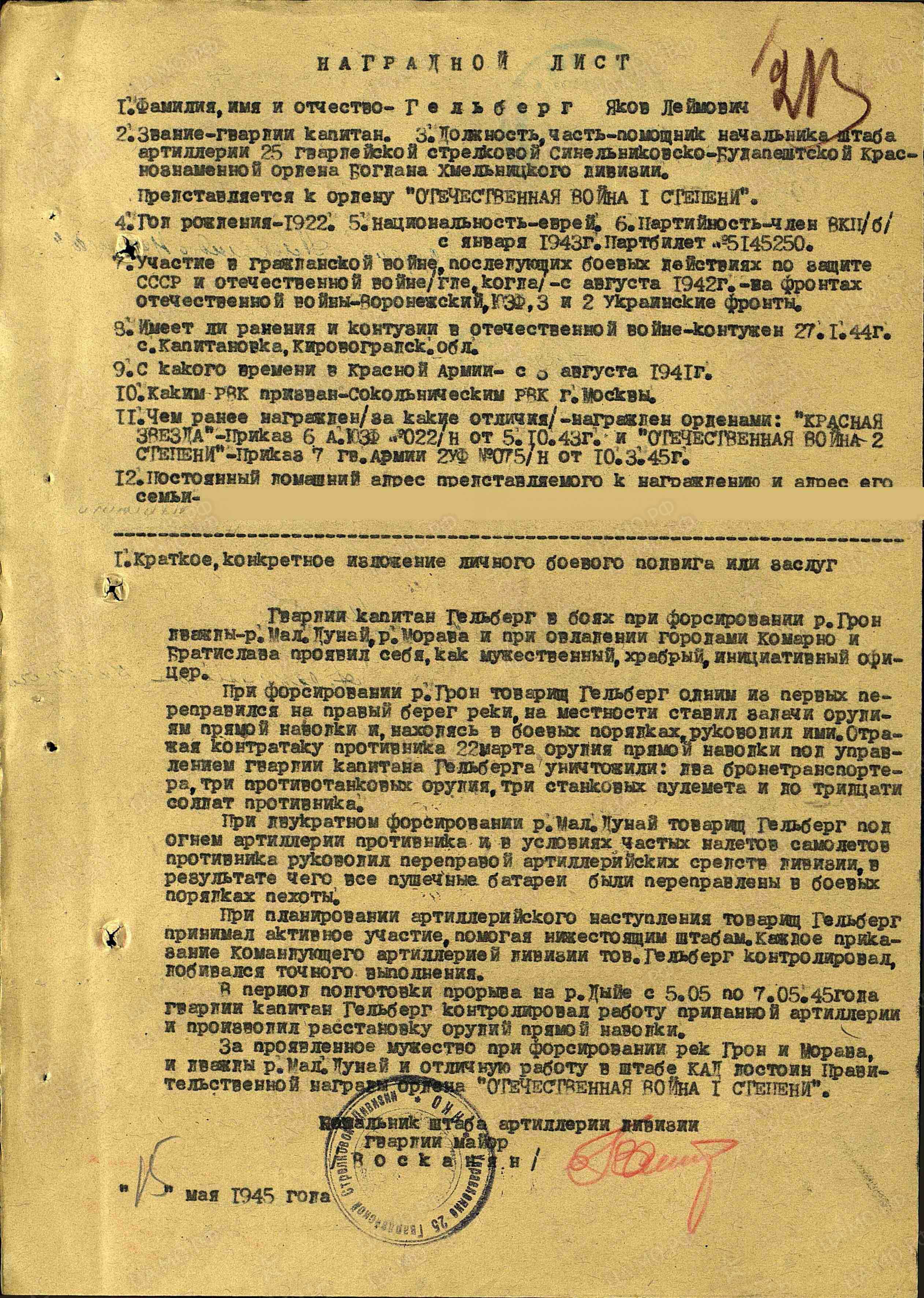При форсировании бурной, многоводной реки Грон, я одним из первых переправился на правый реки, где не только выполнил задачу – переправить и закрепить на правом берегу артиллерию дивизии, но находясь в боевых порядках пехоты, лично уничтожил, часто прямой наводкой из 76 мм орудия технику и живую силу противника. В моём личном деле имеется запись: «Отражая контратаку противника 22 марта 1945 года капитан Гельберг Я.Л вместе с подчинёнными, уничтожил 2 (два) бронетранспортера противника, 3 противотанковых орудия, 3 станковых пулемёта и до 30 солдат противника».