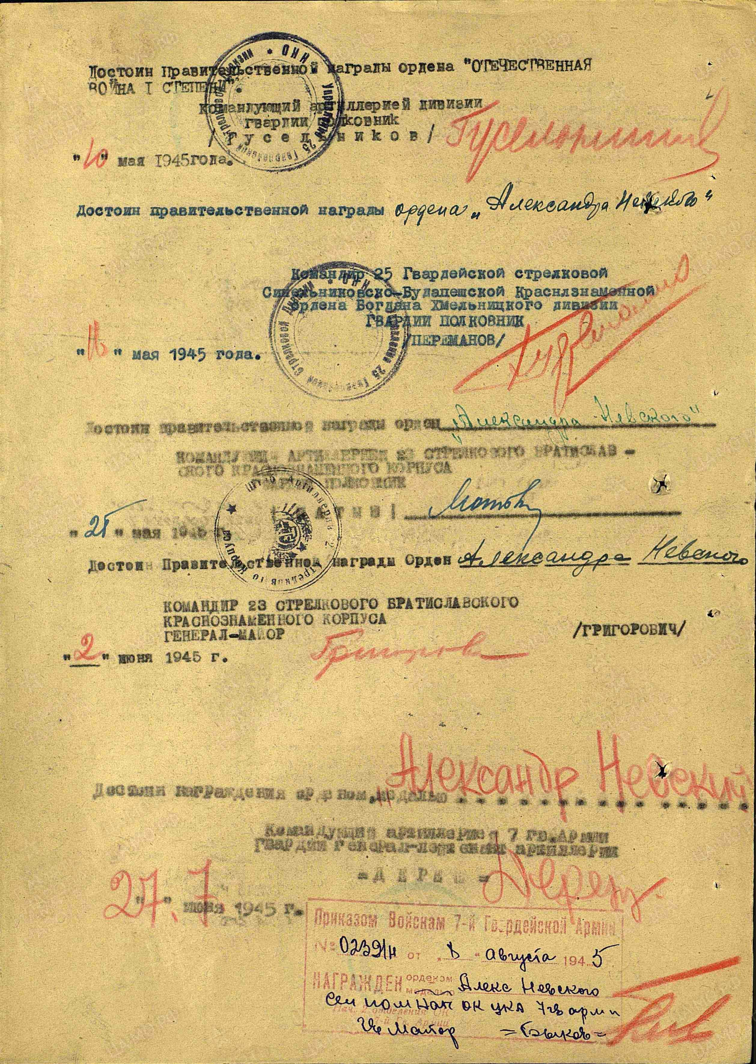 …Моя самая высокая награда – орден «Александра Невского». Награжден за руководство сложной военной операцией при форсировании в Чехословакии реки Грон (быстрой и широкой), а фактически ряда рек.