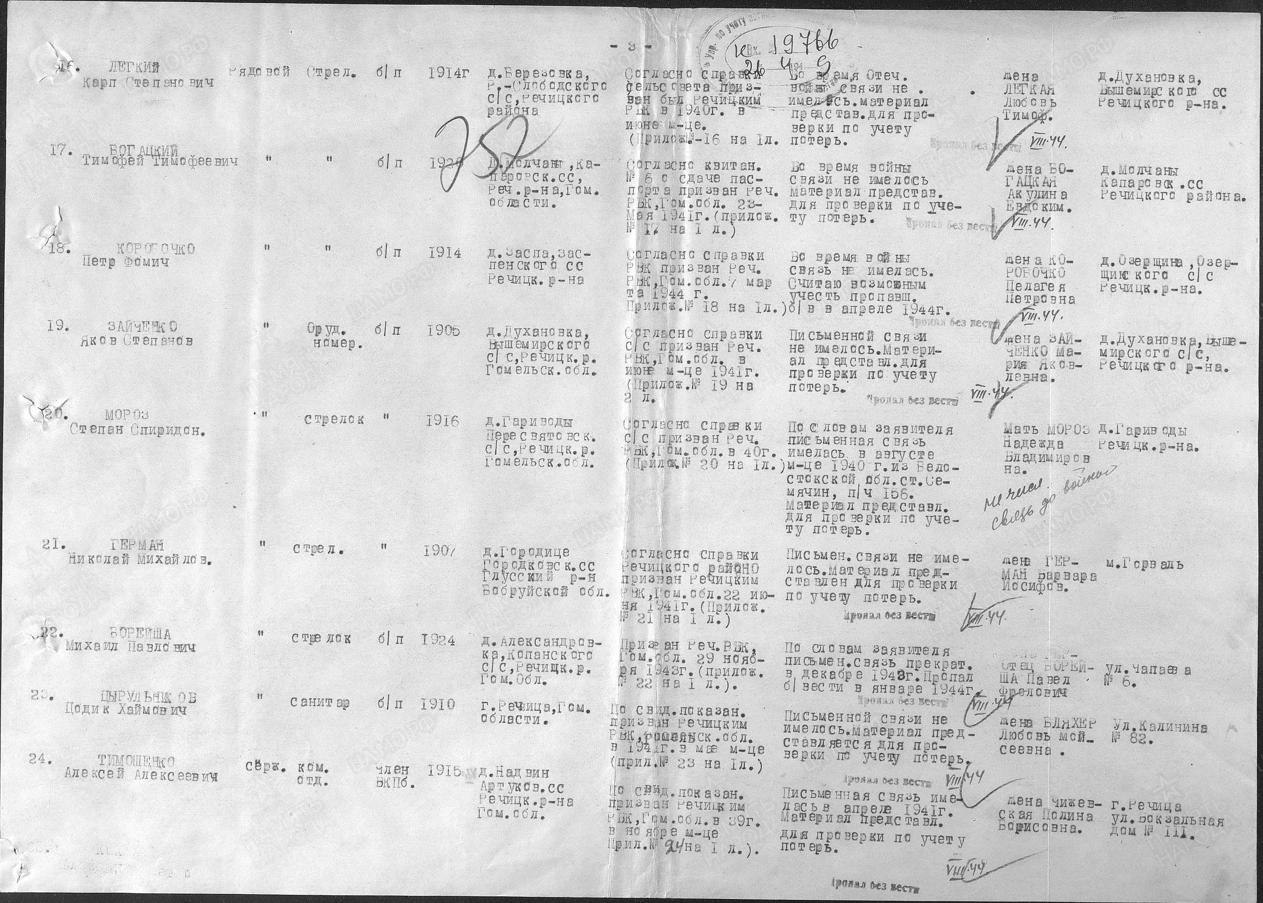 Цырульников Ц. Х. Работал на фабрике X лет Октября, в качестве старшего охранника, с окладом 350 рублей, с 1936 г по 1941 г. Откуда был призван Речицким райвоенкоматом в РККА в мае 1941 года.