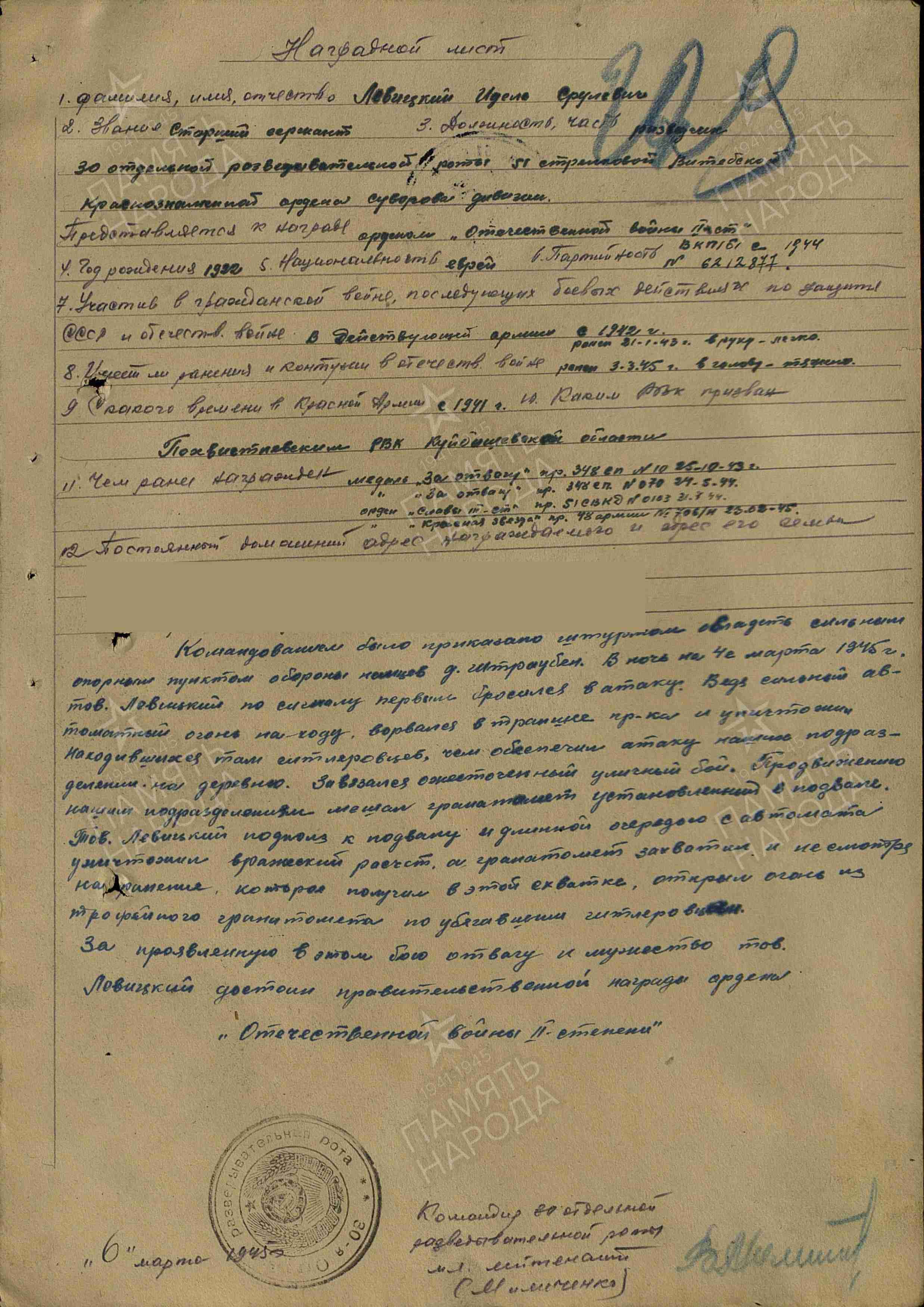 Левицкий Идель СрулевичДата рождения: 20.03.1922Место рождения: Украинская ССР, Измаильская обл., Измаильский р-н, г. ИзмаилДата поступления на службу: 01.11.1941Воинское звание: майор мед. сл.Наименование воинской части: 348 сп 51 сдДата окончания службы: __.11.1945Левицкий Идель СрулевичДата рождения: __.__.1922Место рождения: Украинская ССР, Измаильская обл., г. ИзмаилДата поступления на службу: __.__.1941Воинское звание: ст. сержантЛевицкий Идель СрулевичДокумент в юбилейной картотекеДата рождения: __.__.1922Место рождения: Украинская ССР, Одесская обл., г. ИзмаилНаименование награды: Орден Отечественной войны I степениНомер документа: 81Дата документа: 06.04.1985Автор документа: Министр обороны СССРПриложение:1. 51 стрелковая Витебская Краснознамённая ордена Суворова дивизия (ВИКИПЕДИЯ: https://clck.ru/UdzLH );2. Земландская группа войск (ВИКИПЕДИЯ: https://clck.ru/UdzbU ).