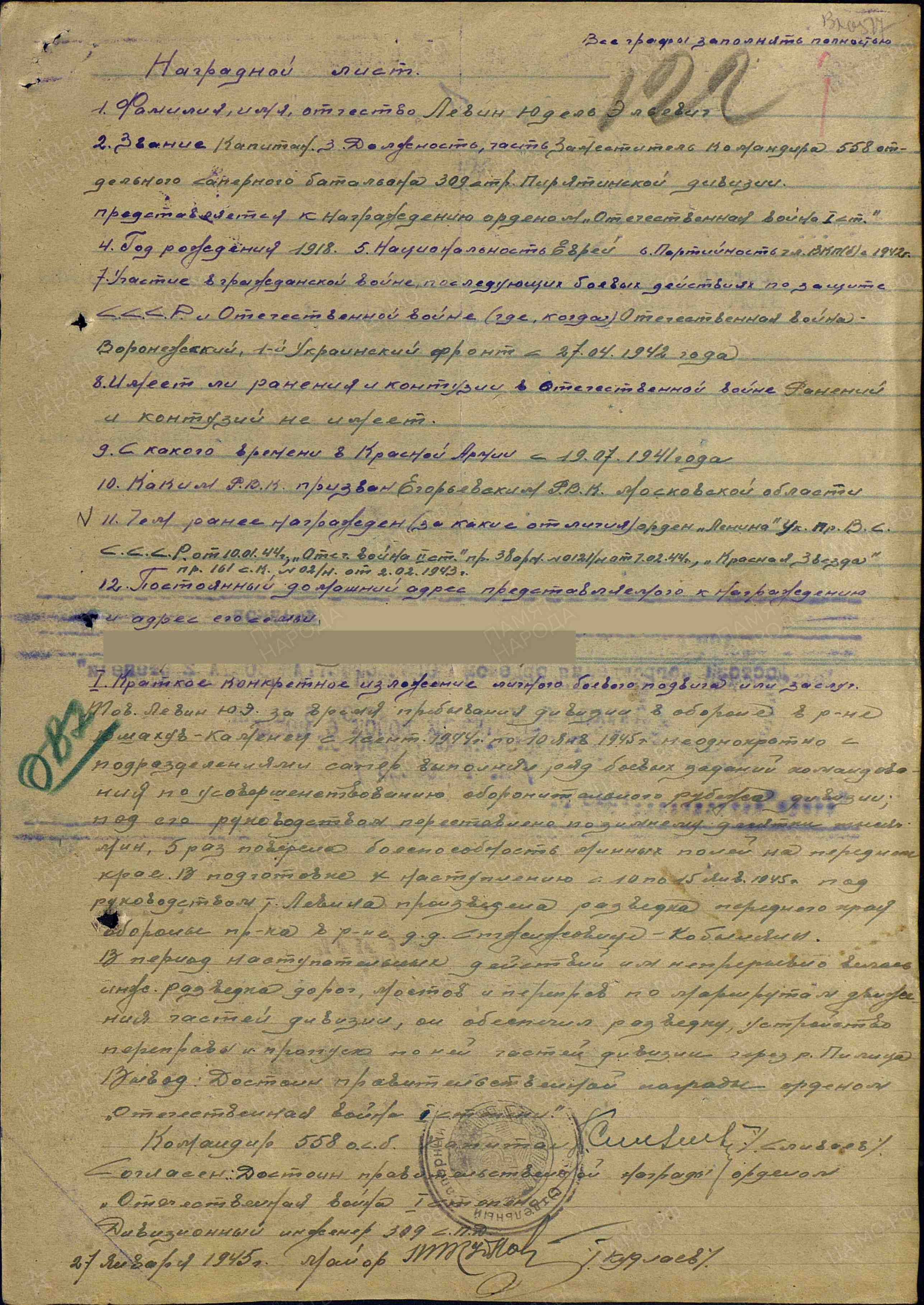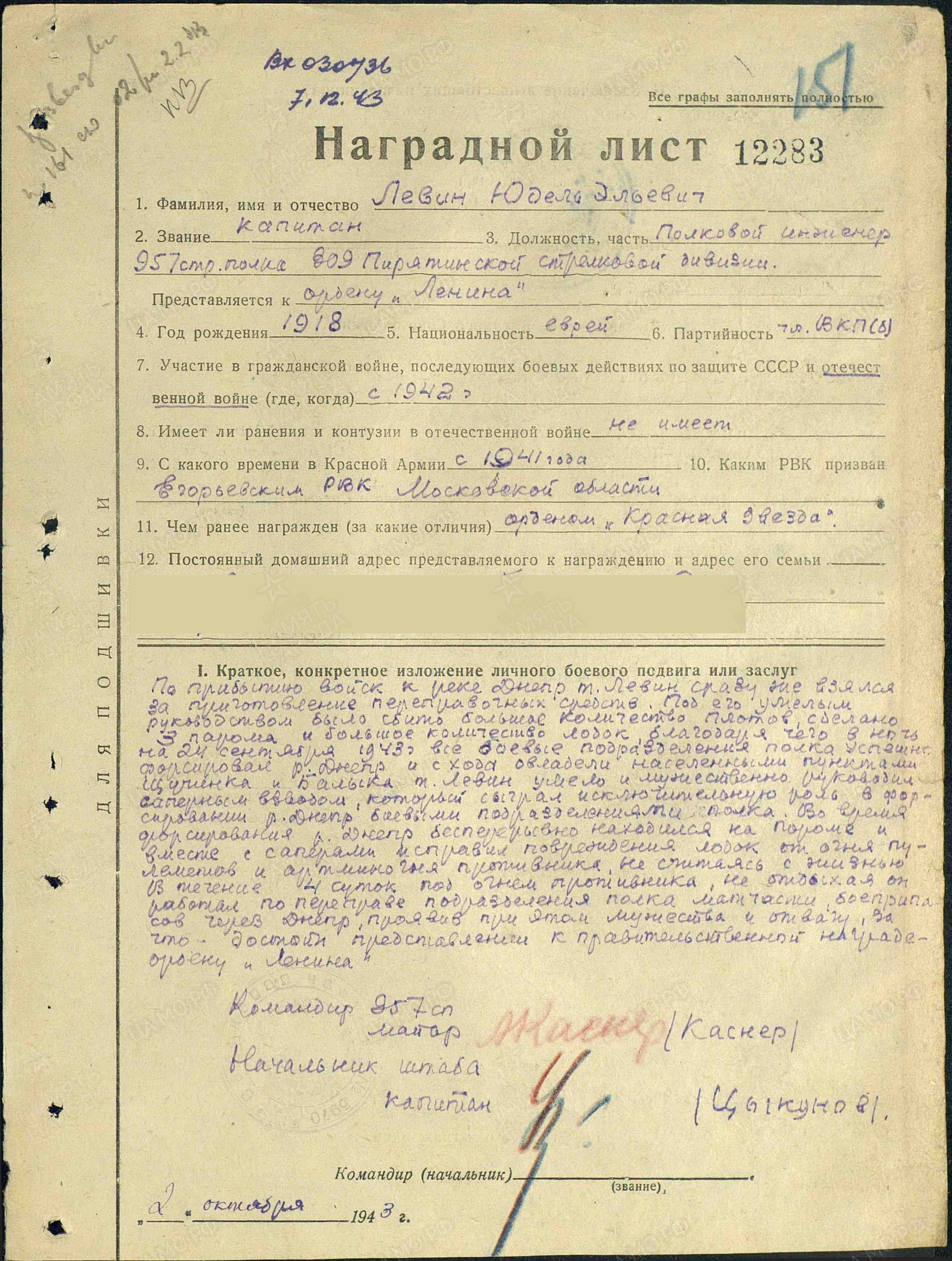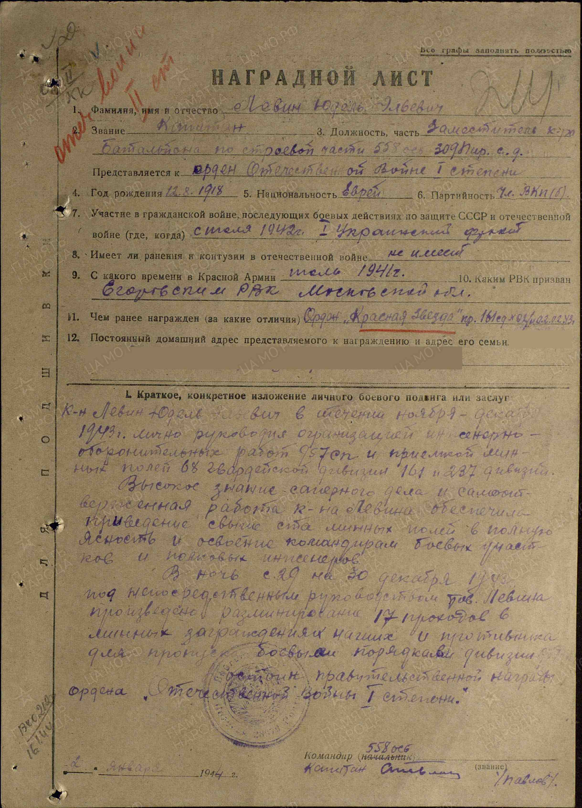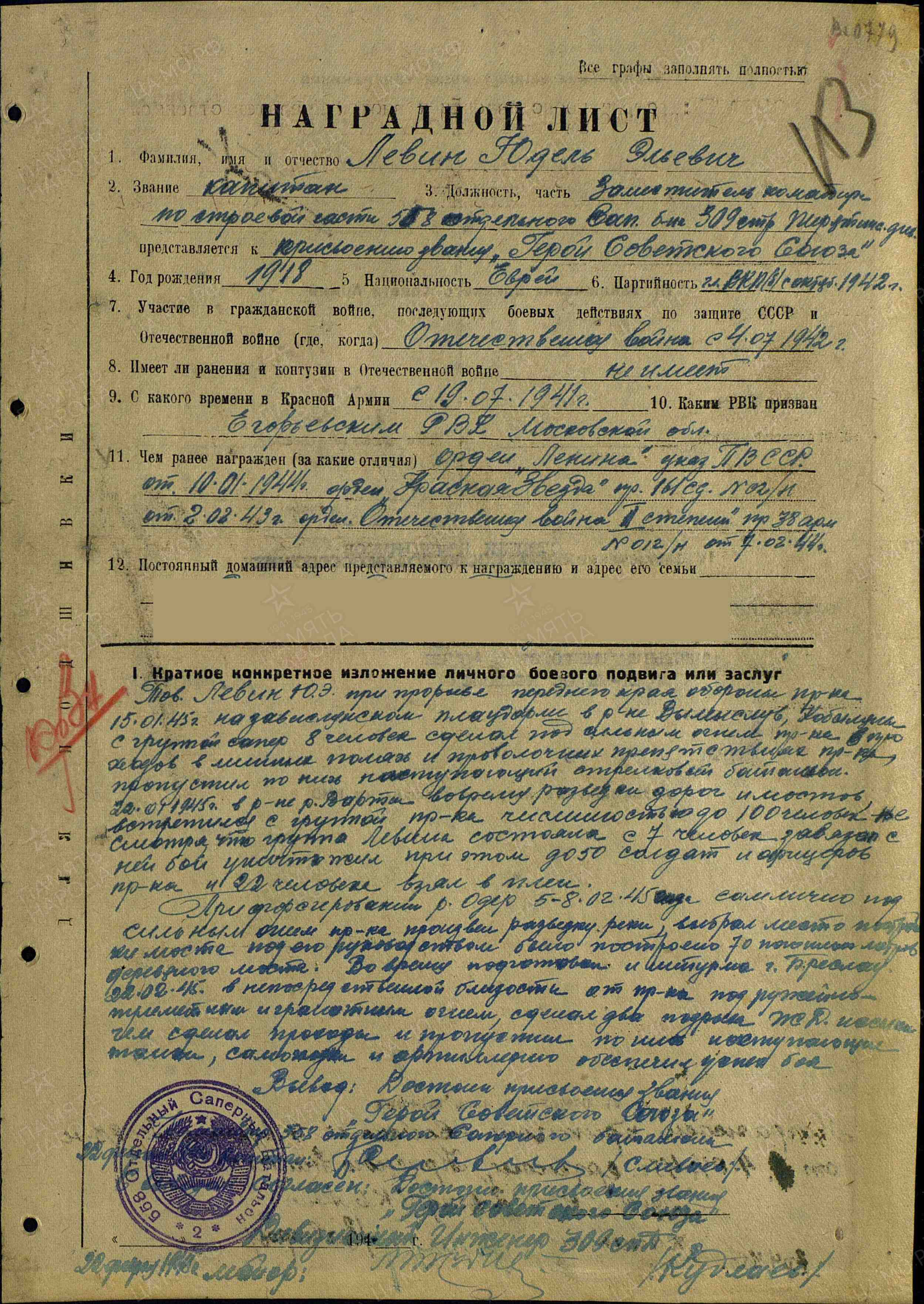 Капитан ЛЕВИН ЮДЕЛЬ ЭЛЬЕВИЧ, 12.08.1918 года рождения, место рождения - Белорусская ССР, Полесская область, Паричский район, местечко Ковшицы (в н.вр.: Гомельская область, Светлогорский район, Паричский сельский совет, село Паричи), еврей. В РККА призван Паричским РВК, 19. 07.1941 года. В Великой Отечественной войне с 4.07.1942 года (на Воронежском, 1 Украинском фронтах) в должности (последняя, 1945 год): Заместителя по строевой части командира 558 отдельного сапёрного батальона, 309 стрелковой Пирятинской Краснознамённой ордена Кутузова дивизии, 22 стрелкового корпуса, 6 армии, 1 Украинского фронта. Ранения: нет. Боевые награды: 1. Ордена: "ЛЕНИНА" (1944), "КРАСНОГО ЗНАМЕНИ" (1945: НАГРАДНОЙ ЛИСТ на звание "ГЕРОЙ СОВЕТСКОГО СОЮЗА"), "ОТЕЧЕСТВЕННОЙ ВОЙНЫ" 1 (1985) и 2 (1944: НАГРАДНОЙ ЛИСТ на орден "ОТЕЧЕСТВЕННОЙ ВОЙНЫ" 1 СТЕПЕНИ; 1945: НАГРАДНОЙ ЛИСТ на "ОРДЕН ОТЕЧЕСТВЕННОЙ ВОЙНЫ! 1 СТЕПЕНИ) СТЕПЕНЕЙ, "КРАСНОЙ ЗВЕЗДЫ" (1943); 2. Медаль "ЗА ПОБЕДУ НАД ГЕРМАНИЕЙ В ВЕЛИКОЙ ОТЕЧЕСТВЕННОЙ ВОЙНЕ 1941 - 1945 ГГ." с ЭЛЕКТРОННЫЙ ДОКУМЕНТОВ «ПОДВИГ НАРОДА В ВЕЛИКОЙ ОТЕЧЕСТВЕННОЙ 1941-1945 ГГ.» http://podvignaroda.ru/?#tab=navHome. Тяжело ранен, в уличном бою, за г. Бреслау (в н.вр. Вроцлав), Польша. Вернулся с Великой Отечественной войны инвалидом, без ноги. Послевоенная судьба: неизвестна. Вечная Слава и Память!
