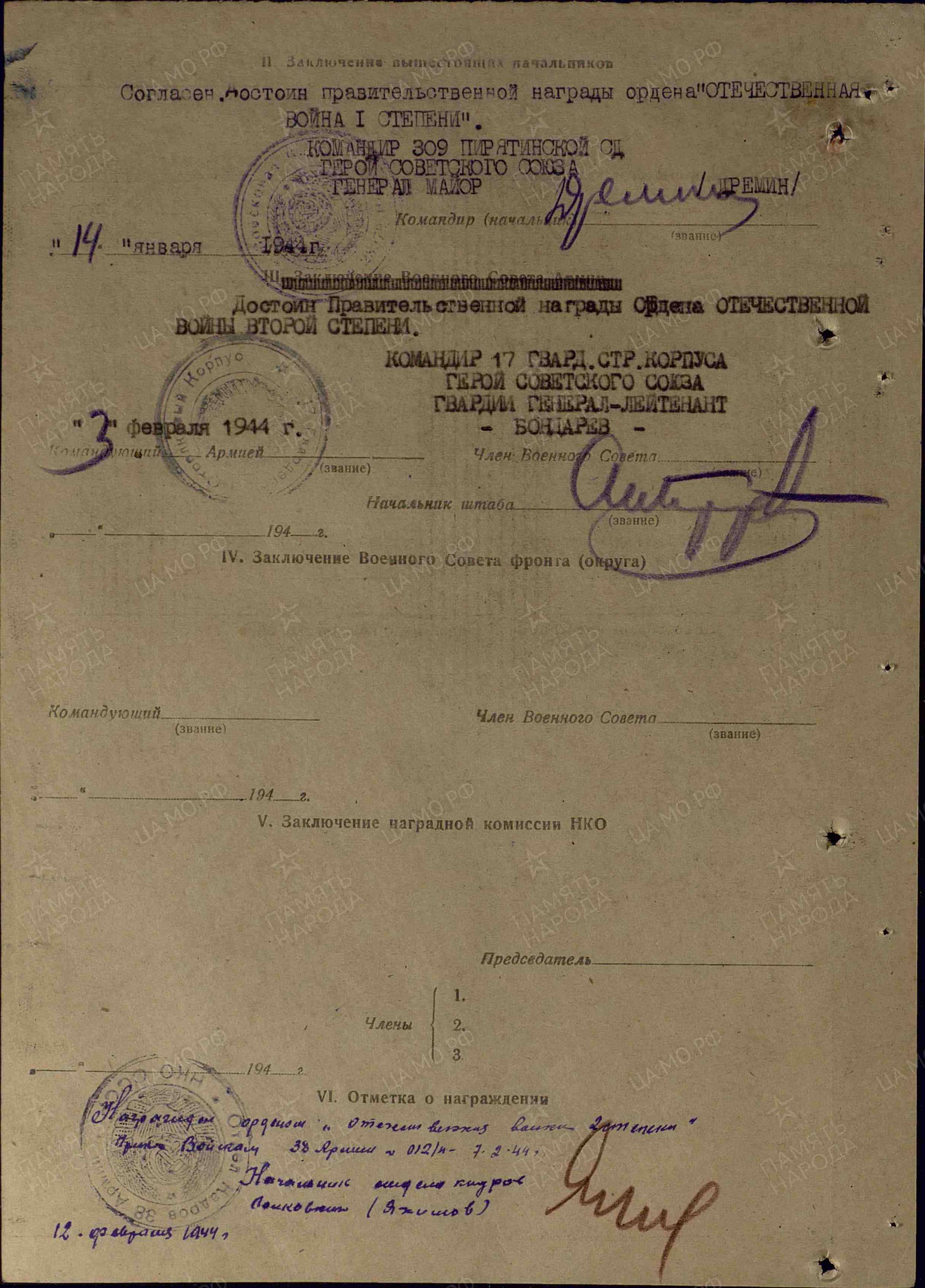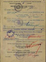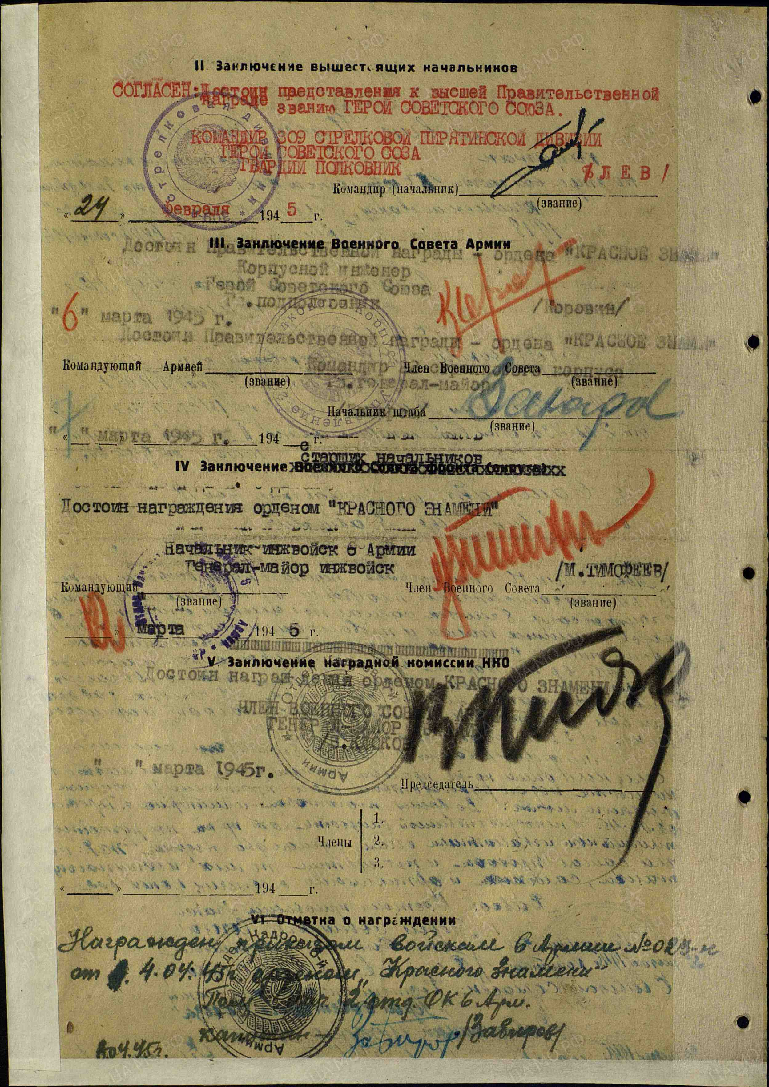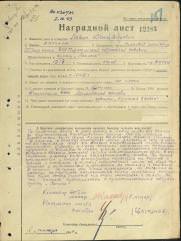 02.02.1943 Орден Красной Звезды 10.01.1944 Орден Ленина 07.02.1944 Орден Отечественной войны II степени 21.03.1945 Орден Отечественной войны II степени 04.04.1945 Орден Красного Знамени -