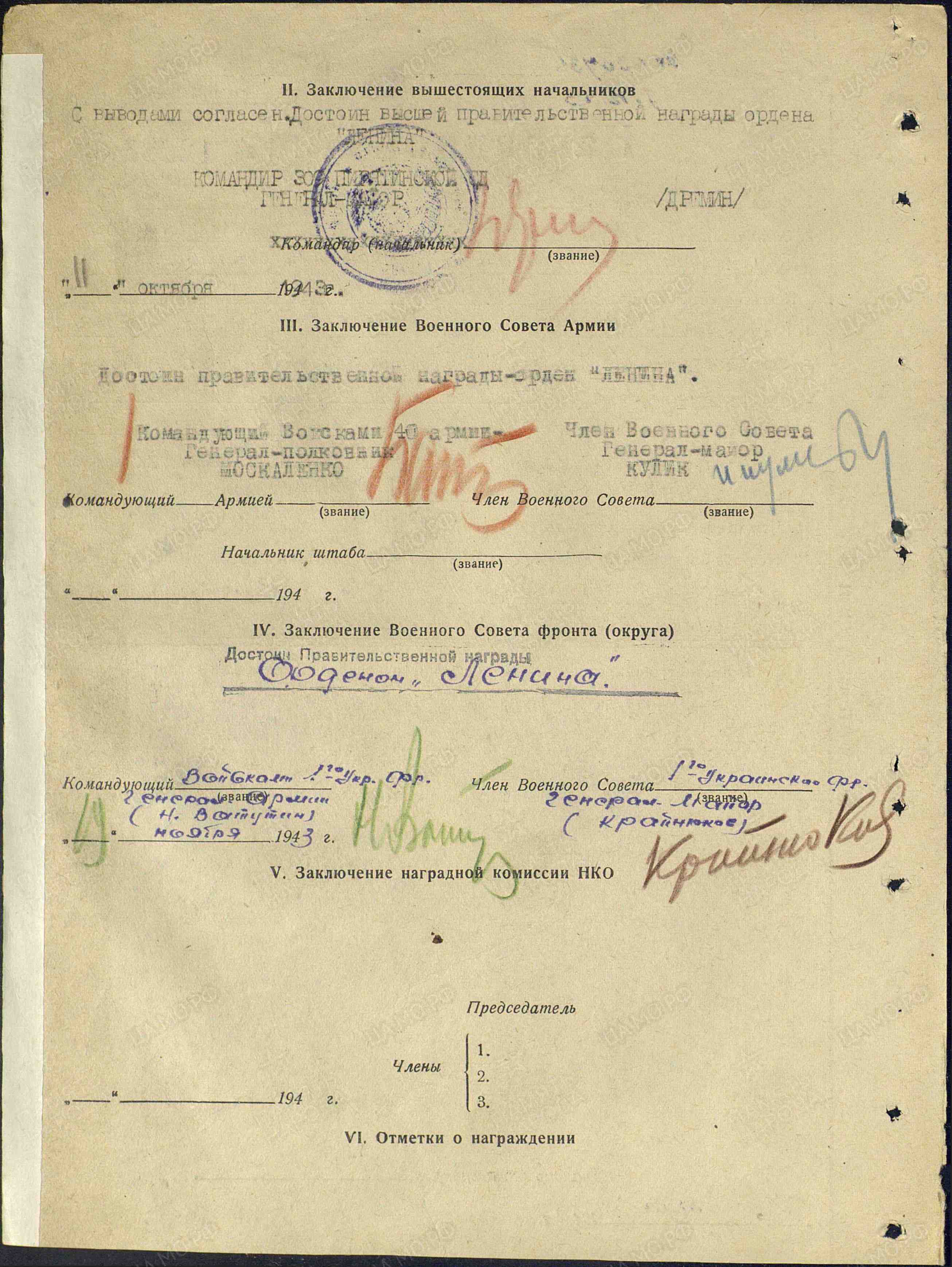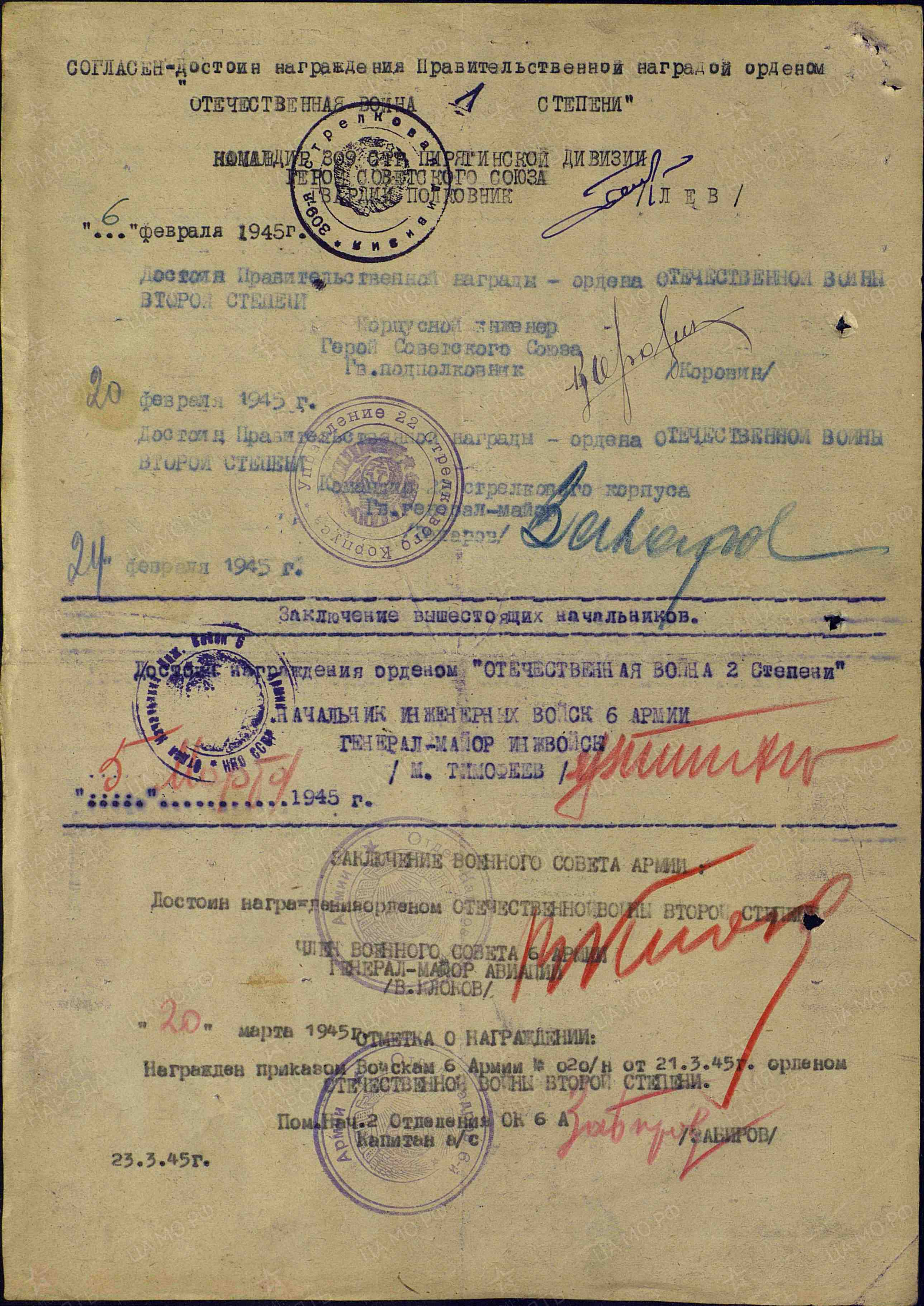 Заместитель по строевой части командира 558 отдельного сапёрного батальона, 309 стрелковой Пирятинской Краснознамённой ордена Кутузова дивизии, 22 стрелкового корпуса, 6 армии, 1 Украинского фронта (1945).