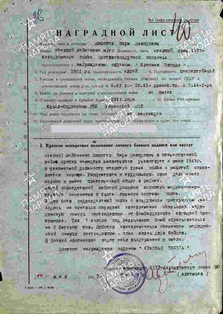 В армии остался и в последующие годы. После войны женился на военвраче старшем лейтенанте медицинской службы Суник Ревекке Исааковне, с которой служил и работал в 1577-ом зенитно-артиллерийском полку 2-ой Воздушной Армии ВВС. Имеют двух дочерей. Уволен в запас 20 июля 1953 году, в звании гвардии подполковника медицинской службы. Три года спустя Н. Д. Либстер возглавил одну из городских клинических больниц в Грозном. Главным врачом он проработал там до 1981 года, а затем еще 13 лет заведовал отделением. За большой вклад в развитие здравоохранения 7 июня 1978 года Науму Давидовичу присвоено звание заслуженного врача Чечено-Ингушской республики. С 1994 года он на пенсии и жил в Краснодаре.