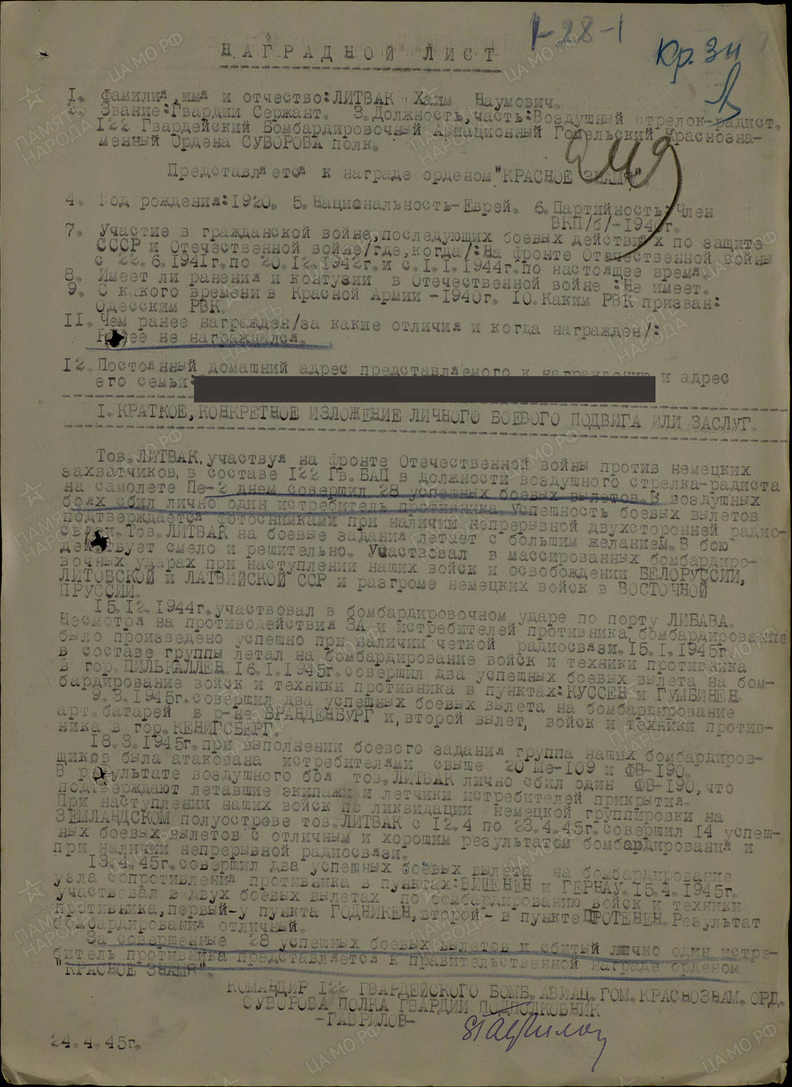 Из НАГРАДНОГО ЛИСТА на орден "КРАСНОГО ЗНАМЕНИ": "Тов. ЛИТВАК участвуя на фронте Отечественной войны против немецких захватчиков, в составе 122 гвардейского бап в должности воздушного стрелка-радиста, на самолете Пе-2 совершил  28 успешных вылетов. В воздушных боях сбил лично один истребитель противника. Успешность боевых вылетов подтверждается фотоснимками при наличии непрерывной двухсторонней радиосвязи.