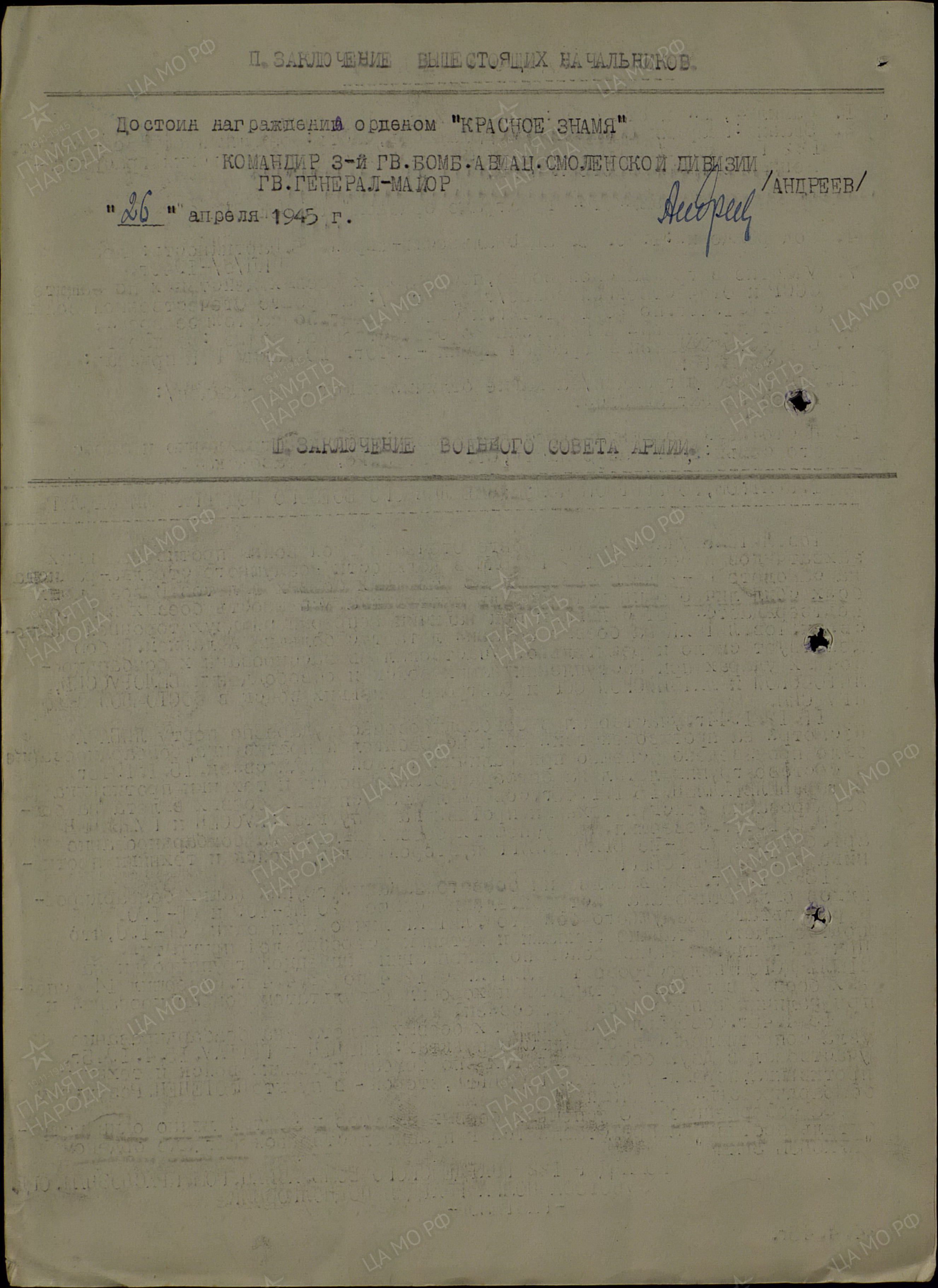 15.04.1945 года участвовал в двух боевых вылетах по бомбардированию войск и техники противника, первый – у пункта Годникен, второй – в пункет Протенен. Результат бомбардирования отличный. За совершенные 28 успешных боевых вылетов и сбитый лично один истребитель противника представляется к правительственной награде ордену "КРАСНОЕ ЗНАМЯ". Командир 122 гвардейского бомбардировочного авиационного Гомельского Краснознамённого ордена Суворова полка Гвардии подполковник ГАВРИЛОВ.