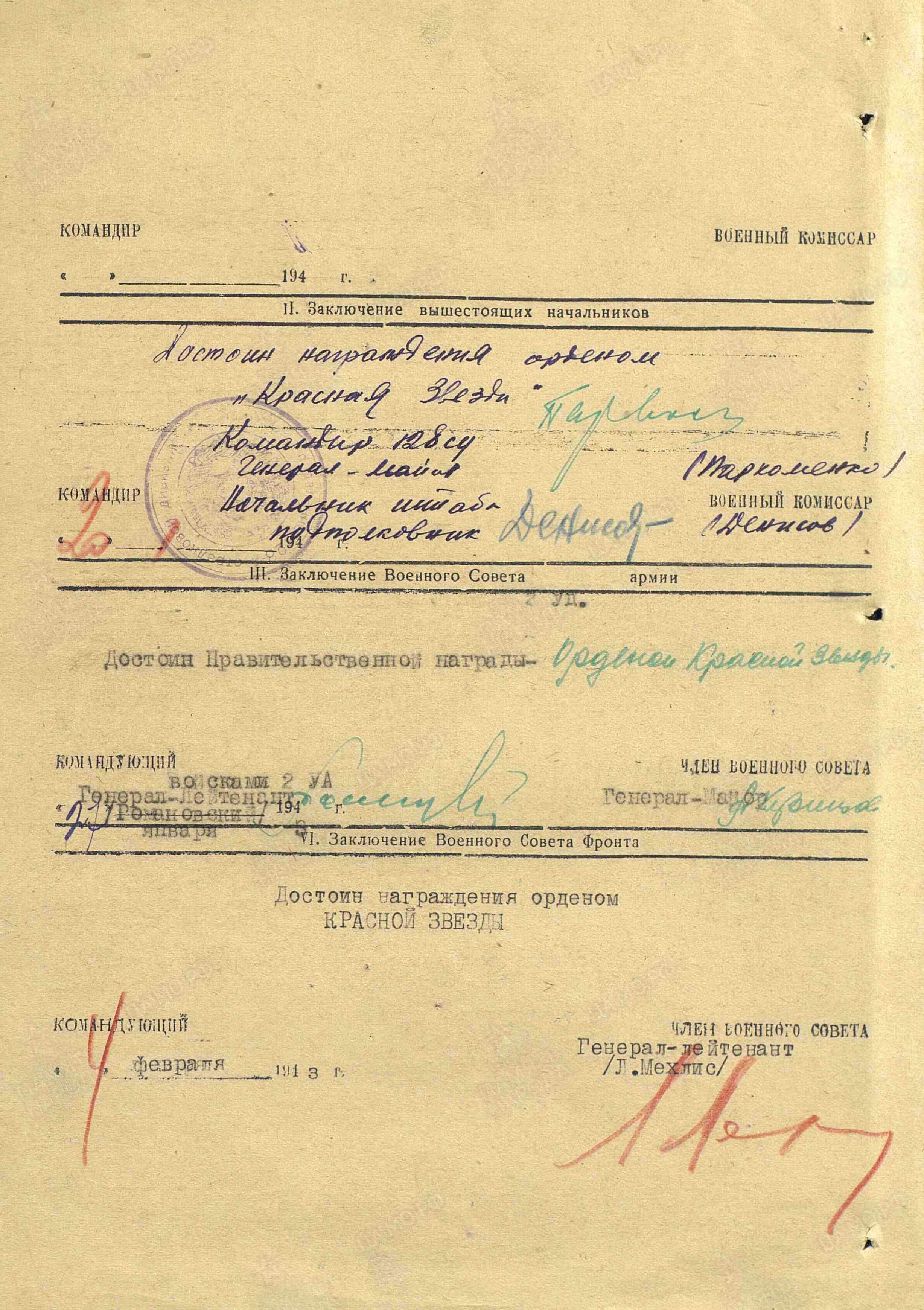 Начальника штаба артиллерии 128 стрелковой Псковской Краснознамённой дивизии, 2 Ударной Армии.