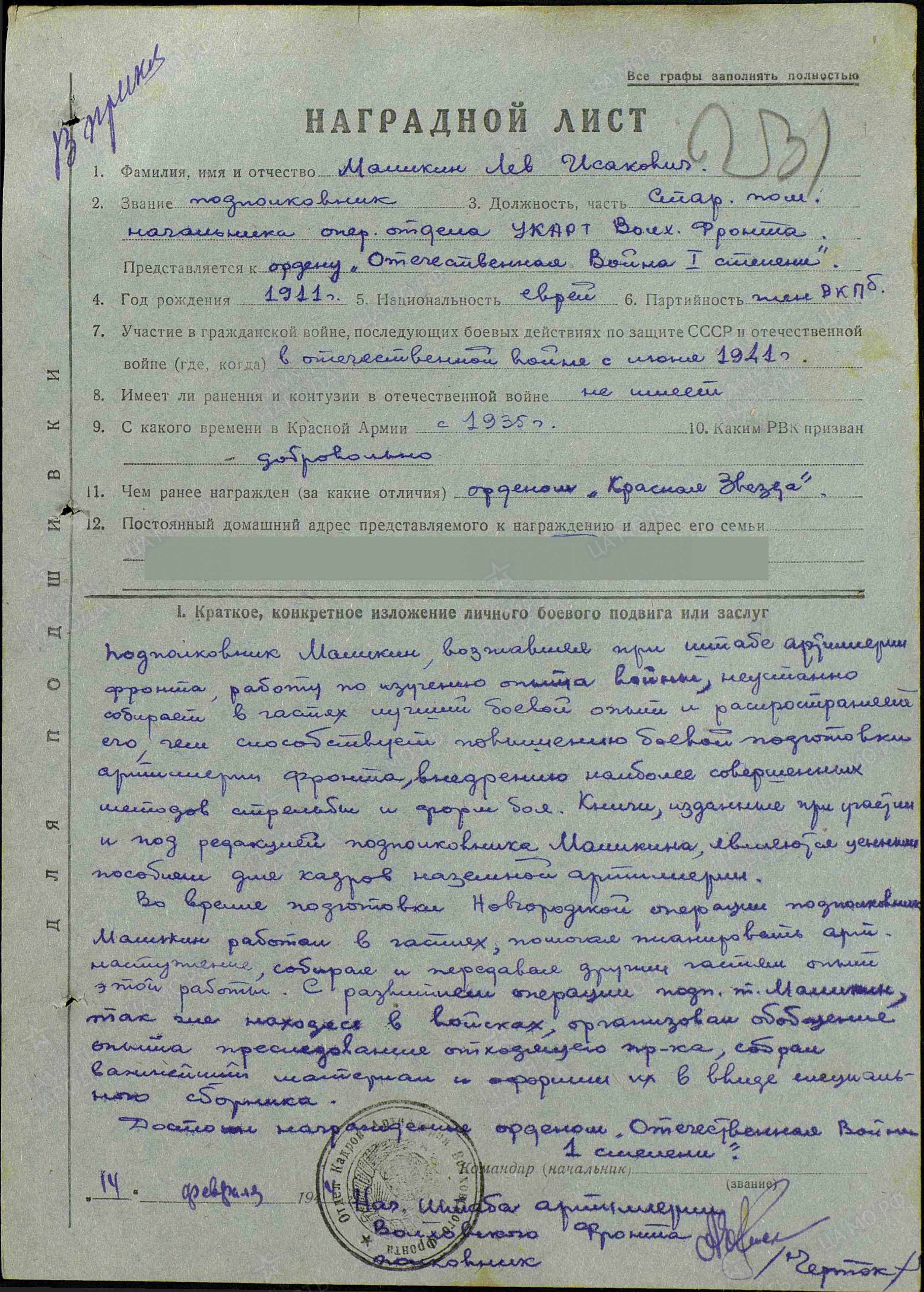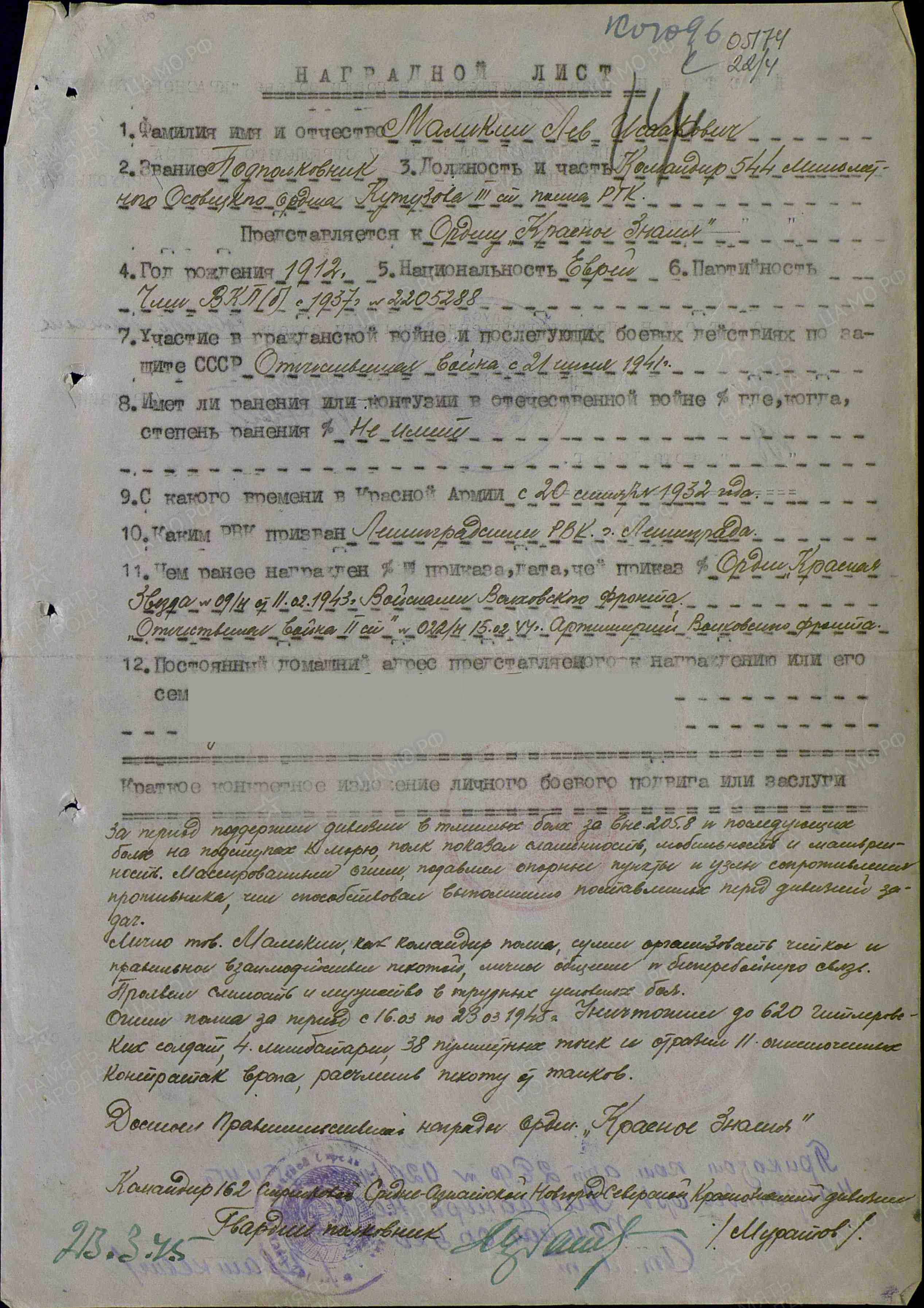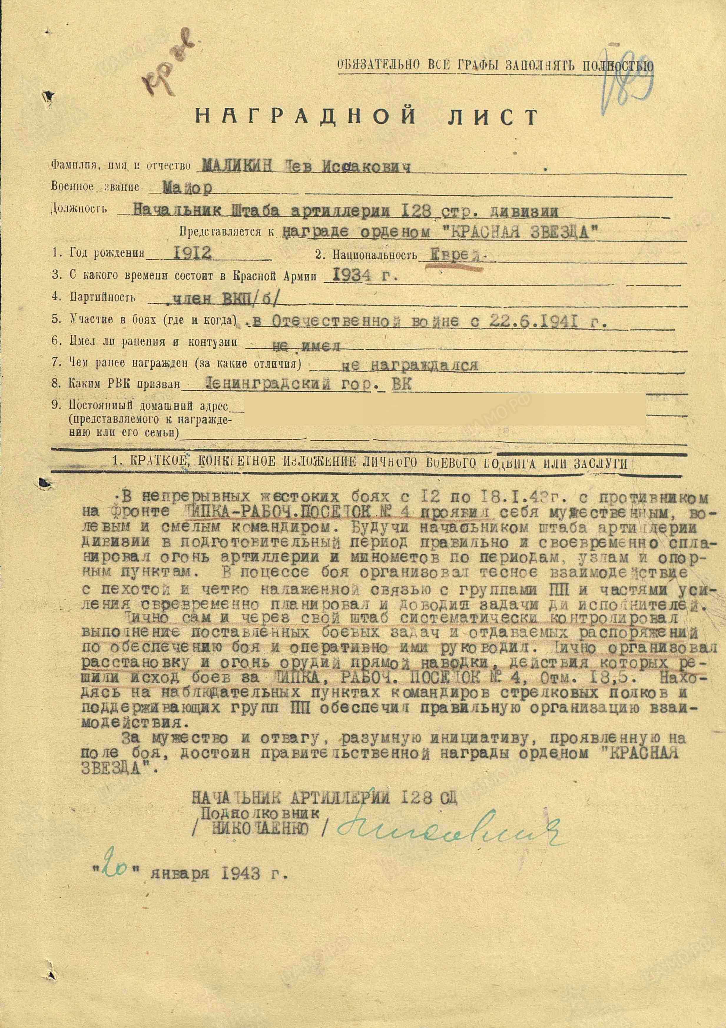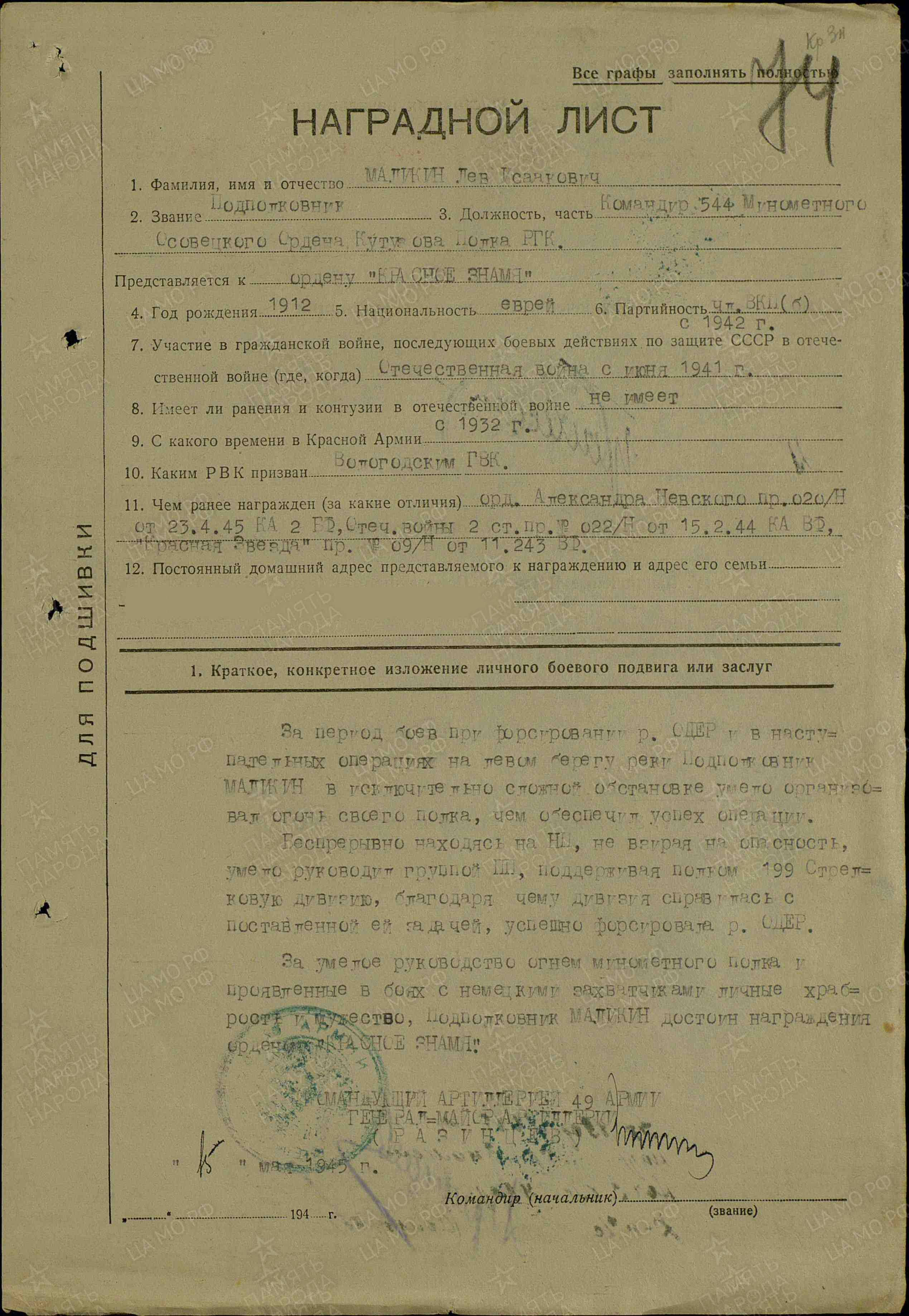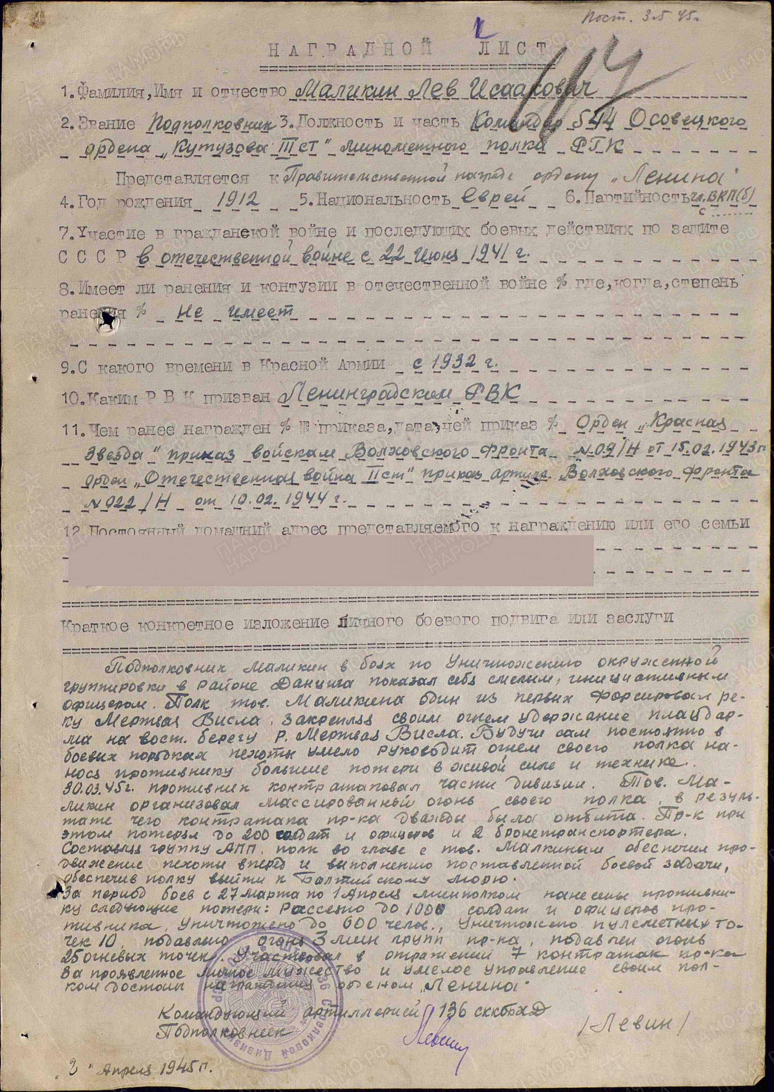 Подполковник МАЛИКИН ЛЕВ ИСААКОВИЧ, 2.07.1912 года рождения, место рождения - Российская Империя, Могилёвская губерния, Гомельский уезд, Речицкая волость, волостной город Речица (по административному делению СССР: Белорусская ССР, Гомельская область, Речицкий район, г. Речица), еврей. В РККА призван Ленинградским ГВК, г. Ленинграда, Ленинградской области, РСФСР, 05.09.1934 года.  В Великой Отечественной войне с 22.06.1941 года (на Волховском, 2 Белорусском фронтах), в должностях: 1. Начальника штаба артиллерии 128 стрелковой Псковской Краснознамённой дивизии, 2 Ударной Армии; 2. Старшего помощника начальника оперативного отдела Управления Коммандующего артиллерией, Волховского фронта; 3. Командира(последняя) 544 минометного Осовецкого ордена Кутузова 3 степени полка РГК, 49 Армии, 2 Белорусского фронта. Ранения: нет. Боевые награды: 1. Орден "КРАСНОЙ ЗВЕЗДЫ"(№ записи: 150341212);2. Орден "ОТЕЧЕСТВЕННОЙ ВОЙНЫ" 2 степени(№ записи: 21879931); 3 Орден "КРАСНОГО ЗНАМЕНИ"(№ записи: 22175452); 4. Орден "КРАСНОГО ЗНАМЕНИ"(Из НАГРАДНОГО ЛИСТА: "
