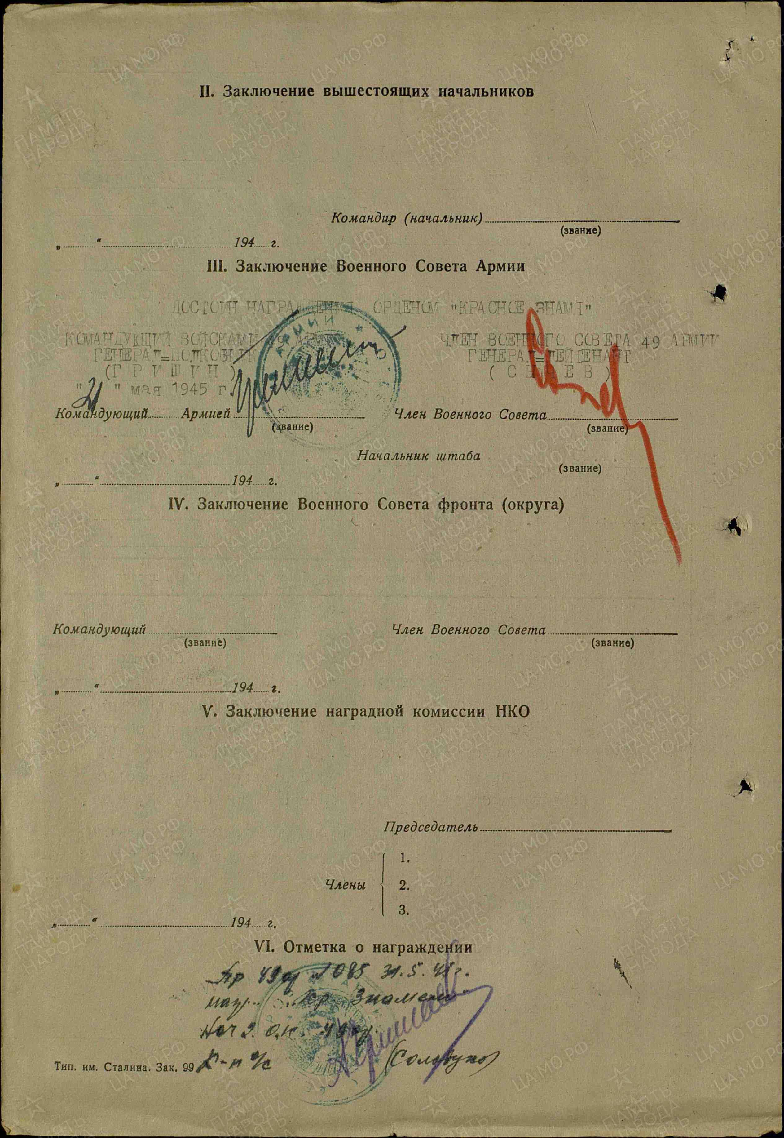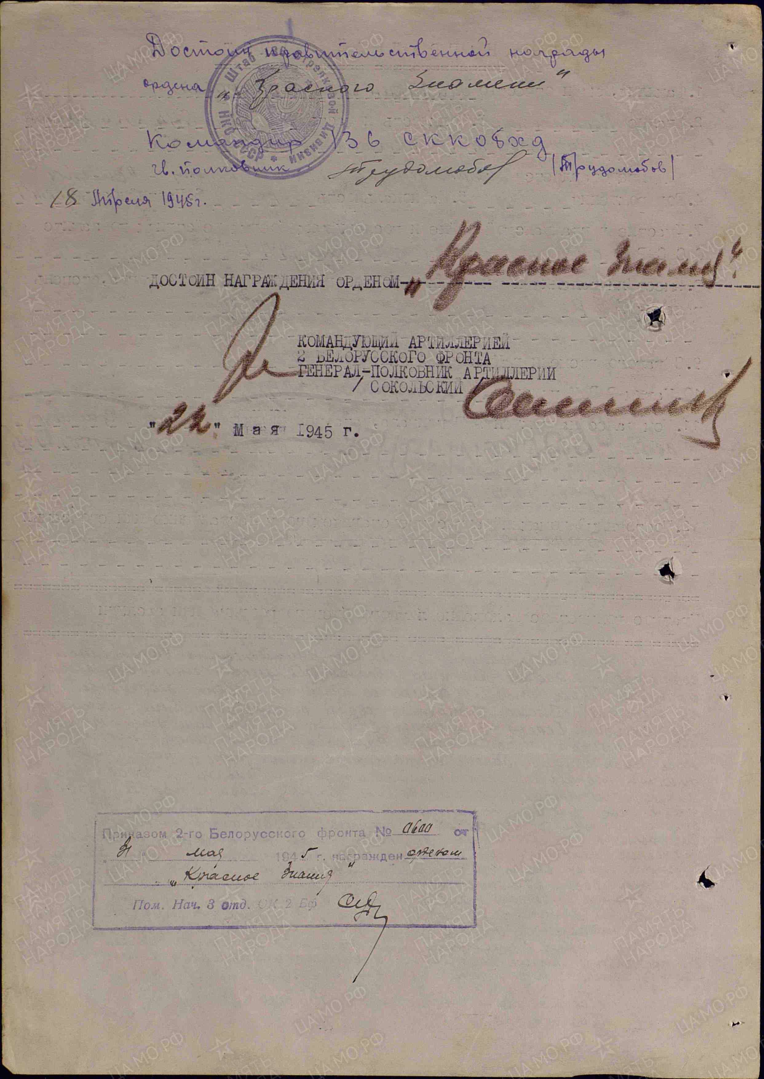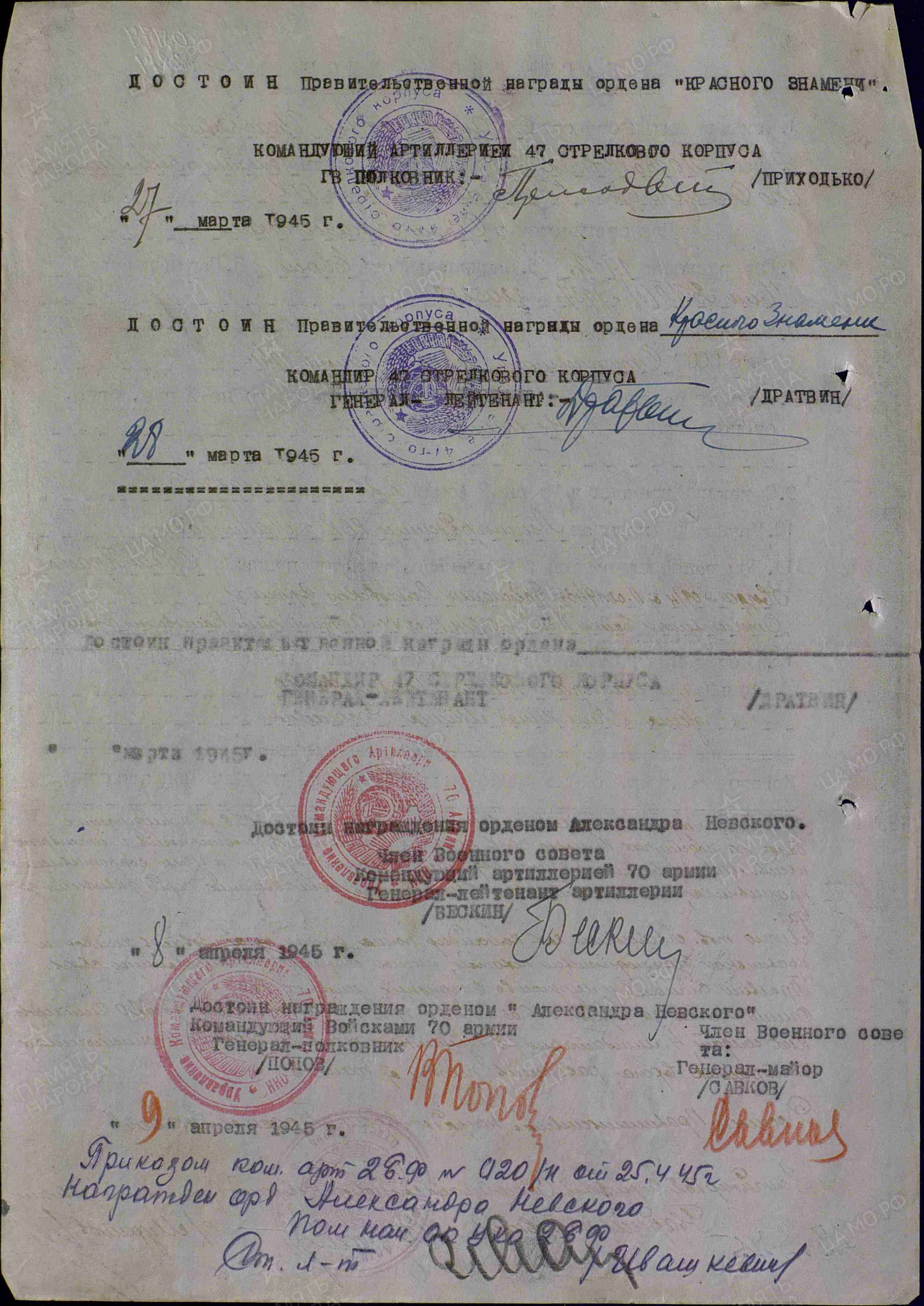 За умелое руководство огнём миномётного полка и проявленные, в боях с немецкими захватчиками, личные храбрость и мужество, подполковник МАЛИКИН достоин награждения орденом "КРАСНОЕ ЗНАМЯ". Командующий артиллерией 49 армии Генерал-майор артиллерии РАЗИНЦЕВ. 15.05.1945 г.";№ записи: 29644755); 5. Орден "АЛЕКСАНДРА НЕВСКОГО("(Из НАГРАДНОГО ЛИСТА на орден "КРАСНОГО ЗНАМЕНИ": "За период поддержки дивизии, в тяжёлых боях, за высоту 205.8 и последующих боях, на подступах к морю, полк показал слаженность, мобильность и маневренность. Массированным огнём подавлял опорные пункты и узлы сопротивления противника, чем способствовал выполеннию поставленных перед дивизией задач.