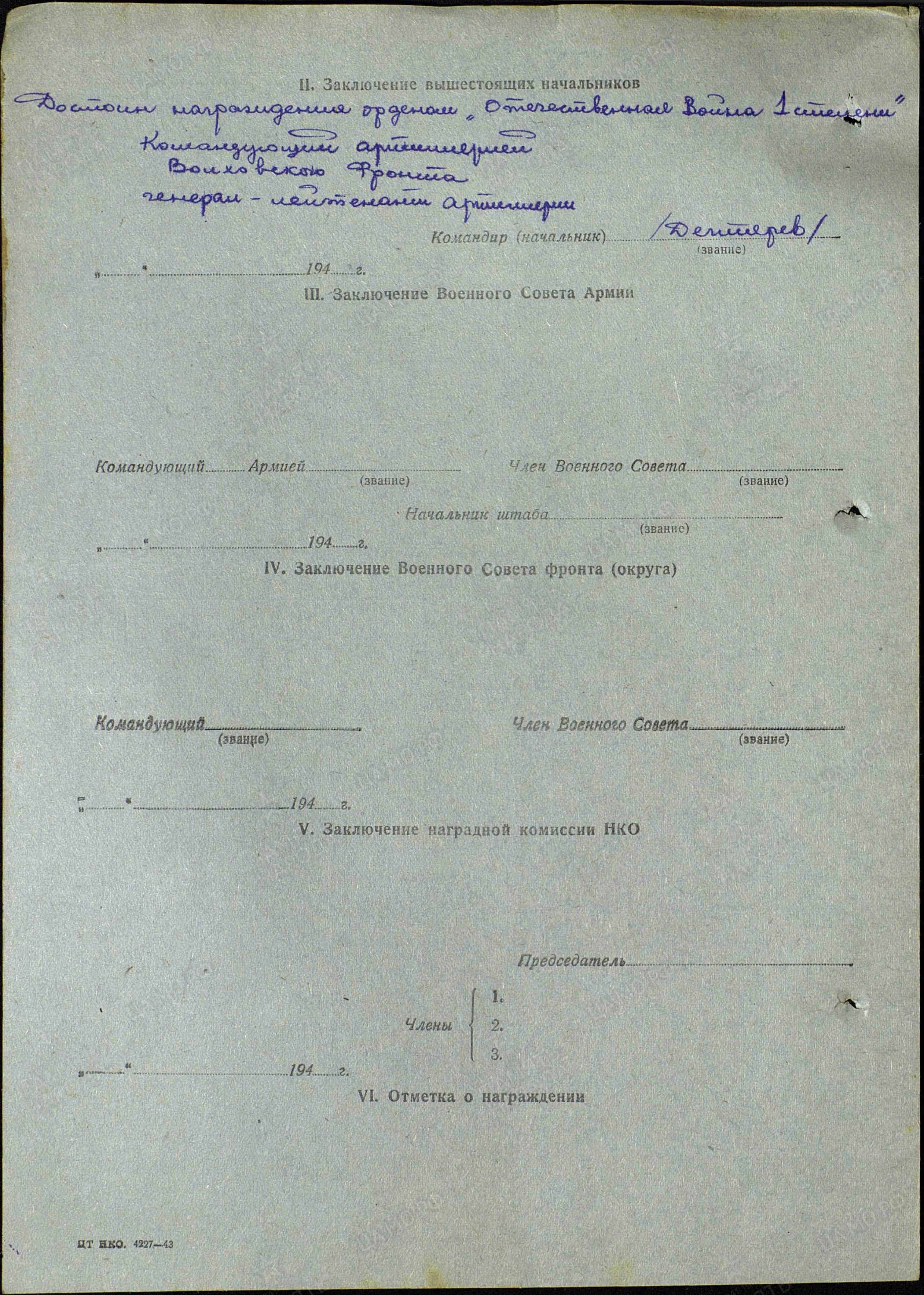 Старший помощник начальника оперативного отдела Управления Коммандующего артиллерией, Волховского фронта.