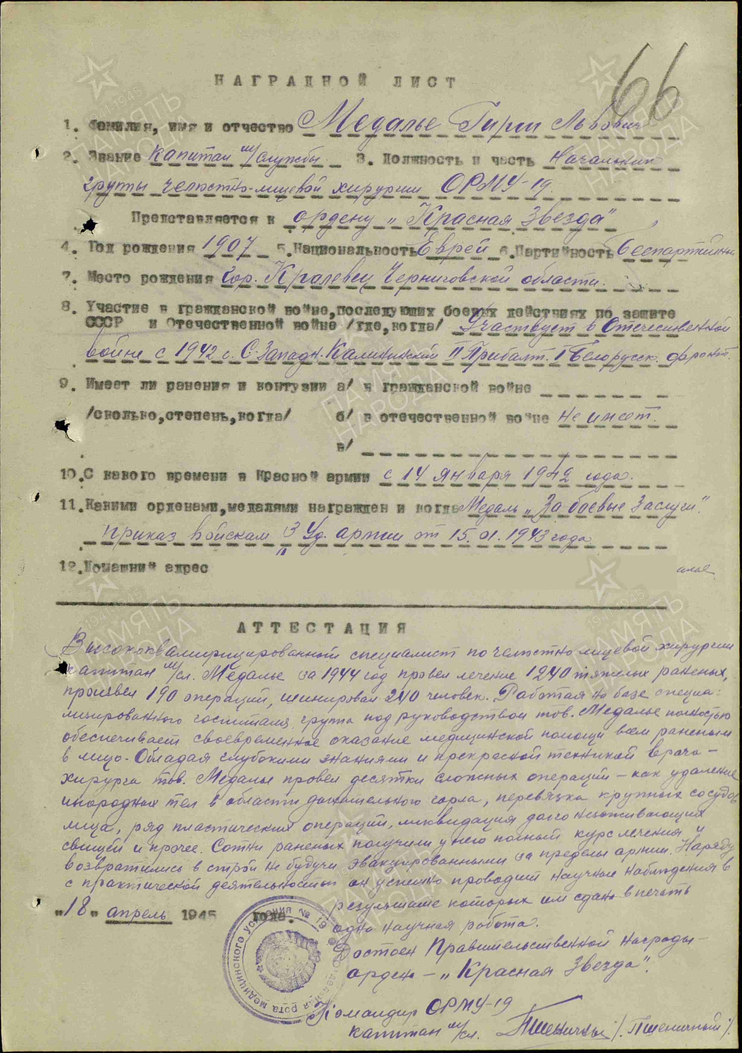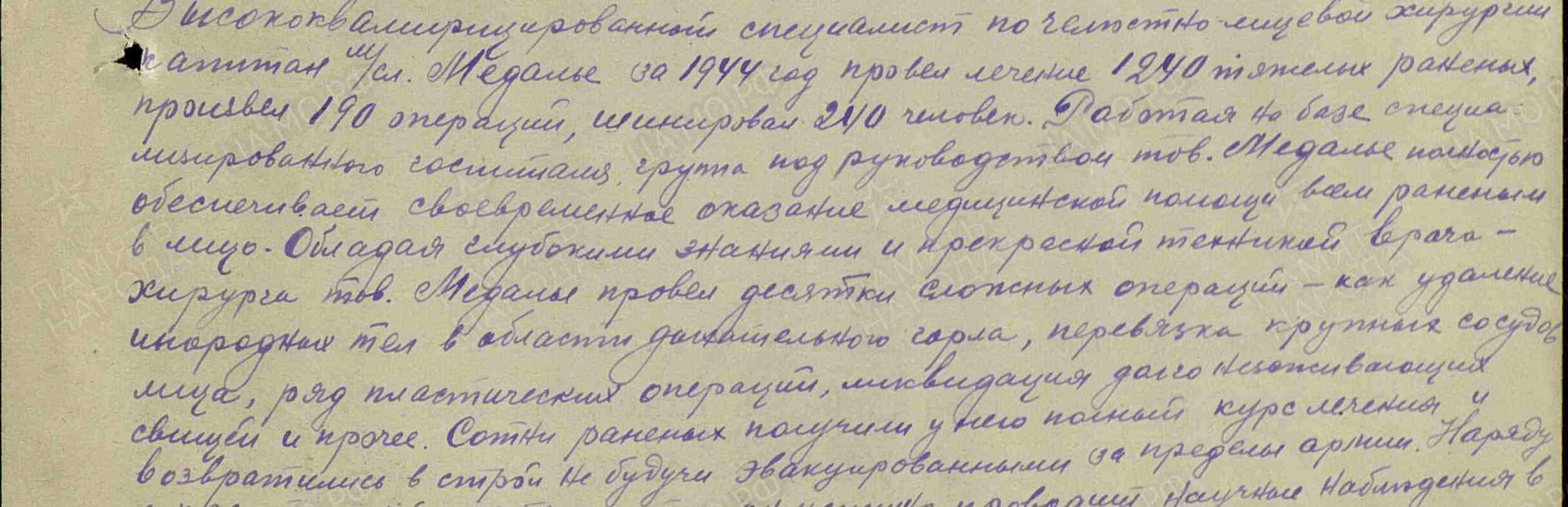 Высококвалифицированный специалист по челюстно-лицевой хирургии капитан м/сл Медалье за 1944 год провел лечение 1240 тяжелых раненых, провёл 190 операций, шинировал 240 человек. Работая на базе специального госпиталя, группа под руководством тов. Медалье полностью обеспечивает своевременное оказание медицинской помощи всем раненым в лицо. Обладая глубокими знаниями и прекрасной техникой врача-хирурга, тов. Медалье провел десятки сложных операций - как удаление инородных тел в области дыхательного горла, перевязка крупных сосудов лица, ряд пластических операций, ликвидация долго незаживающих свищей и прочее. Сотни раненых получили у него полный курс лечения и возвратились в строй не будучи эвакуированными за пределы армии. Наряду с практической деятельностью он успешно проводит научные наблюдения, в результате которых им сдана в печать одна научная работа. Достоин правительственной награды - ордена Красная звезда.