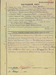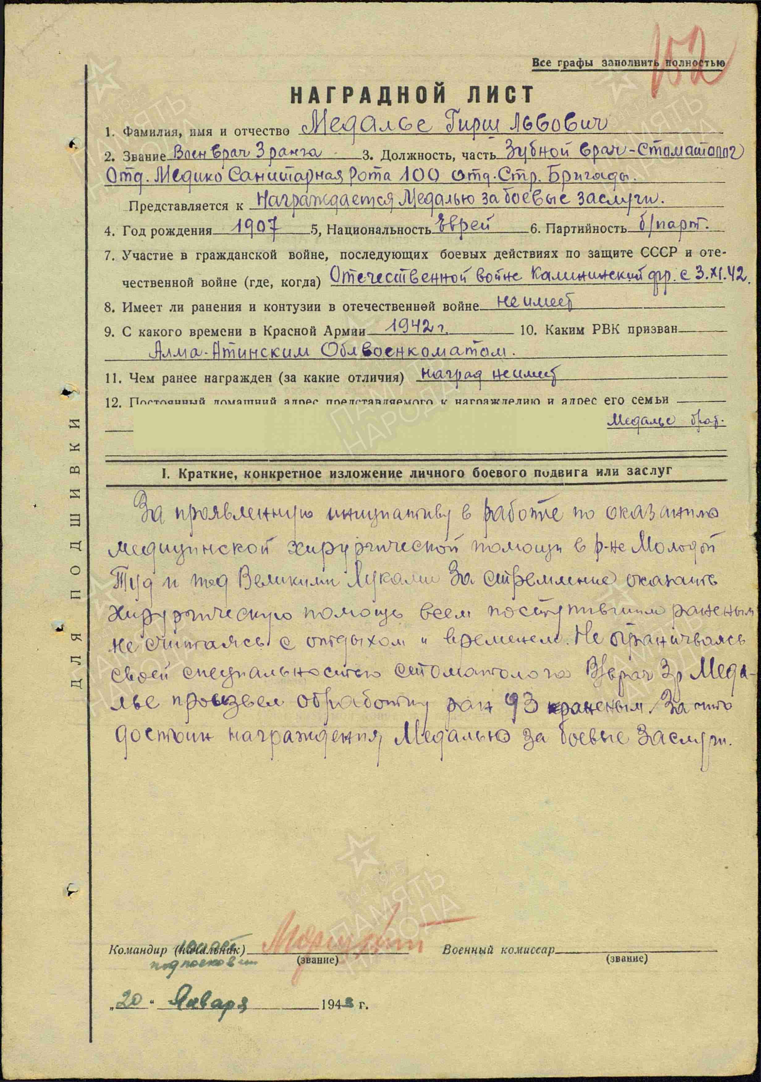 За проявленную инициативу в работе по оказанию медицинской хирургической помощи в районе Молодой Туд и под Великими Луками. За стремление оказать хирургическую помощь всем поступившим раненым, не считаясь с отдыхом и временем. Не ограничиваясь своей специальностью стоматолога, в/врач 3 ранга Медалье произвел обработку ран 93 раненым. За что достоин награждения медалью За боевые заслуги.
