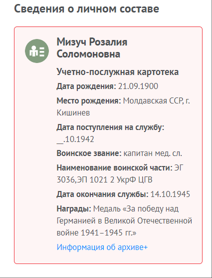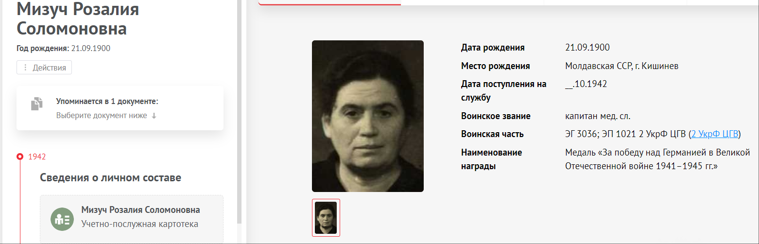 Родилась 21 сентября 1900г в городе Кишинёве Бессарабской губернии. Территория Бессарабии была занята Румынией в 1918—1940 годах. В 1919г. окончила с отличие Гимназию. Получить женщине высшее образование было невозможно. Отец умер рано, семья бедствовала. Работала на разных работах помогая существованию семьи. Мечтала попасть в Социалистическую Россию. С помощью родственников попала в Одессу, где окончила Рабфак. В эти же годы мама и сестра с семьёй эмигрировали в Палестину. Утаив диплом гимназии из Румынии поступила в медицинский институт. После окончания, по распределению, работала в городе Балта, УССР. В 1940 году на территории Бессарабии была образована Молдавская ССР. В начале войны была эвакуирована в Узбекистан и в 1942г. ушла на фронт, где всю войну проработала хирургом. Была демобилизована в звании гвардии капитан. Вернулась в Кишинёв в августе 1945г. Розалия помогала семье в Израиле материально все послевоенные годы. Последняя её племянница скончалась в Израиле в 1984г. В Кишинёве Розалия Соломоновна работала Главврачом женской консультации, преподавала в Кишинёвском медицинском училище. Пользовалась большим уважением.