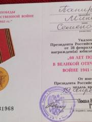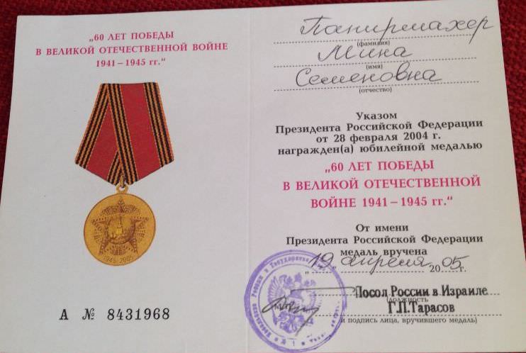 Награждена медалью “За победу над Германией” и медалью “60 лет победы в Великой Отечественной Войне”, врученной послом России в Израиле в апреле 2005 года..