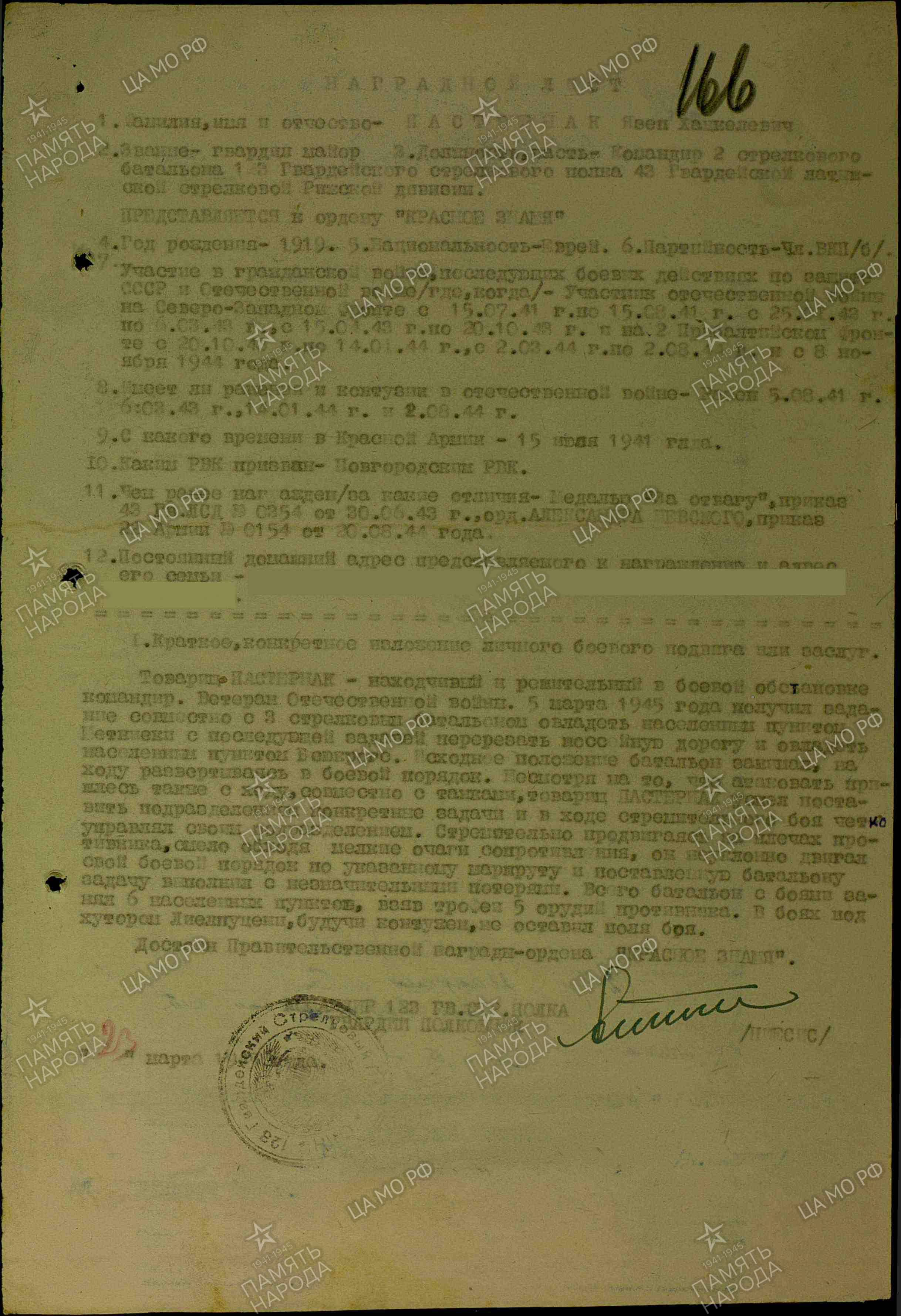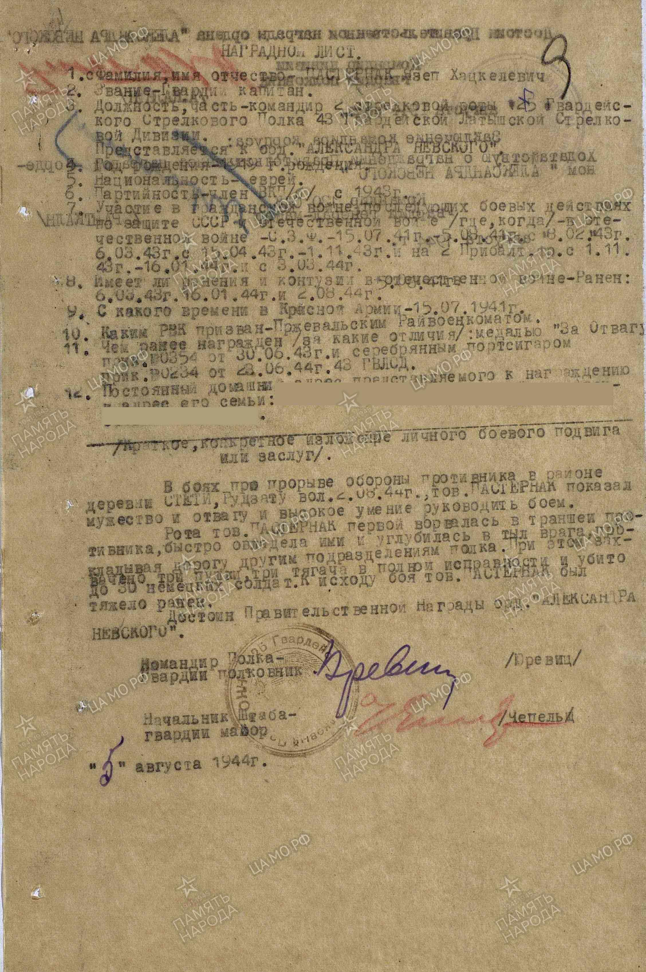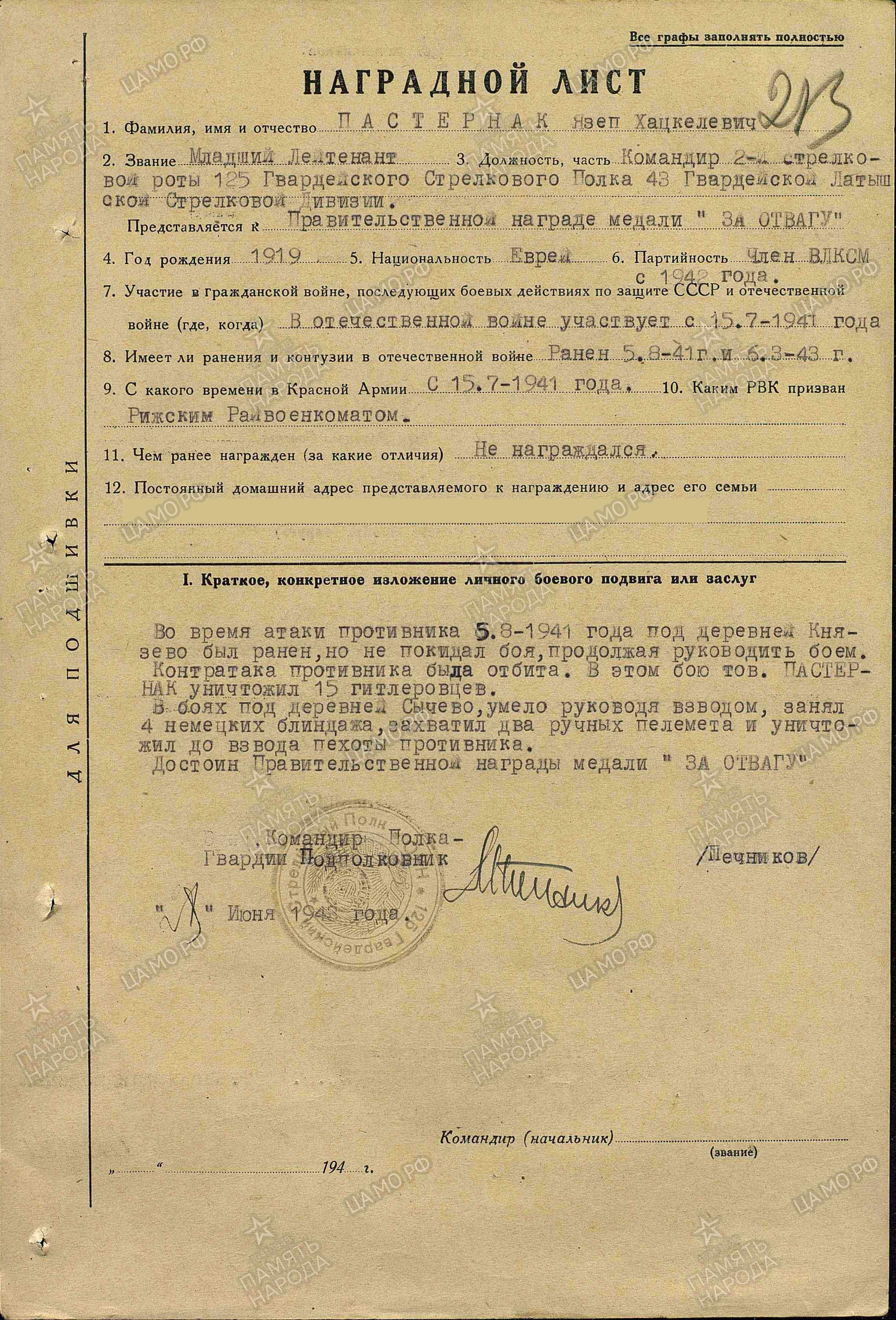 Гвардии майор ПАСТЕРНАК ЯЗЕП ХАЦКЕЛЕВИЧ, 14.05.1919 года рождения, место рождения - г. Рига, Латвия( по другим данным: СССР, РСФСР, Ярославская область, г. Ярославль), еврей. В РККА  призван Рижским ГВК, г. Риги, Латвийской  ССР( по другим данным: РСФСР, Новгородским РВК, г. Новгорода), 15.07.1941 года. В Великой Отечественной войне с 15.07.1941 года( на Северо-Западном, 2 Прибалтийском, Ленинградском фронтах) - Командир 2 стрелкового батальона(последняя должность) 125 гвардейского стрелкового полка, 43 гвардейской стрелковой Латышской Рижской дивизии, 130 стрелкового Латышского ордена Суворова корпуса, 42 Армии, Курляндской группы войск Ленинградского фронта. Ранения: 1. 5.08.1941 г.; 2.  6.02.1943 г.; 3.  14.01.1944 г.;  4.  2.08.1944 г. Боевые награды: 1. Орден "АЛЕКСАНДРА НЕВСКОГО"( Из НАГРАДНОГО ЛИСТА :
