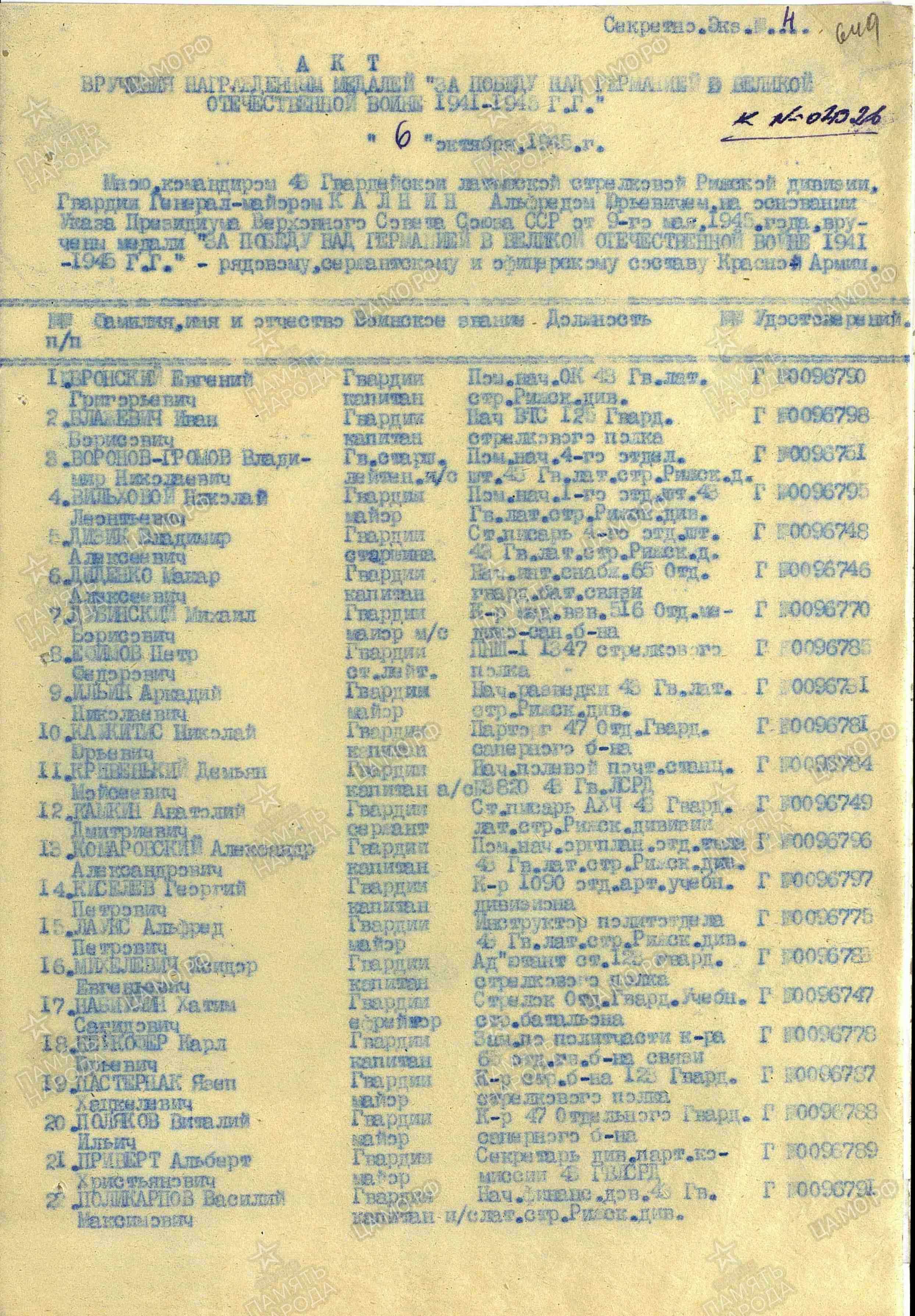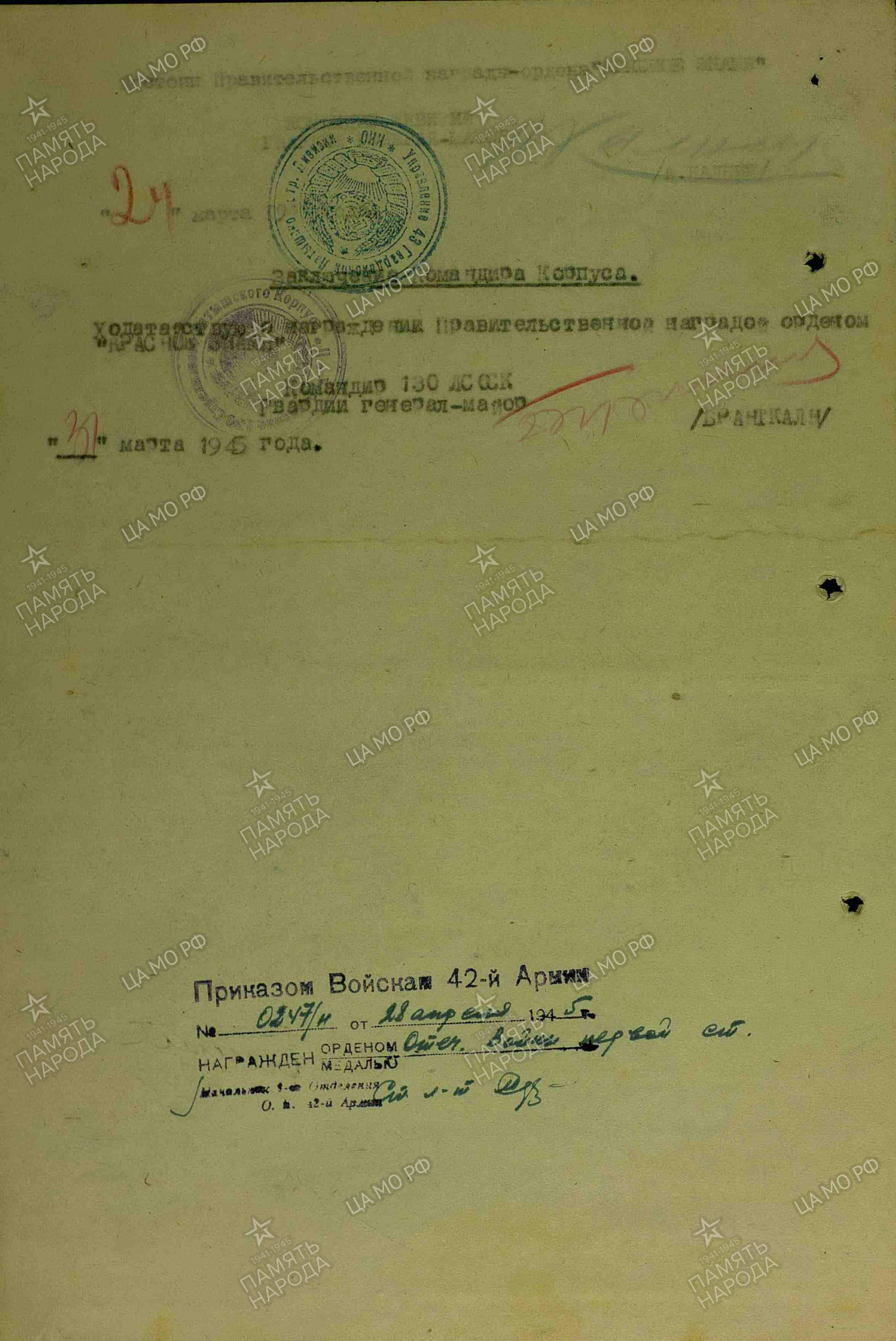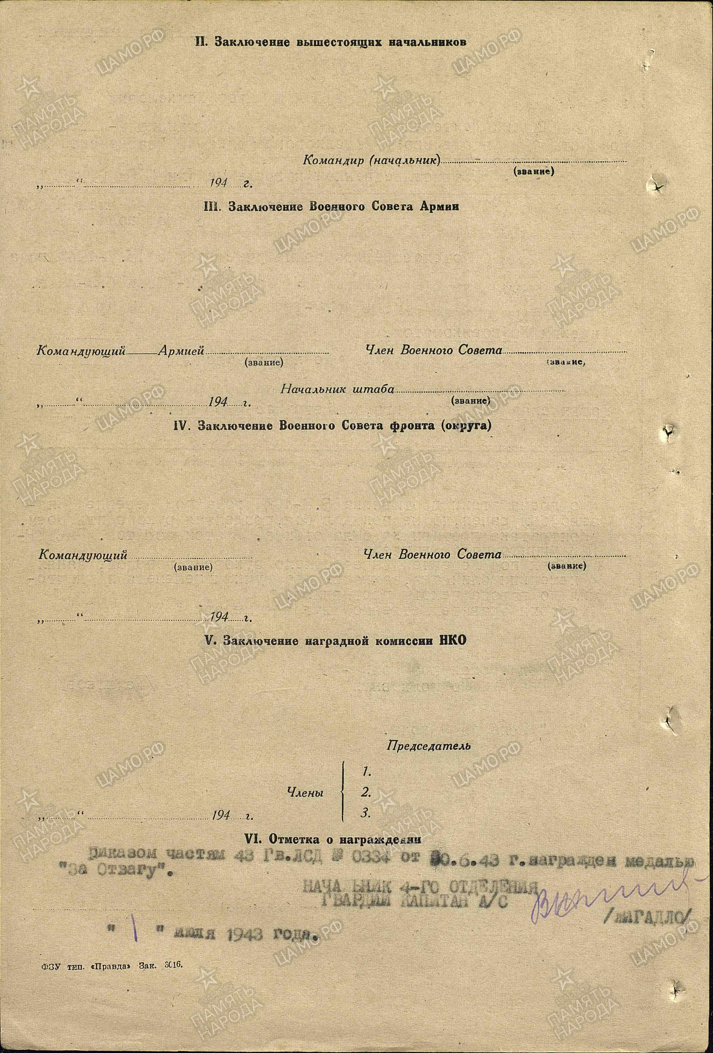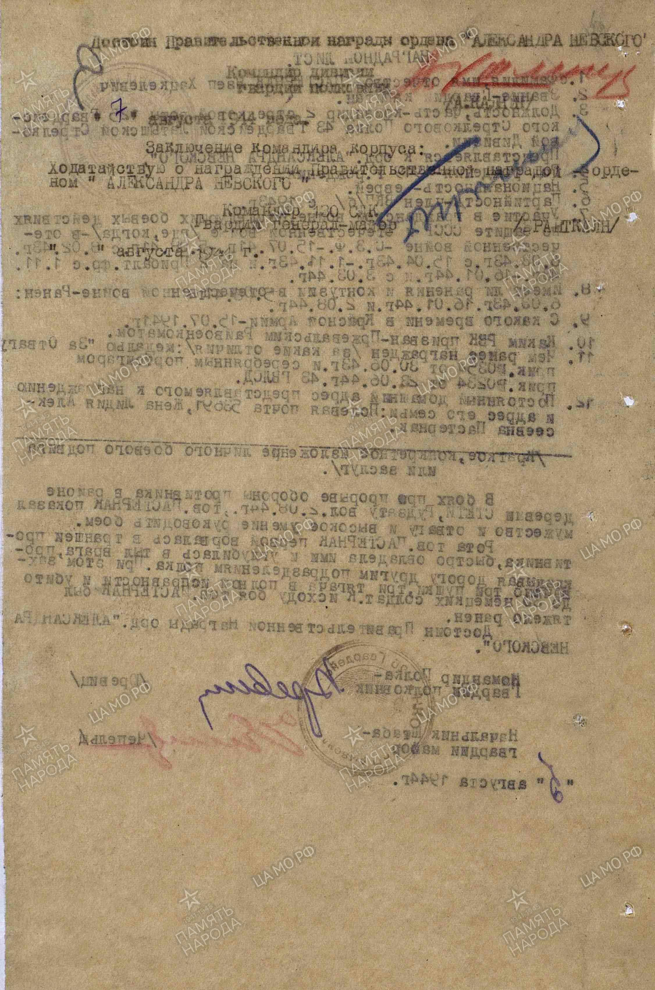 1. НАГРАДНЫЕ ЛИСТЫ:  на ордена "АЛЕКСАНДРА НЕВСКОГО",  "ОТЕЧЕСТВЕННАЯ ВОЙНА" 1 СТЕПЕНИ; медаль "ЗА ОТВАГУ" " ( с портала ЭЛЕКТРОННЫЙ БАНК ДОКУМЕНТОВ «ПОДВИГ НАРОДА В ВЕЛИКОЙ ОТЕЧЕСТВЕННОЙ ВОЙНЕ 1941-1945 ГГ.» http://podvignaroda.ru/?#tab=navHome  ).