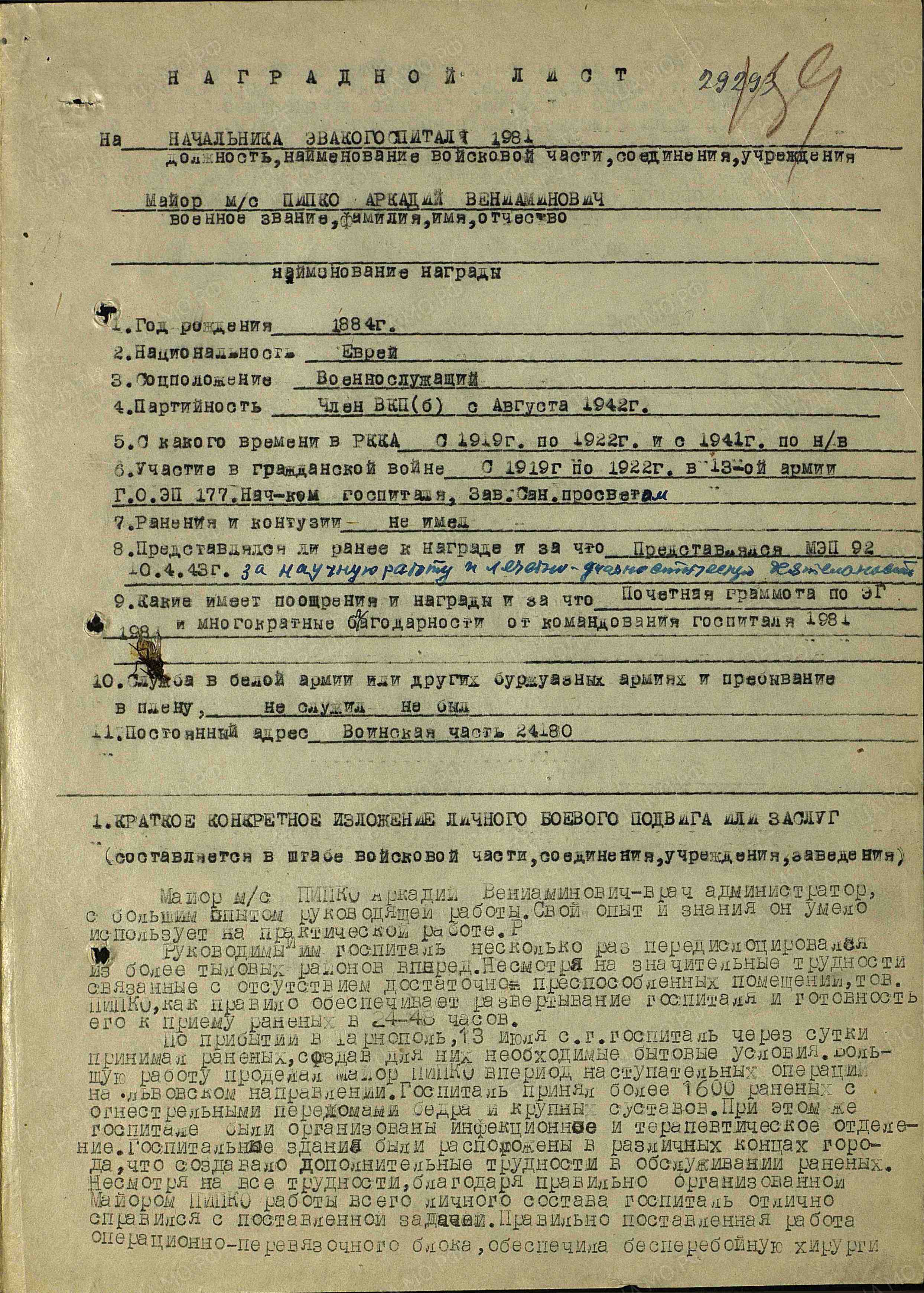 Майор медицинской службы ПИПКО АРКАДИЙ ВЕНИАМИНОВИЧ, 1884 года рождения, место рождения - Российская Империя, Екатеринославская губерния, Бахмутский уезд, Юзовская волость, местечко Юзовка (по административному делению СССР: Украинская ССР, Сталинская область ( прим. Донецкая) область, г. Сталино (прим. г. Донецк), еврей. Участник Гражданской войны, с 1919 по 1922 годы, в качестве военного врача 13 армии. В Великой Отечественной войне с 1941 года в должности (последняя, 1945 год): Начальника эвакуационного госпиталя 1981, Управления фронтового эвакуационного пункта 93, Санитарного управления, 1 Украинского фронта. Ранения: нет. Боевые награды: 1. Орден "КРАСНАЯ ЗВЕЗДА"; 2. Медаль "ЗА ПОБЕДУ НАД ГЕРМАНИЕЙ В ВЕЛИКОЙ ОТЕЧЕСТВЕННОЙ ВОЙНЕ 1941 - 1945 ГГ." с ЭЛЕКТРОННЫЙ ДОКУМЕНТОВ «ПОДВИГ НАРОДА В ВЕЛИКОЙ ОТЕЧЕСТВЕННОЙ 1941-1945 ГГ.» http://podvignaroda.ru/?#tab=navHome. Вернулся с Великой Отечественной войны. Послевоенная судьба: неизвестна. Вечная Слава и Память!