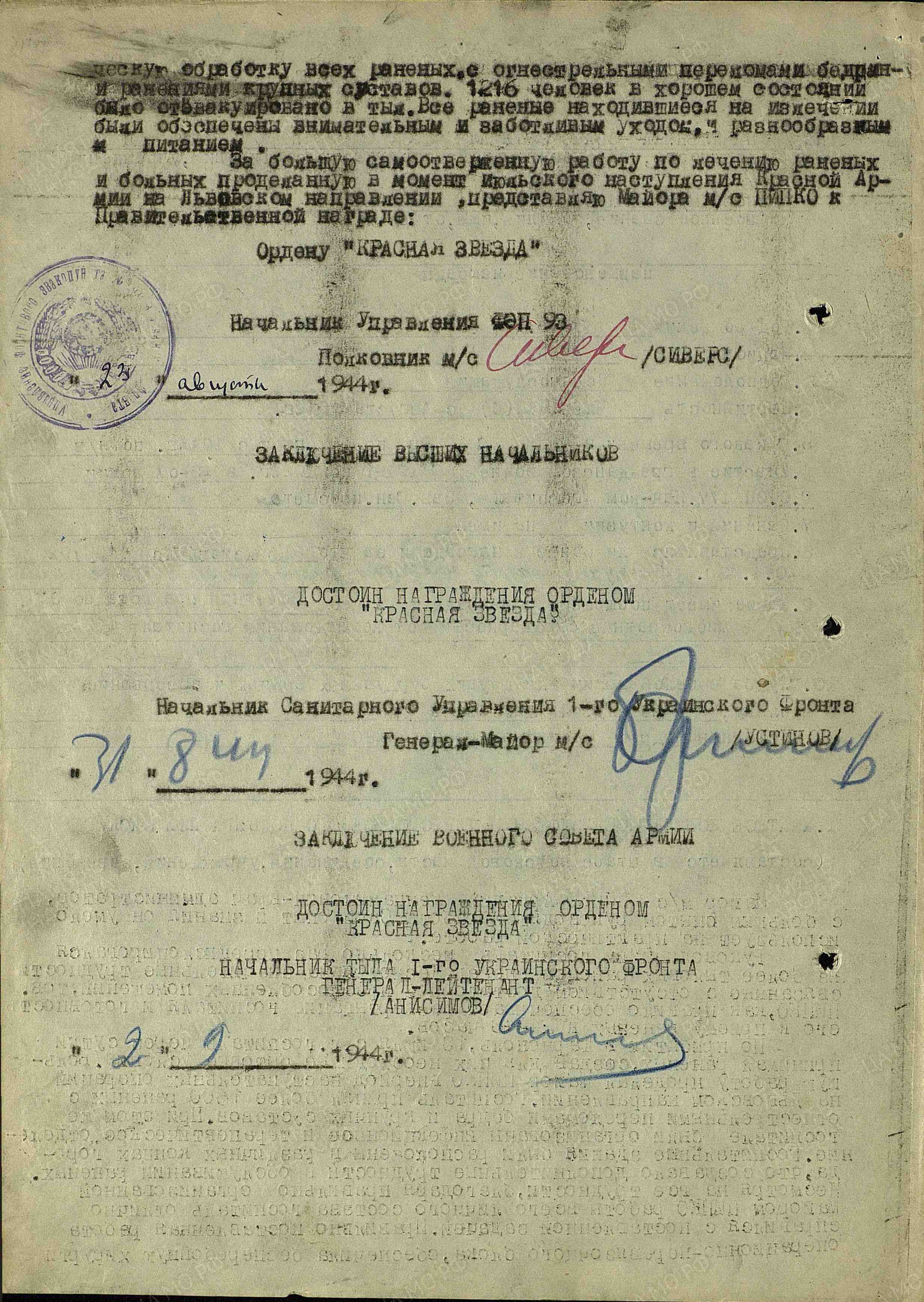 Начальник эвакуационного госпиталя 1981, Управления фронтового эвакуационного пункта 93, Санитарного управления 1 Украинского фронта.