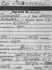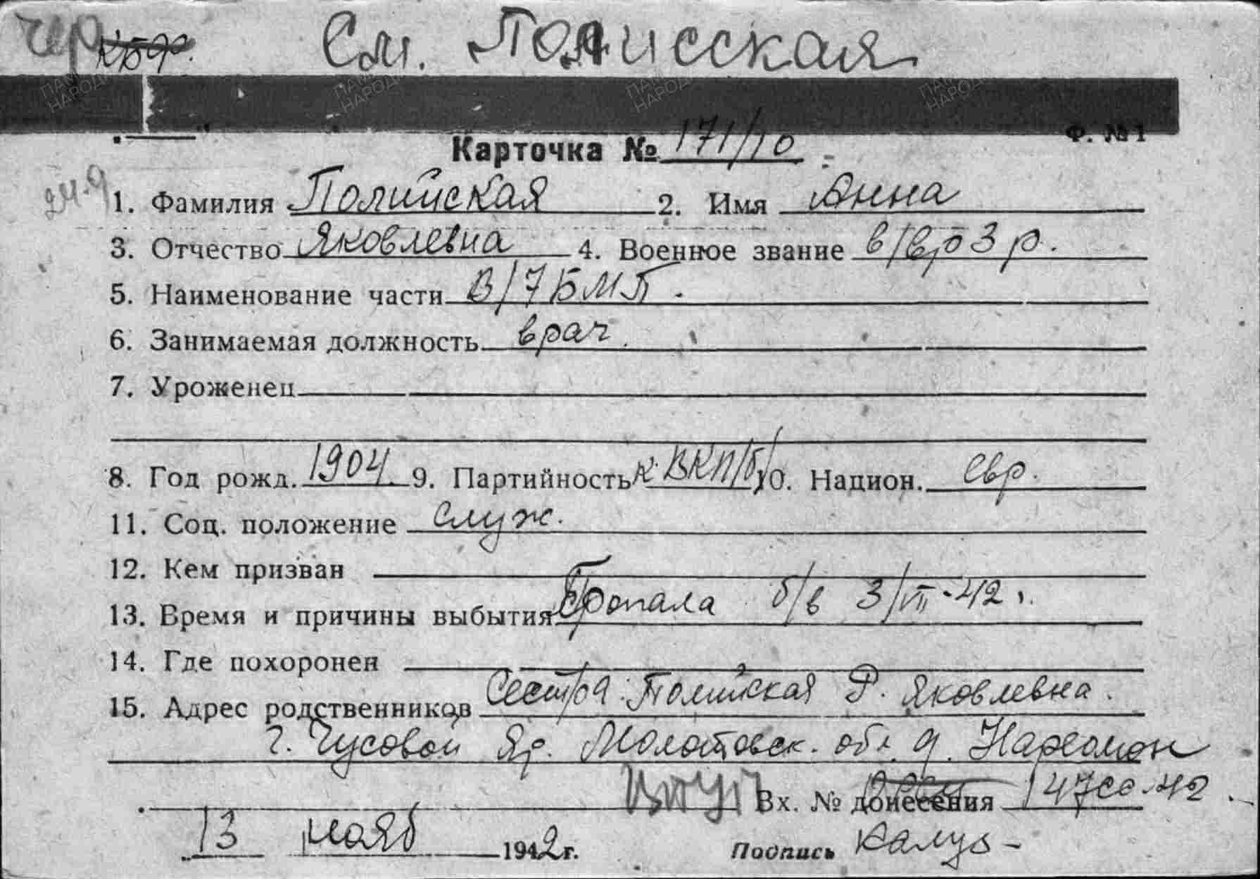 Примечание: Военный врач 2 ранга ПОЛИССКАЯ АННА ЯКОВЛЕВНА, после гибели мужа, военного врача 3 ранга МАРМАРШТЕЙНА АЛЕКСАНДРА МАРКОВИЧА (1905 - 1941) начальника санитарной службы 7 бригады морской пехоты, Главной военно - морской базы Черноморского флота, добилась назначания в часть, где служил муж и проходила службу в должности младшего врача 3 батальона, а затем начальника санитарной службы бригады. Пропала без вести, во время тяжёлых боёв, в г. Севастополе, 3.07.1942 года (по неподтверждённым сведениям, попала в плен и была расстреляна, как еврейка).