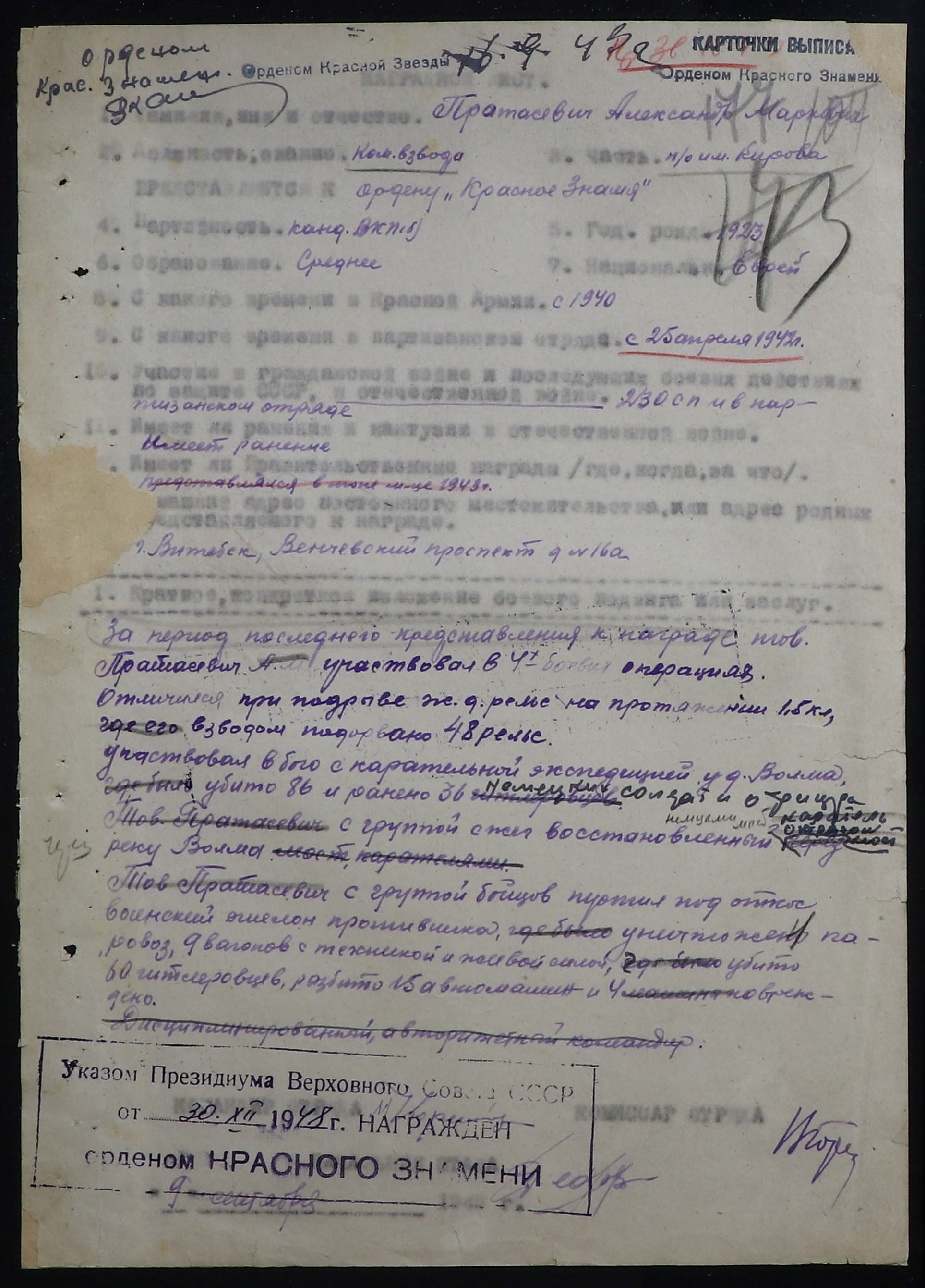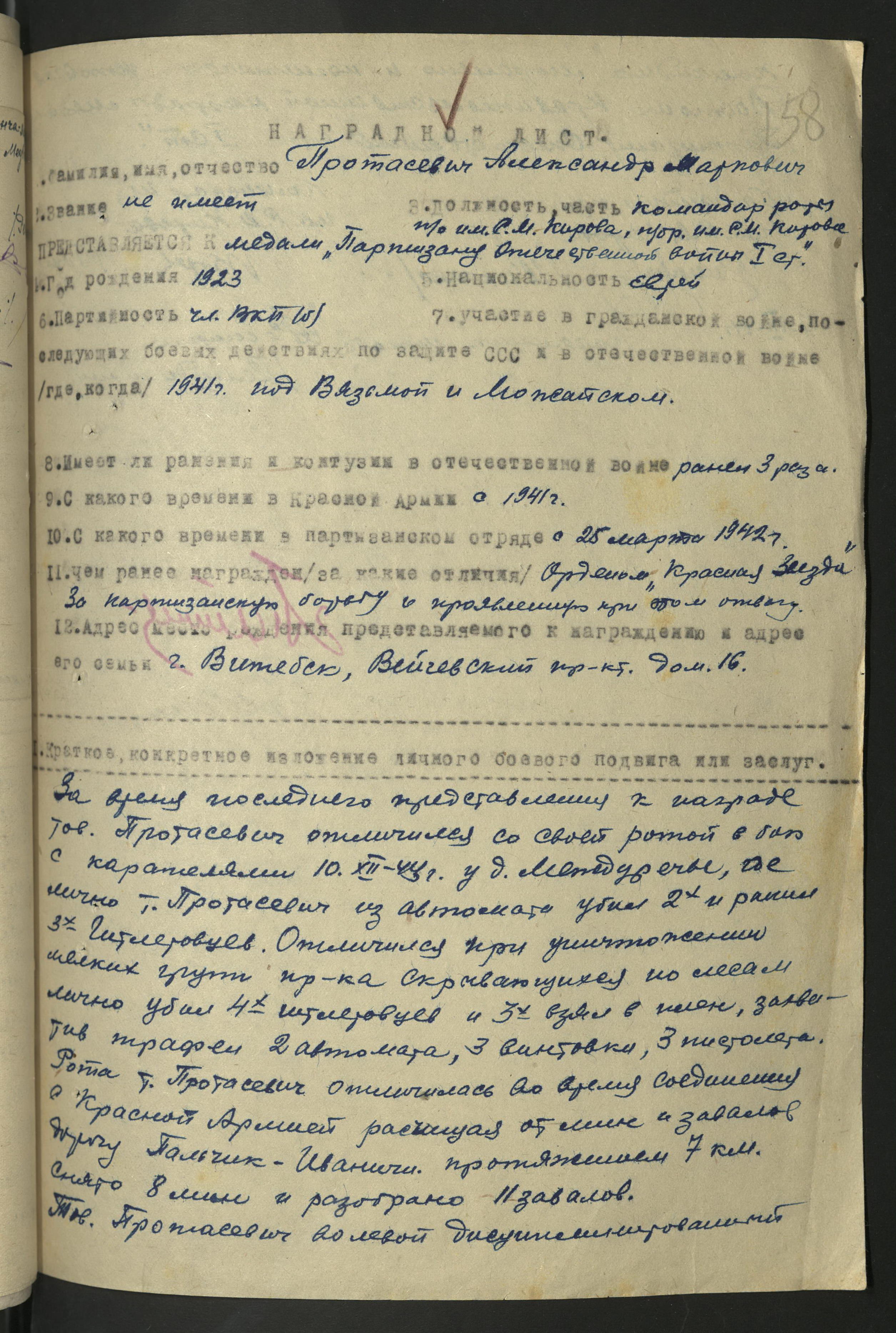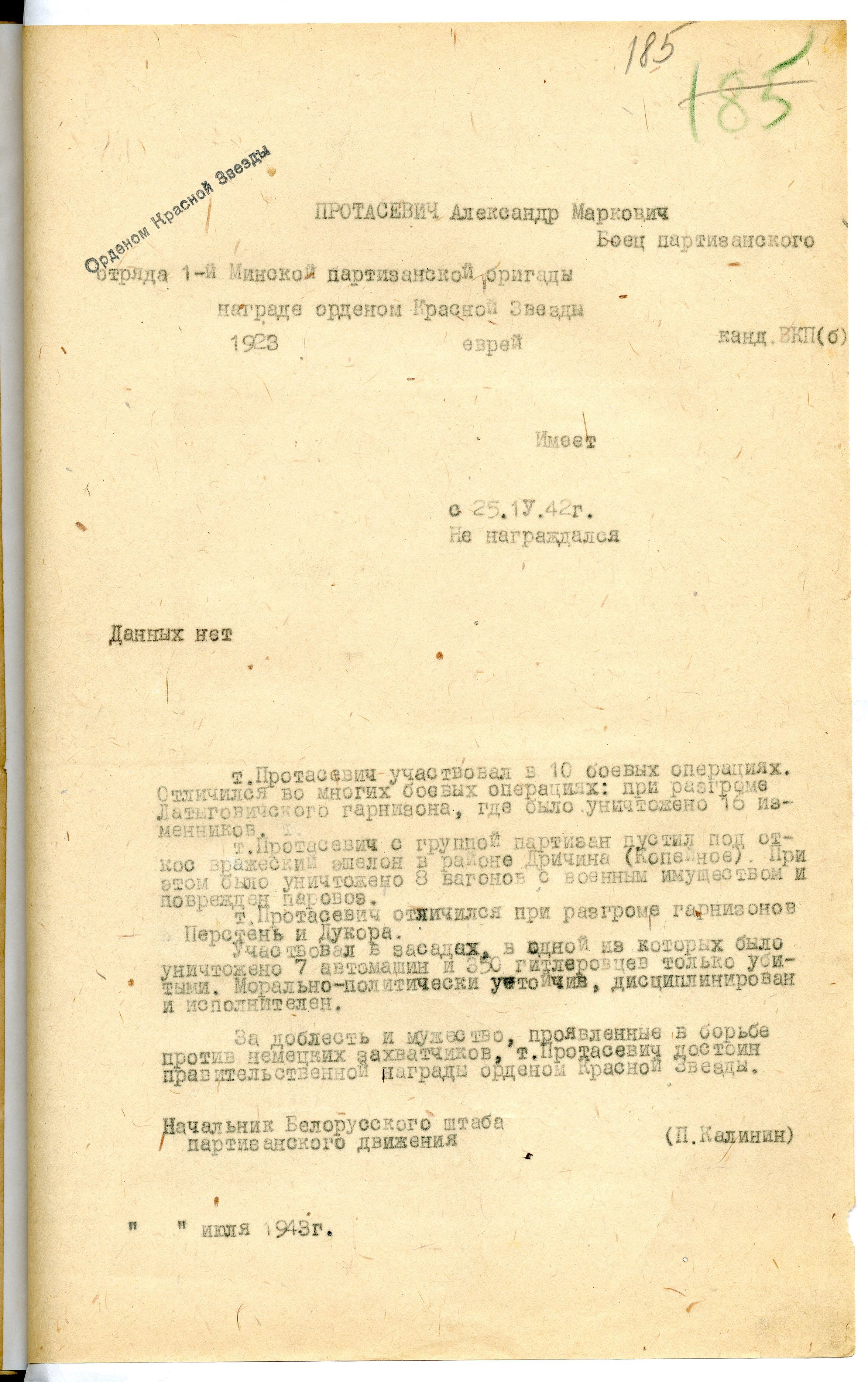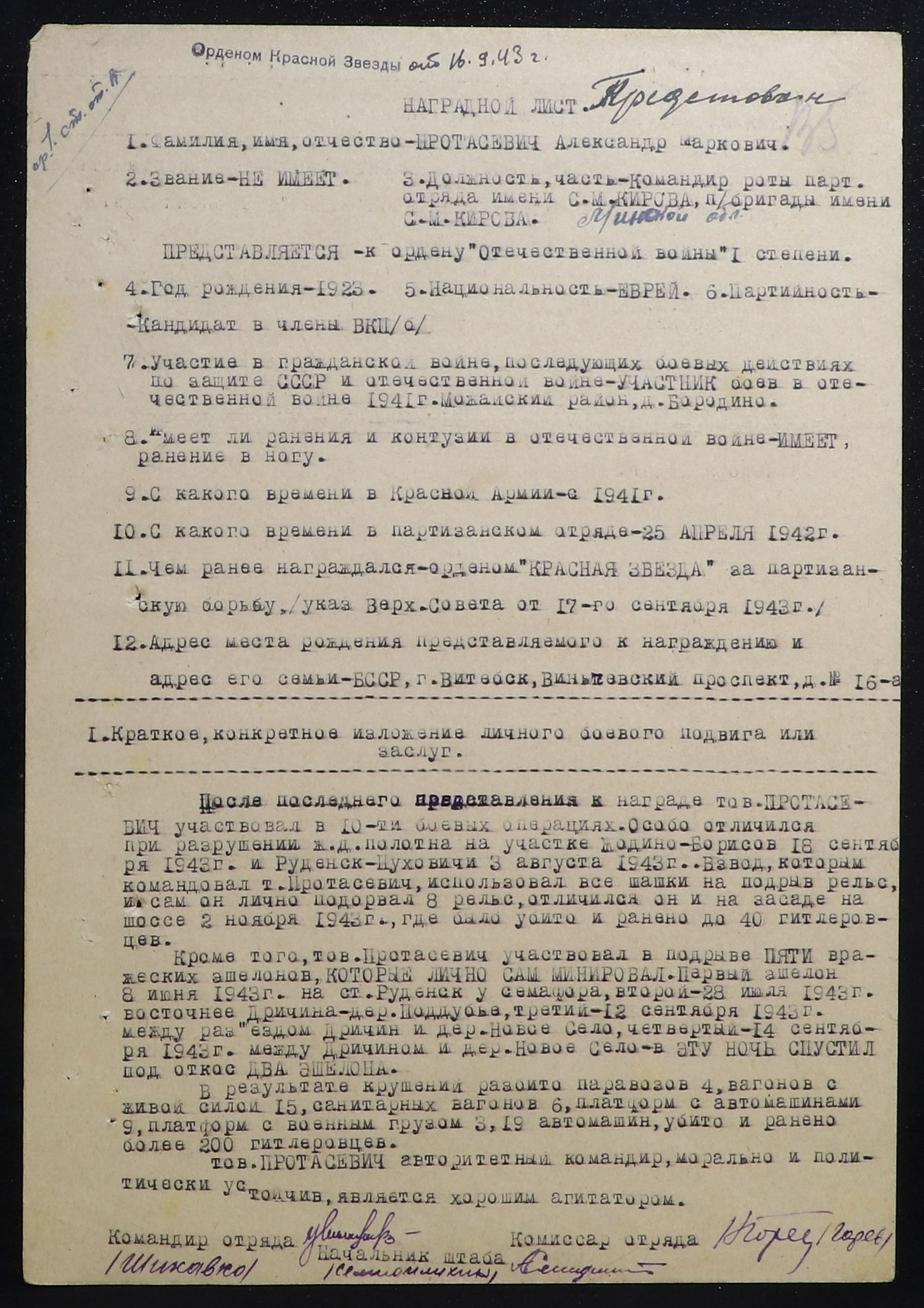 Протасевич Александр Маркович родился в 1923 году. Еврей. Член ВКПб. На войне с 1941 года, участвовал в боях под Вязьмой и Можайском. В партизанском отряде с 25 марта 1942 года. Командовал ротой минеров. В боях с немцами неоднократно проявил личное мужество. На его счету были как убитые гитлеровцы, так и захваченные в плен, уничтожены полицаи, добыто оружие. Особо отличился в подрывных работах на железной дороге. Лично заминировал и подорвал 48 рельсов, 5 эшелонов. В результате его работы было уничтожено 4 паровоза, 18 вагонов с живой силой немцев, 6 санитарных вагонов, 9 платформ с автотехникой, 19 автомашин, 200 человек убито. Также рота под его командованием осуществляла подготовку встречи с частями Красной армии, а именно на семикилометровом участке дороги Пальчик-Иваничи было обезврежено 8 мин и разобрано 11 завалов. Неоднократно был ранен.