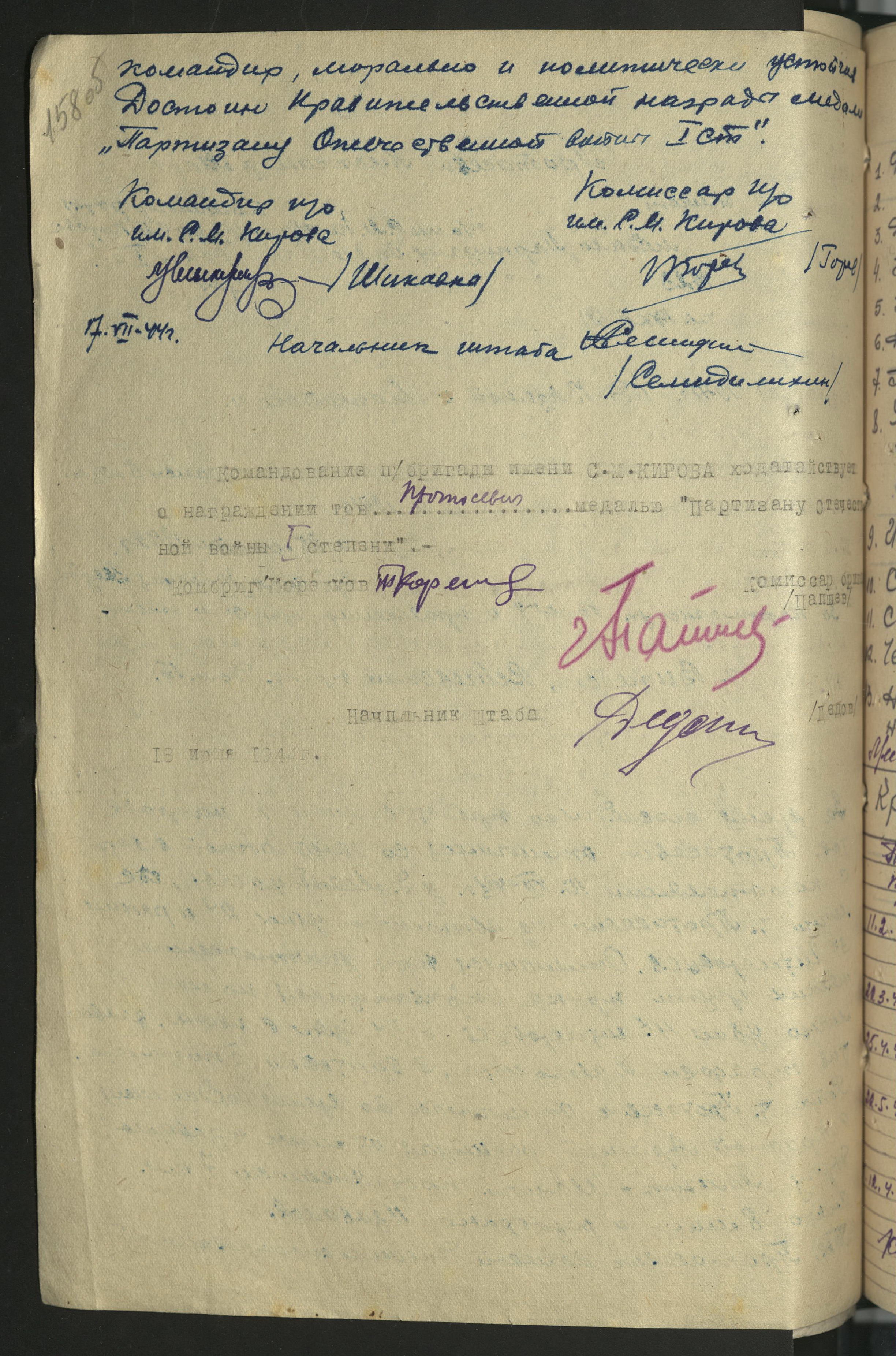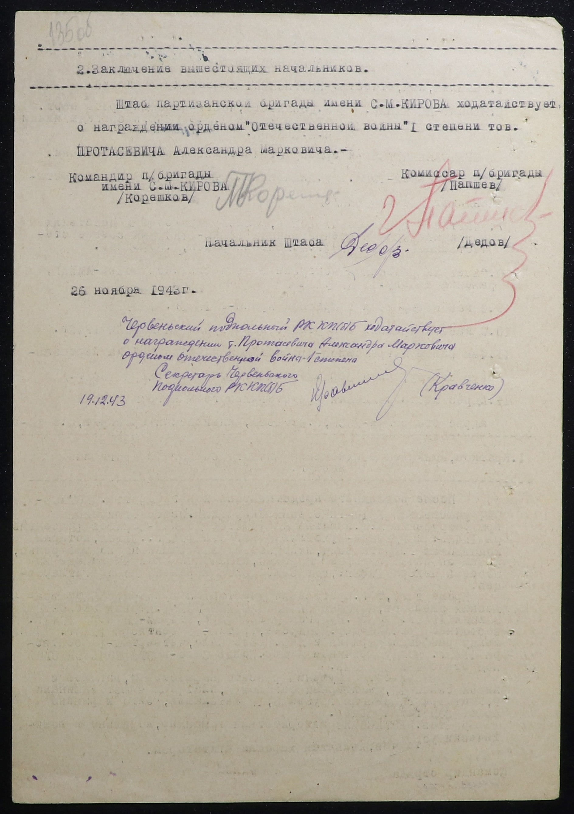 Тов. Протасевич участвовал в 10 боевых операциях, в том числе уничтожении гарнизонов в Латыговичское, Перстень и Дикора. В районе Дричина с группой партизан пустил под откос эшелон (8 вагонов и паровоз). В засадах с его участием уничтожено 7 автомашин и 350 немцев.