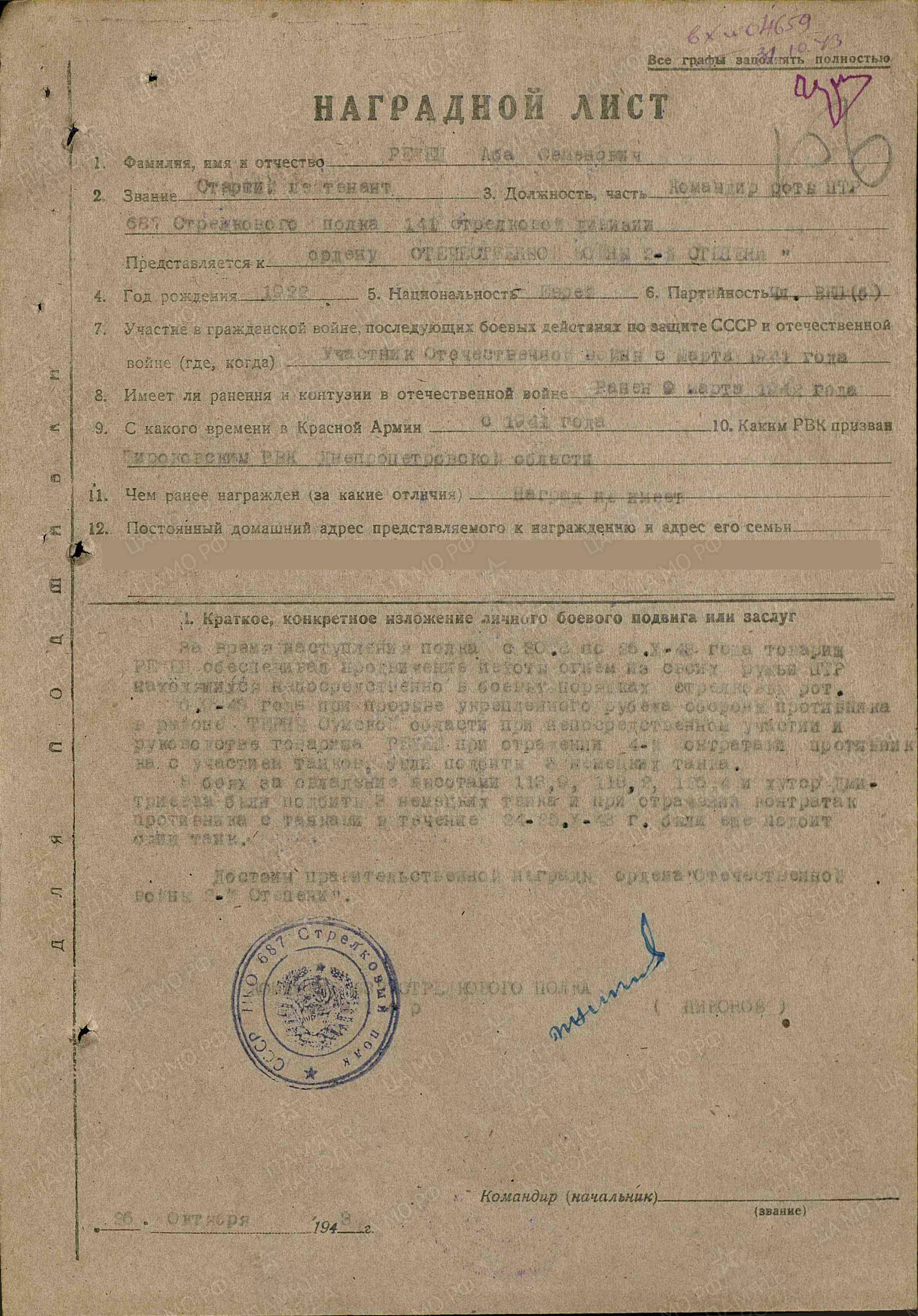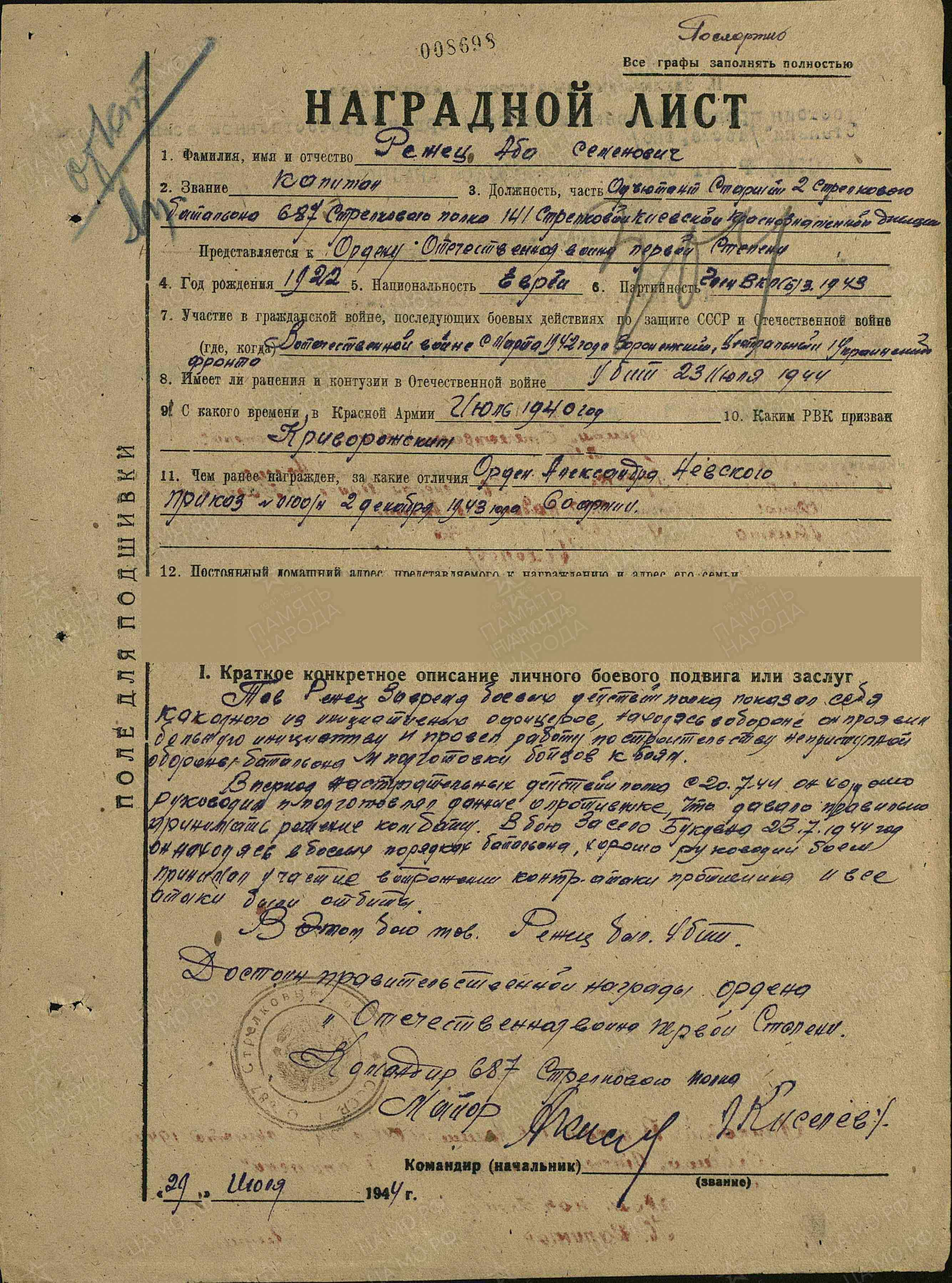 Капитан РЕЖЕЦ АБА СЕМЁНОВИЧ, 8.07.1922 года рождения, место рождения - СССР, Украинская ССР, Днепропетровская область, Широковский район, Новолатовский сельский совет, местечко Ингулец(еврейская земледельческая колония), еврей. В РККА призван Широковским РВК, Днепропетровской области, Украинской ССР, в июле 1940 года. В Великой Отечественной войне с марта 1943 года (на Воронежском, Центральном, 1 Украинском фронтах) в должностях: 1. Командир роты ПТР , а затем Адъютант старший (начальник штаба) 2 стрелкового батальона 687 стрелкового полка, 141 стрелковой Киевской Краснознамённой ордена Богдана Хмельницкого дивизии, 30 стрелкового корпуса, 1 гвардейской Армии, 1 Украинского фронта. Ранение: 1. 03.1942 г. Боевые награды: 1.Орден "АЛЕКСАНДРА НЕВСКОГО"(Из НАГРАДНОГО ЛИСТА на орден "ОТЕЧЕСТВЕННАЯ ВОЙНА" 2 степени: