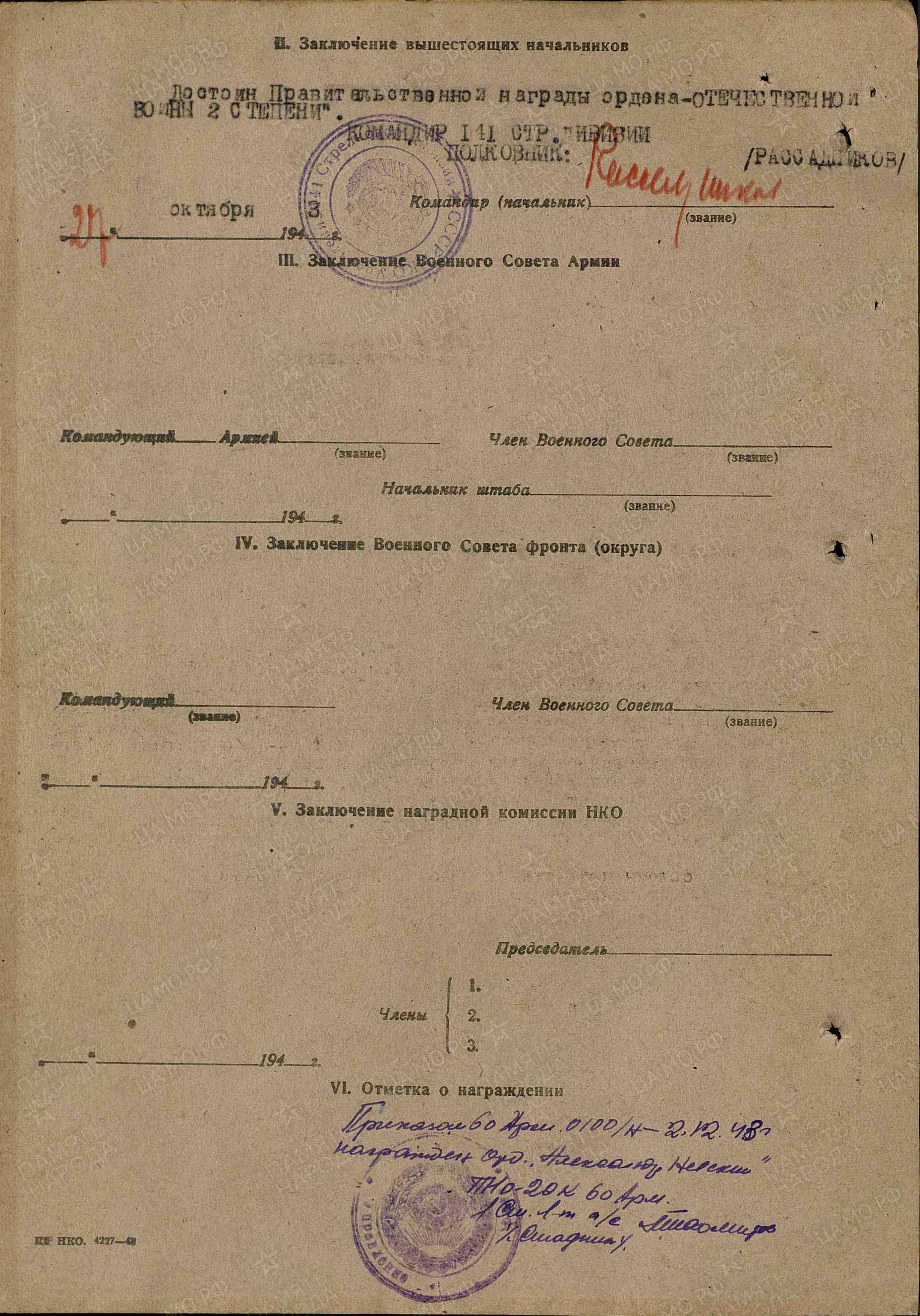 1. НАГРАДНЫЕ ЛИСТЫ на на ордена: 1. "АЛЕКСАНДРА НЕВСКОГО"; 2. "ОТЕЧЕСТВЕННОЙ ВОЙНЫ" 1 степени с сайта ЭЛЕКТРОННЫЙ БАНК ДОКУМЕНТОВ «ПОДВИГ НАРОДА В ВЕЛИКОЙ ОТЕЧЕСТВЕННОЙ ВОЙНЕ 1941-1945 ГГ.»( http://www.podvignaroda.mil.ru/?#tab=navHome ").