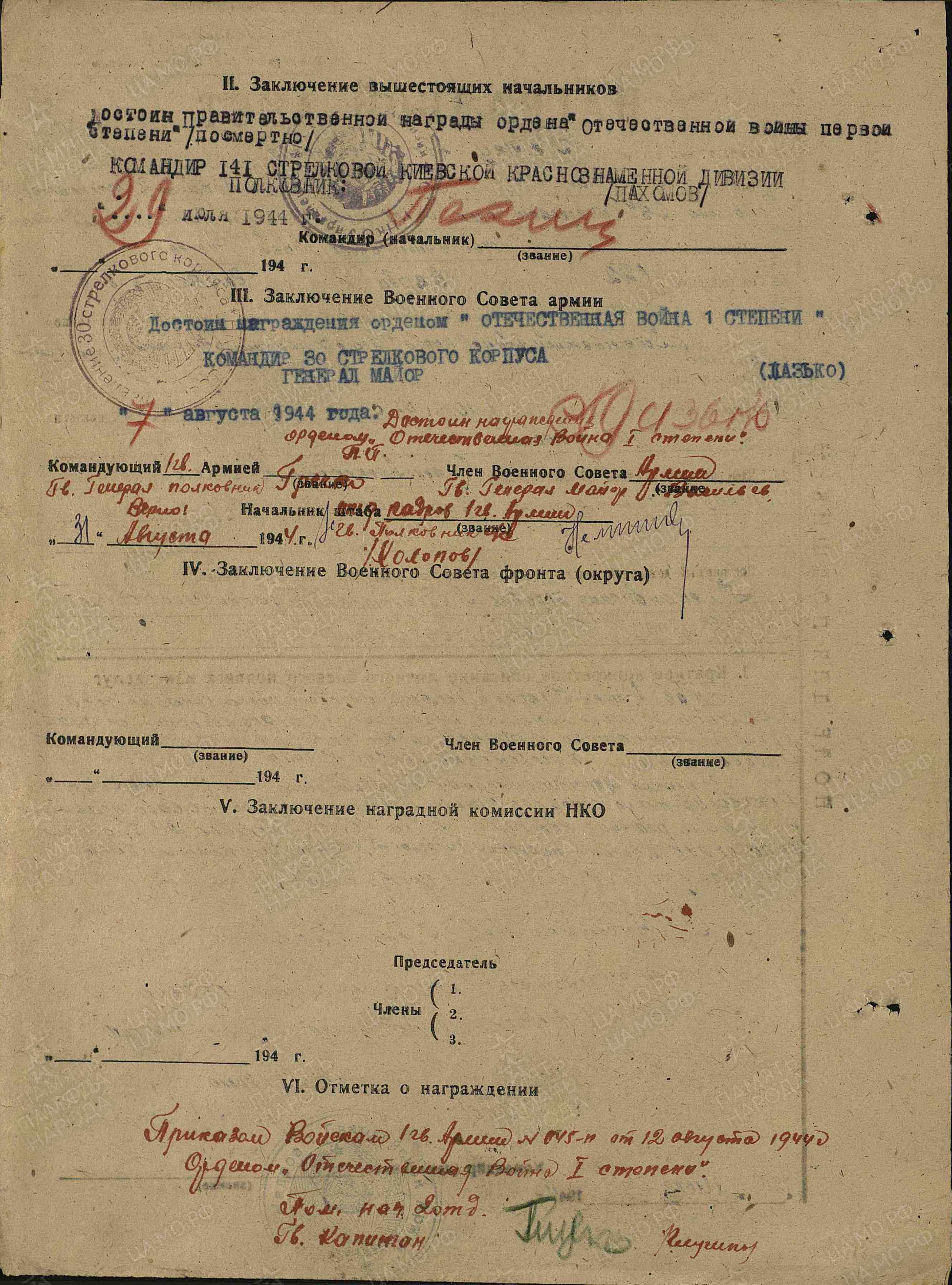 | 12.08.1944 | Орден Отечественной войны I степени |