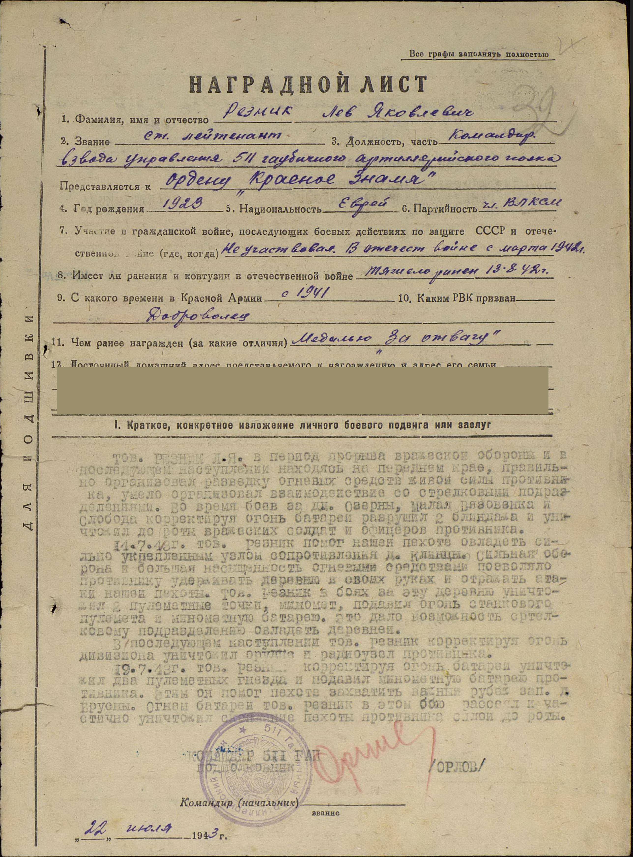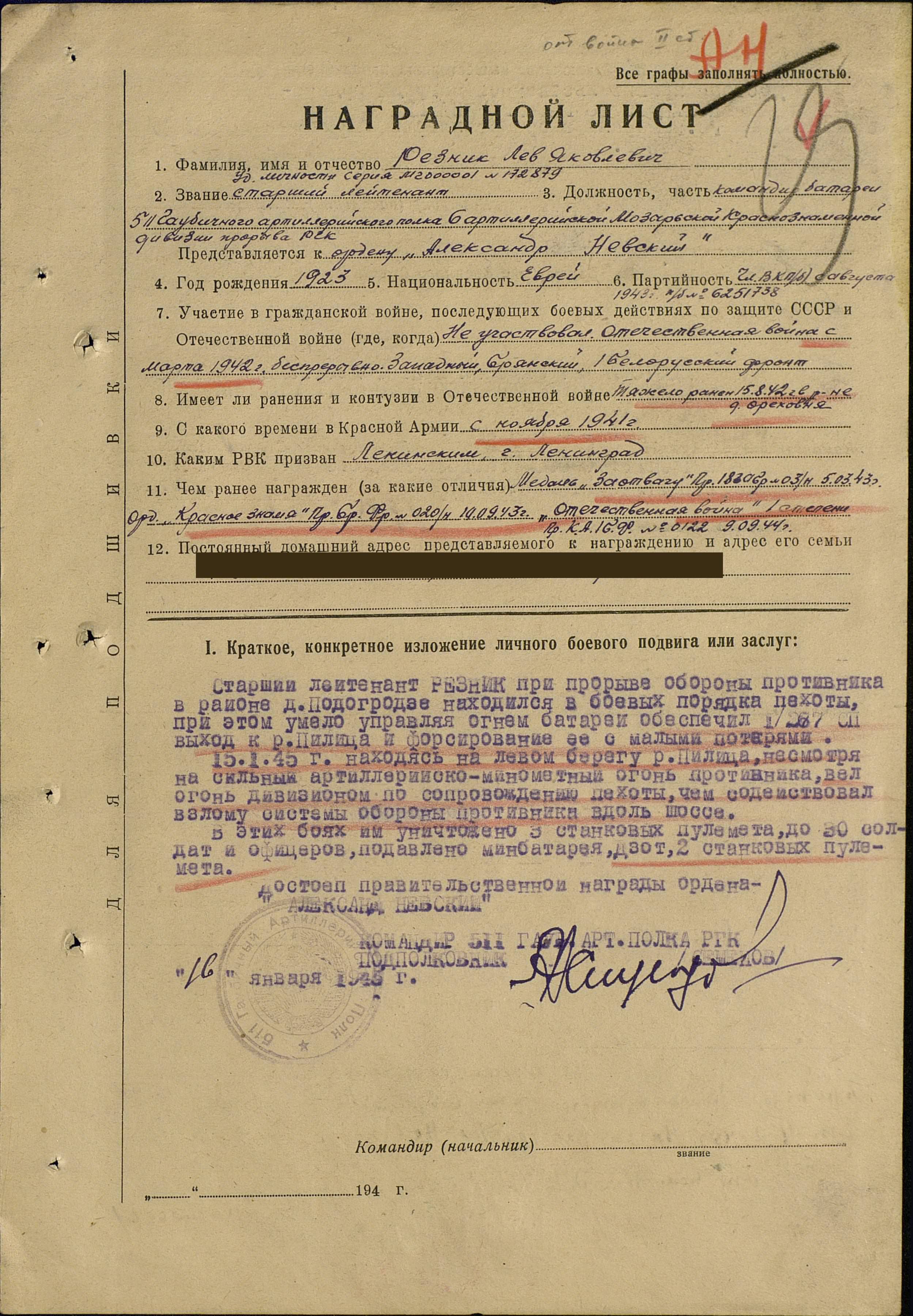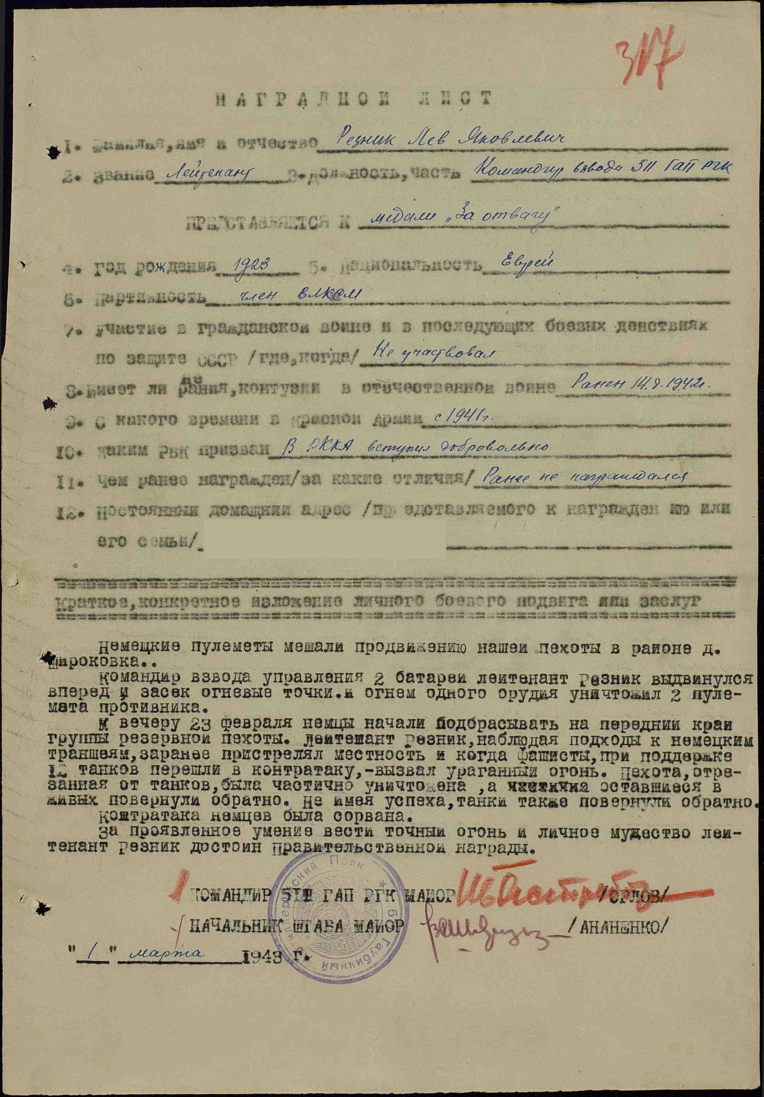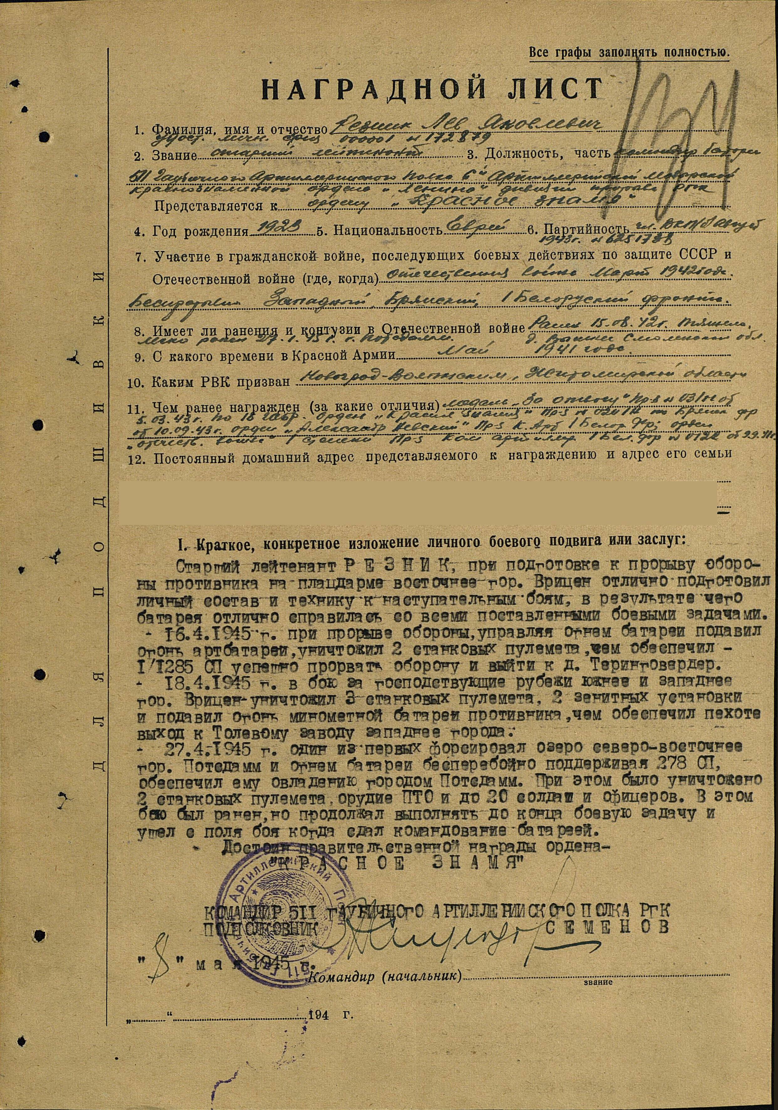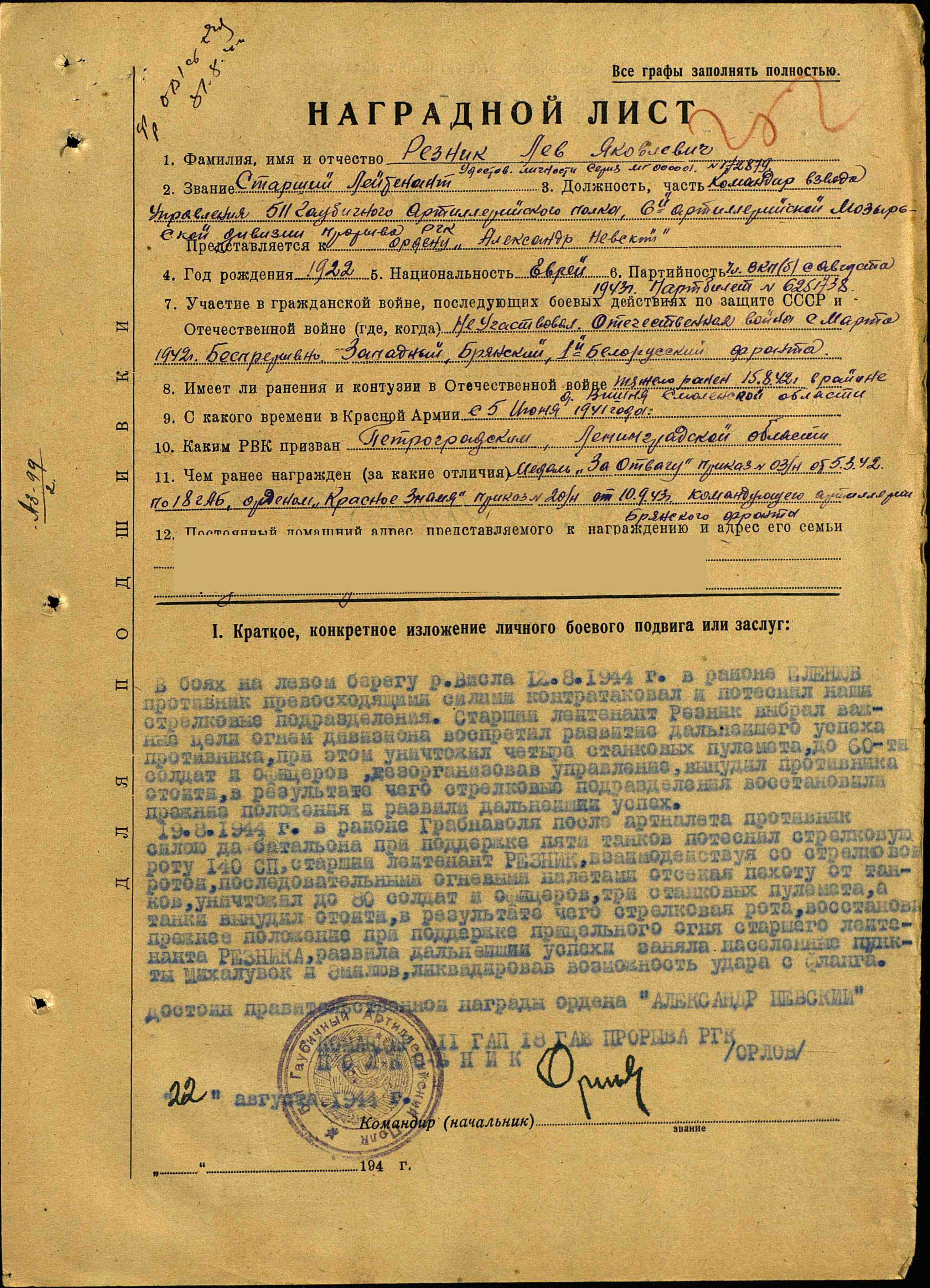 Капитан РЕЗНИК ЛЕВ ЯКОВЛЕВИЧ, 1923 года рождения, место рождения - Украинская ССР, Житомирская область, Новоград - Волынский район, г. Новоград - Волынский, еврей. В РККА вступил добровольно 11.1941 года через Ленинский РВК, Ленинского района, г. Ленинграда, Ленинградской области, РСФСР. В Великой Отечественной войне с 03.1942 года (на  Западном, Брянском, 1 Белорусских фронтах) в должности (последняя): Командира батареи 511 гаубичного артиллерийского полка, 18 гаубичной артиллерийской бригады, 6 артиллерийской дивизии прорыва РГК, 1 Белорусского фронта. Ранения: 1. Тяжёлое (13.08.1942 г.); учтён умершим от ран; извещение в адрес родственников; остался жив; продолжил службу в своей части. Боевые награды: 1. Ордена: "КРАСНОГО ЗНАМЕНИ" (2), "АЛЕКСАНДРА НЕВСКОГО", ОТЕЧЕСТВЕННОЙ ВОЙНЫ" 1 СТЕПЕНИ; 2. Медали: "ЗА ОТВАГУ", "ЗА ПОБЕДУ НАД ГЕРМАНИЕЙ В ВЕЛИКОЙ ОТЕЧЕСТВЕННОЙ ВОЙНЕ 1941 - 1945 ГГ." с ЭЛЕКТРОННЫЙ  ДОКУМЕНТОВ «ПОДВИГ НАРОДА В ВЕЛИКОЙ ОТЕЧЕСТВЕННОЙ 1941-1945 ГГ.» .http://podvignaroda.ru/?#tab=navHome. Вернулся С Великой Отечественной войны. Уволен, в запас, из ВС СССР, 20.12.1945 года. Послевоенная судьба: неизвестна. Вечная Слава и Память!