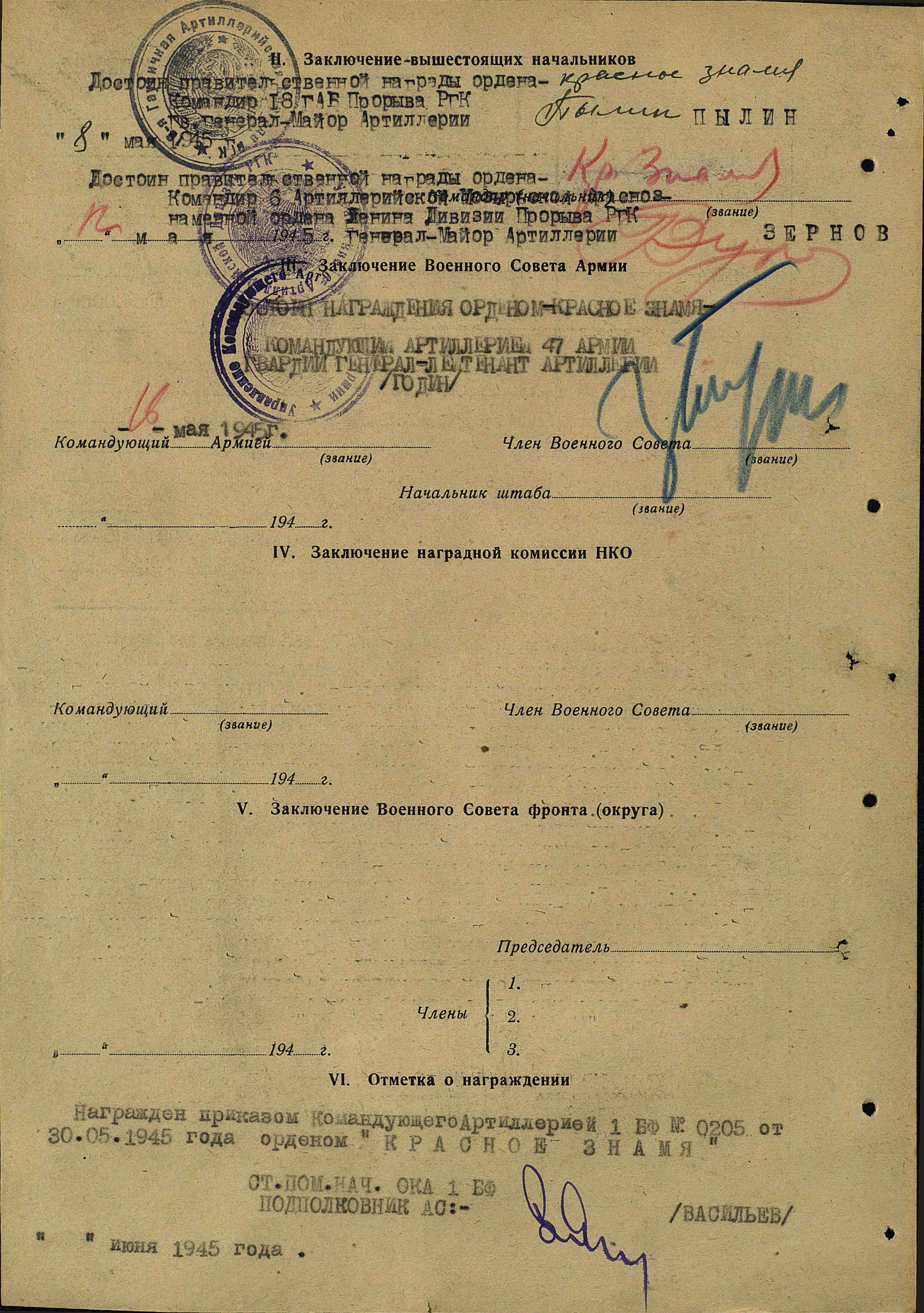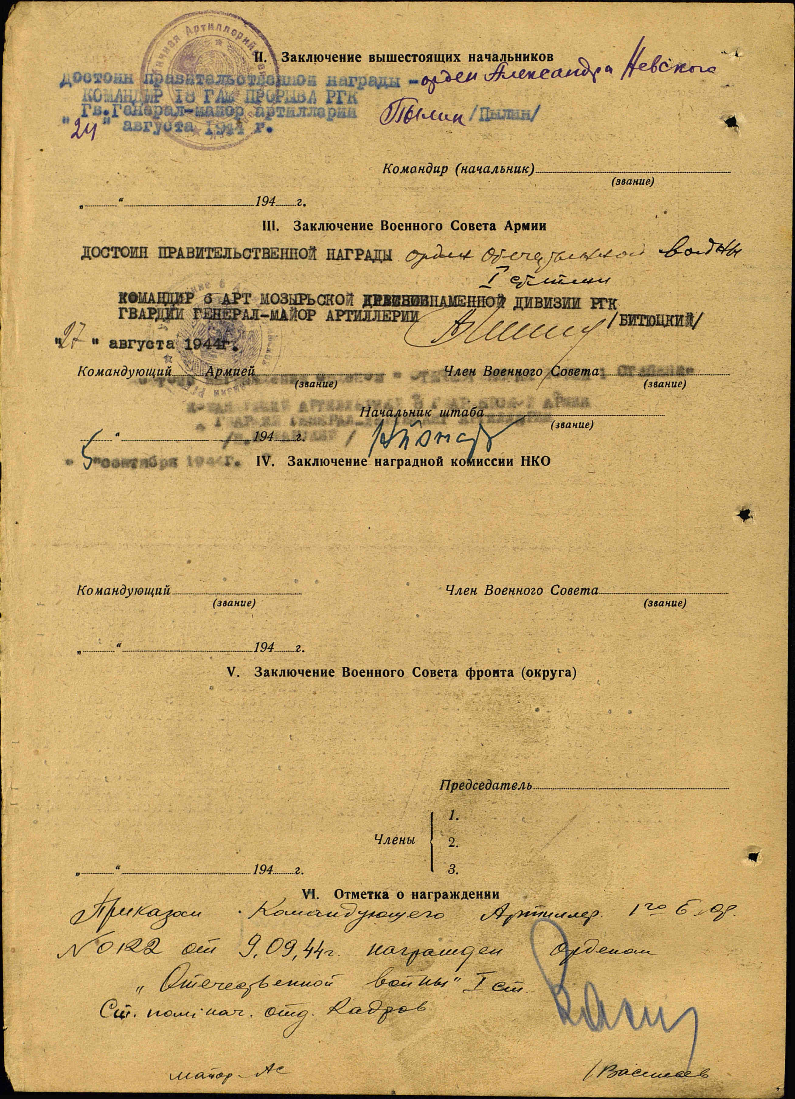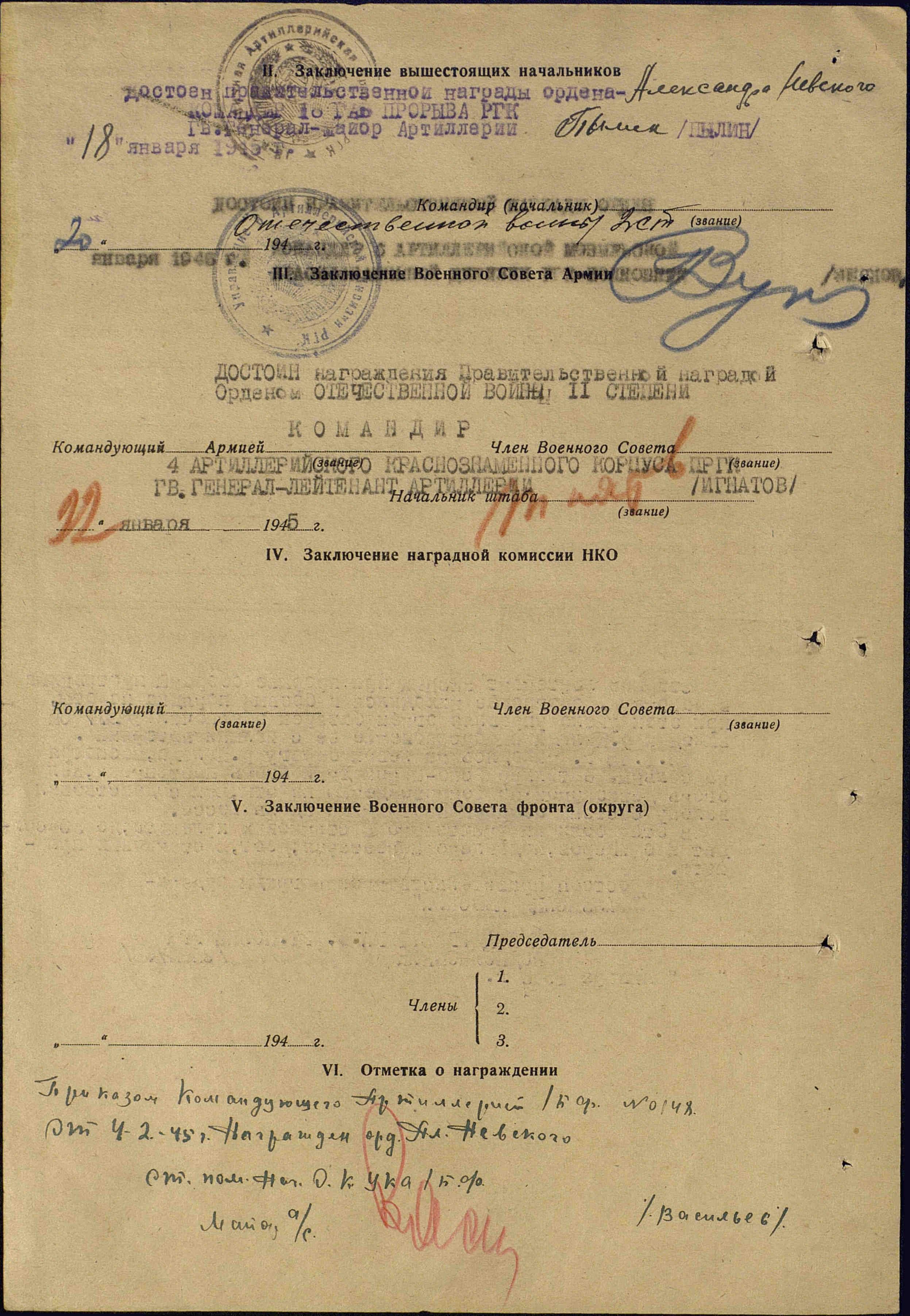 Командир батареи 511 гаубичного артиллерийского полка, 18 гаубичной артиллерийской бригады, 6 артиллерийской дивизии прорыва РГК, 1 Белорусского фронта.