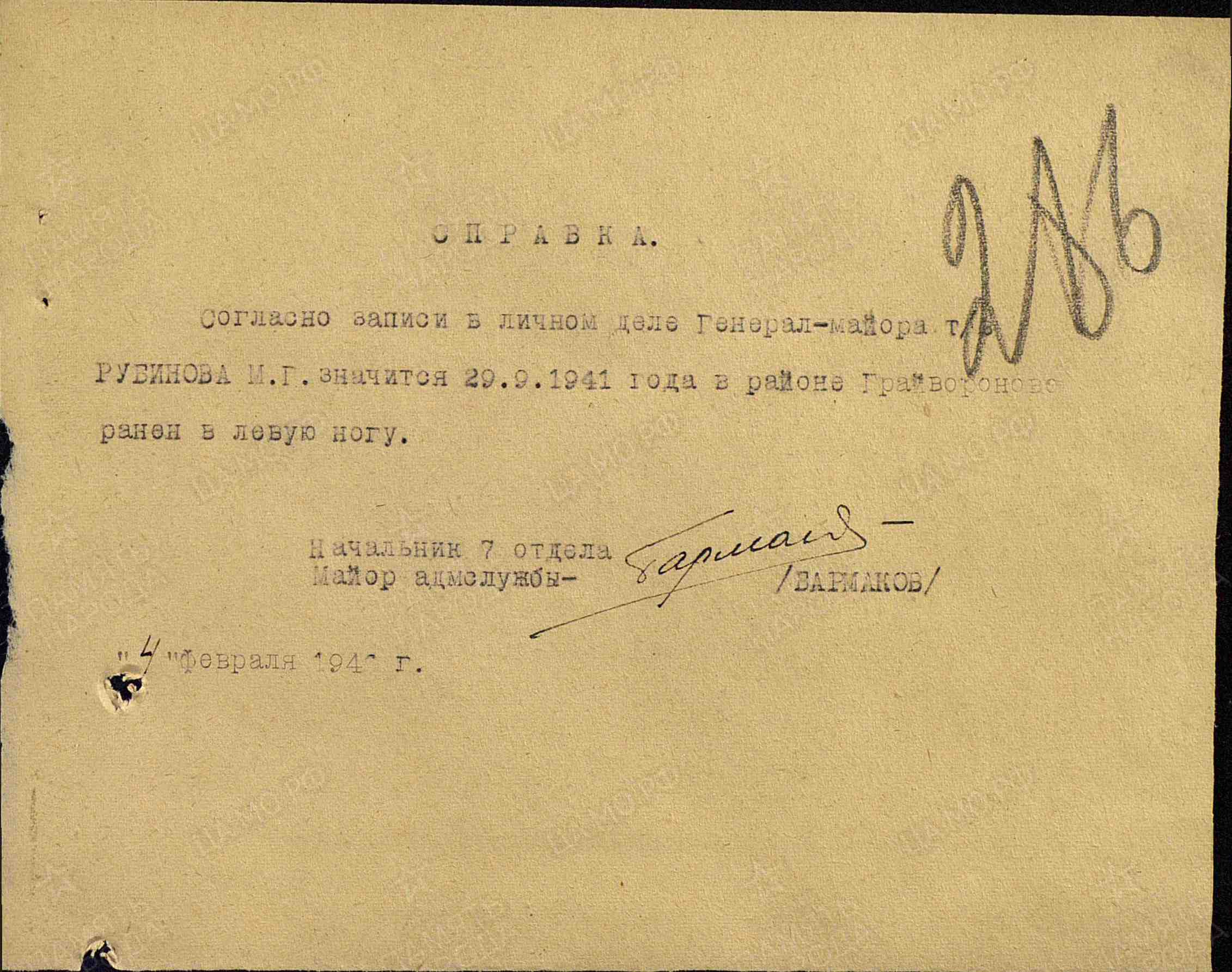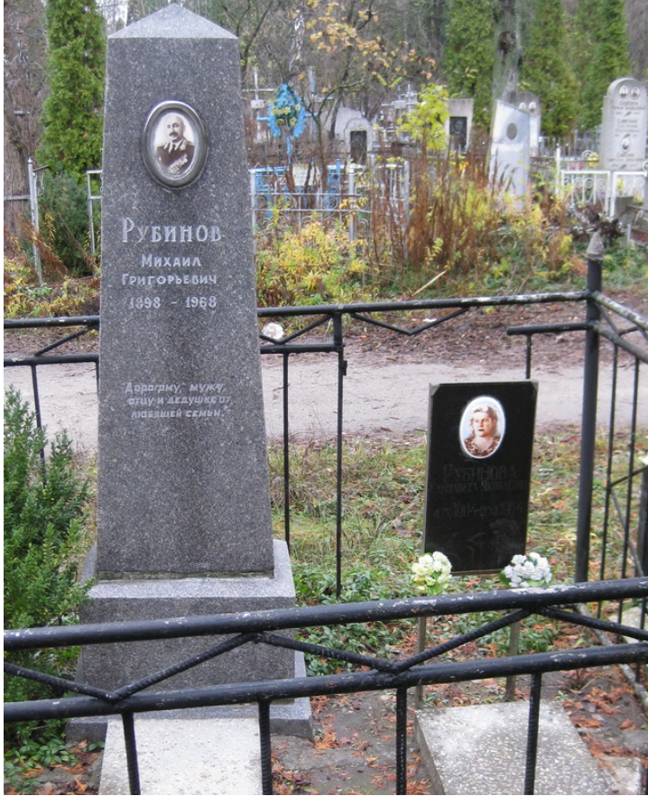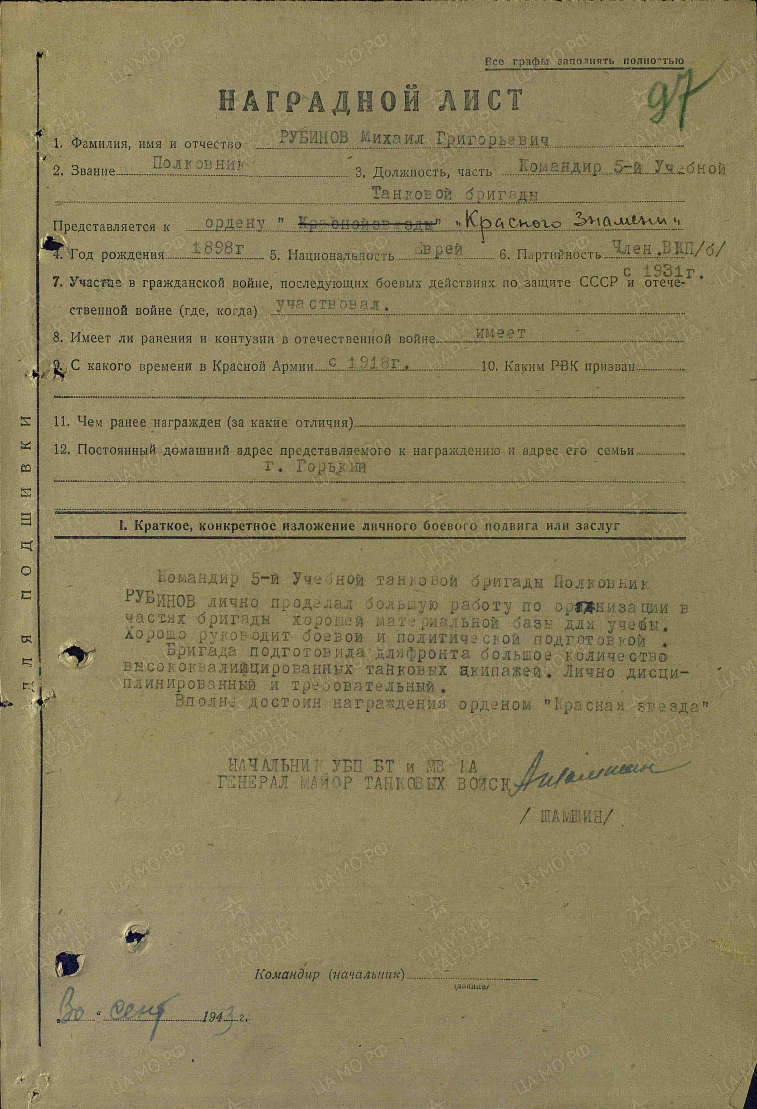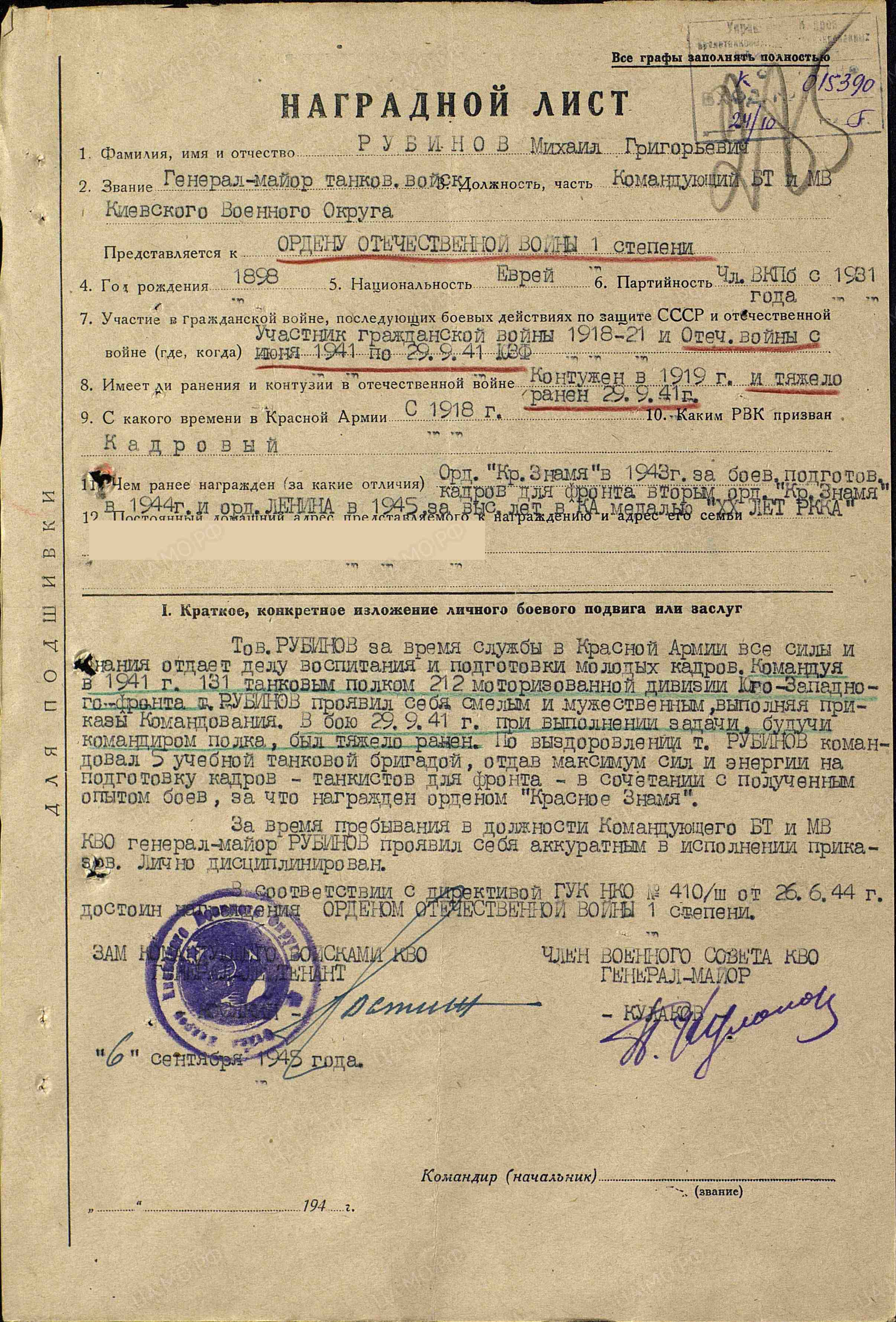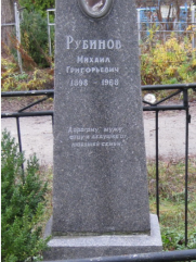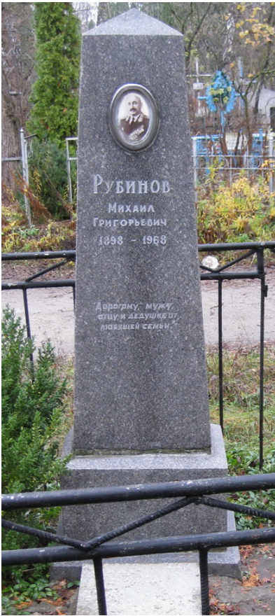 Генерал - майор танковых войск РУБИНОВ МИХАИЛ ГРИГОРЬЕВИЧ, 30.12.1898 года рождения, место рождения - Российская Империя, Полтавская губерния, Переяславский уезд, г. Переяслав (по административному делению СССР: Украинская ССР, Киевская область, Переяславский район, г. Переяслав), еврей. В 1912 году закончил 4-х классную еврейскую школу. Участник Первой мировой войны. В РККА с 1918 года. Участник Гражданской войны (1918 - 1921 гг.). Военное образование: 1 Московские артиллерийские курсы; Киевскую объединённую военную школу; Артиллерийские КУКС; Ленинградские БТ КУКС; Военную академию бронетанковых войск. В Великой Отечественной войне с 1941 года в должностях: Командира танкового полка; Танковой бригады; Начальника бронетанкового отдела Киевского военного округа (последняя.1945 год). Ранения: 1. Контузия (1919 год); 2. Тяжёлое (29.09.1941 года). Боевые награды: 1. Ордена: "ЛЕНИНА", "КРАСНОГО ЗНАМЕНИ" (3), "ОТЕЧЕСТВЕННОЙ ВОЙНЫ" 1 СТЕПЕНИ; 2. Медали: "20 ЛЕТ РККА", "ЗА ПОБЕДУ НАД ГЕРМАНИЕЙ В ВЕЛИКОЙ ОТЕЧЕСТВЕННОЙ ВОЙНЕ 1941 - 1945 ГГ." с ЭЛЕКТРОННЫЙ ДОКУМЕНТОВ «ПОДВИГ НАРОДА В ВЕЛИКОЙ ОТЕЧЕСТВЕННОЙ 1941-1945 ГГ.» http://podvignaroda.ru/?#tab=navHome. Вернулся с Великой Отечественной войны. Продолжил службу к кадрах, ВС СССР. Последняя должность, при увольнении в отставку (1.02.1956 года): Помощник командира - начальник технического отдела 20 гвардейского стрелкового корпуса по БТ. Умер 16.12.1968 года. Захоронен: Украина, г. Белая Церковь, ул. Киевская, городское кладбище, индивидуальное захоронение. Вечная Слава и Память!