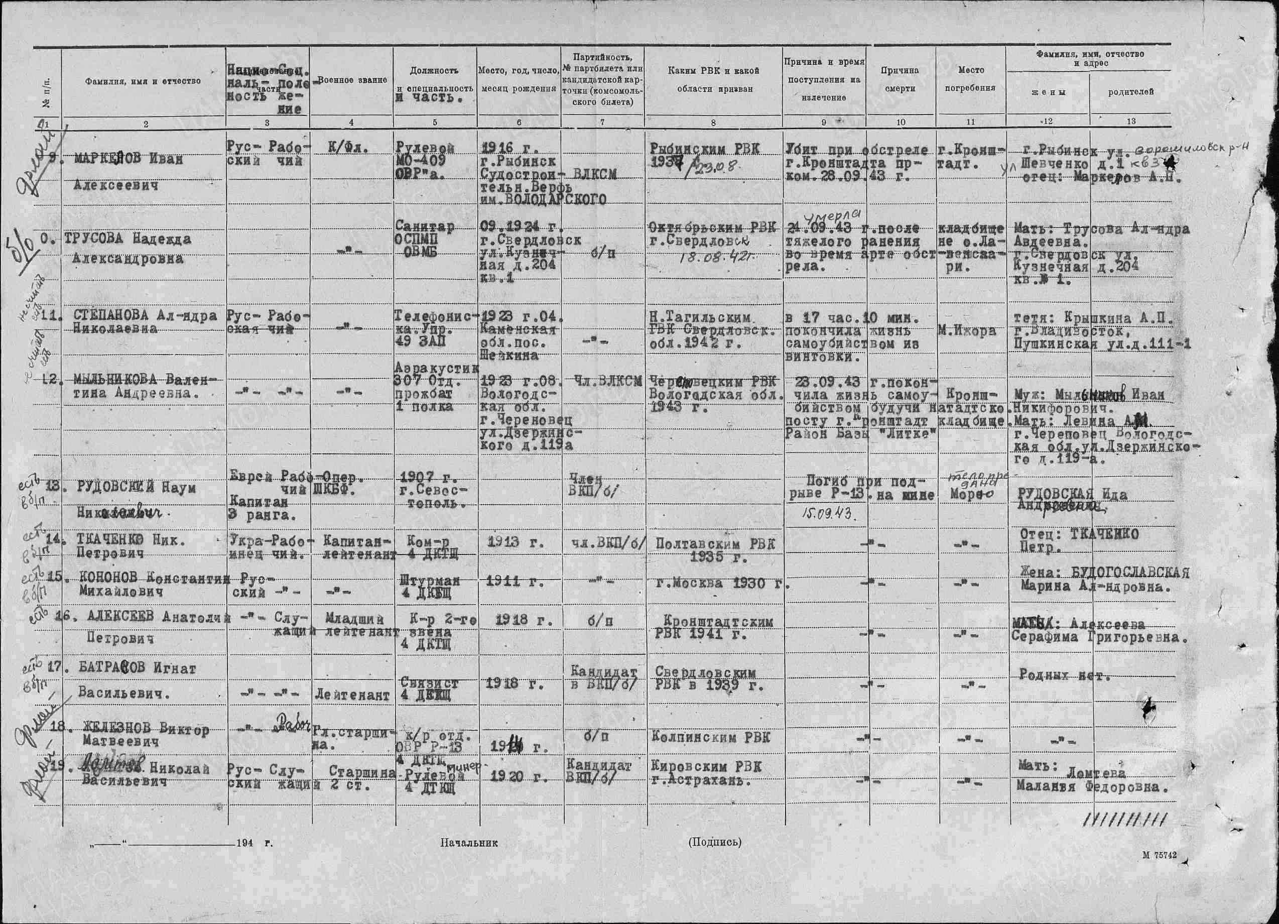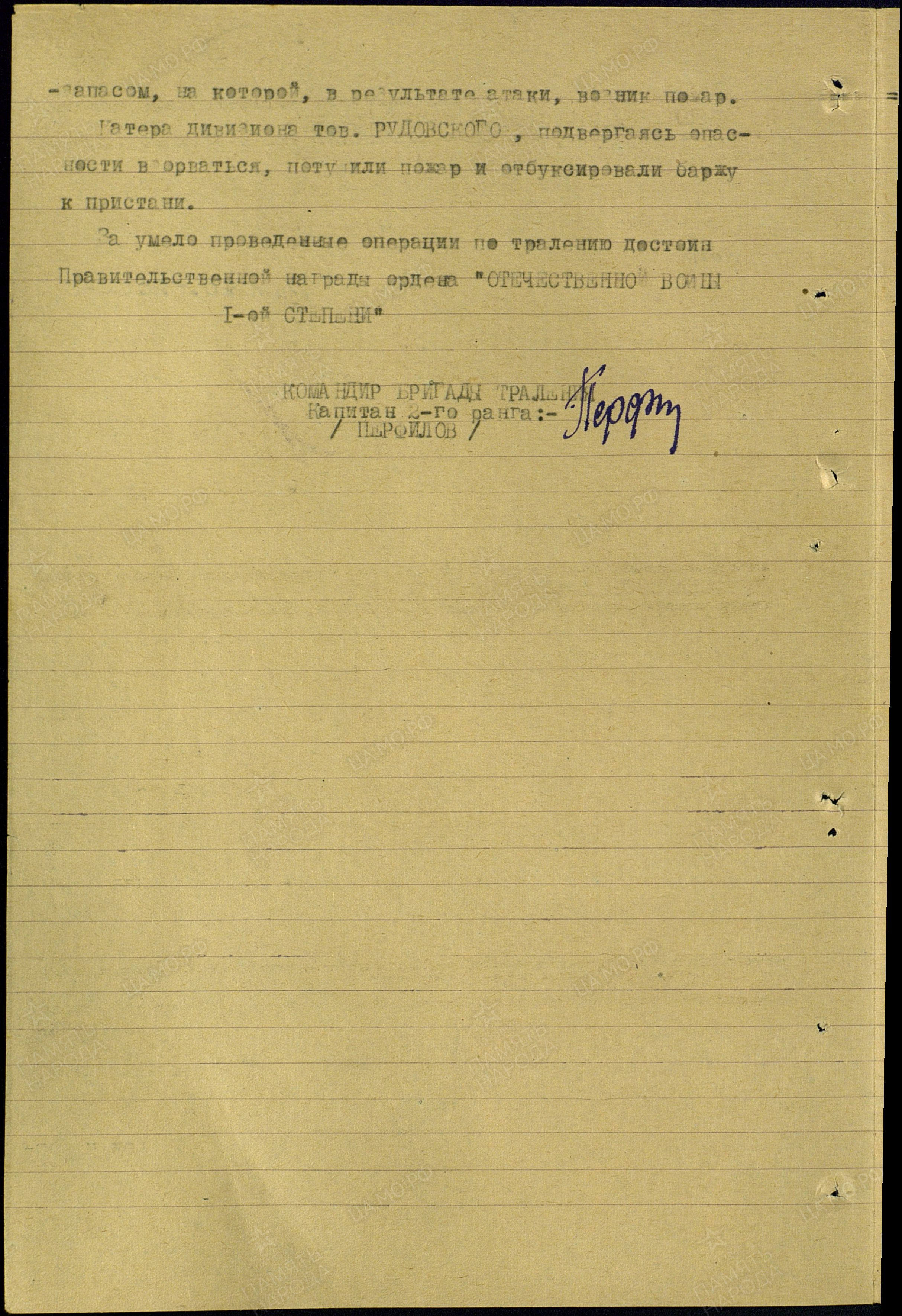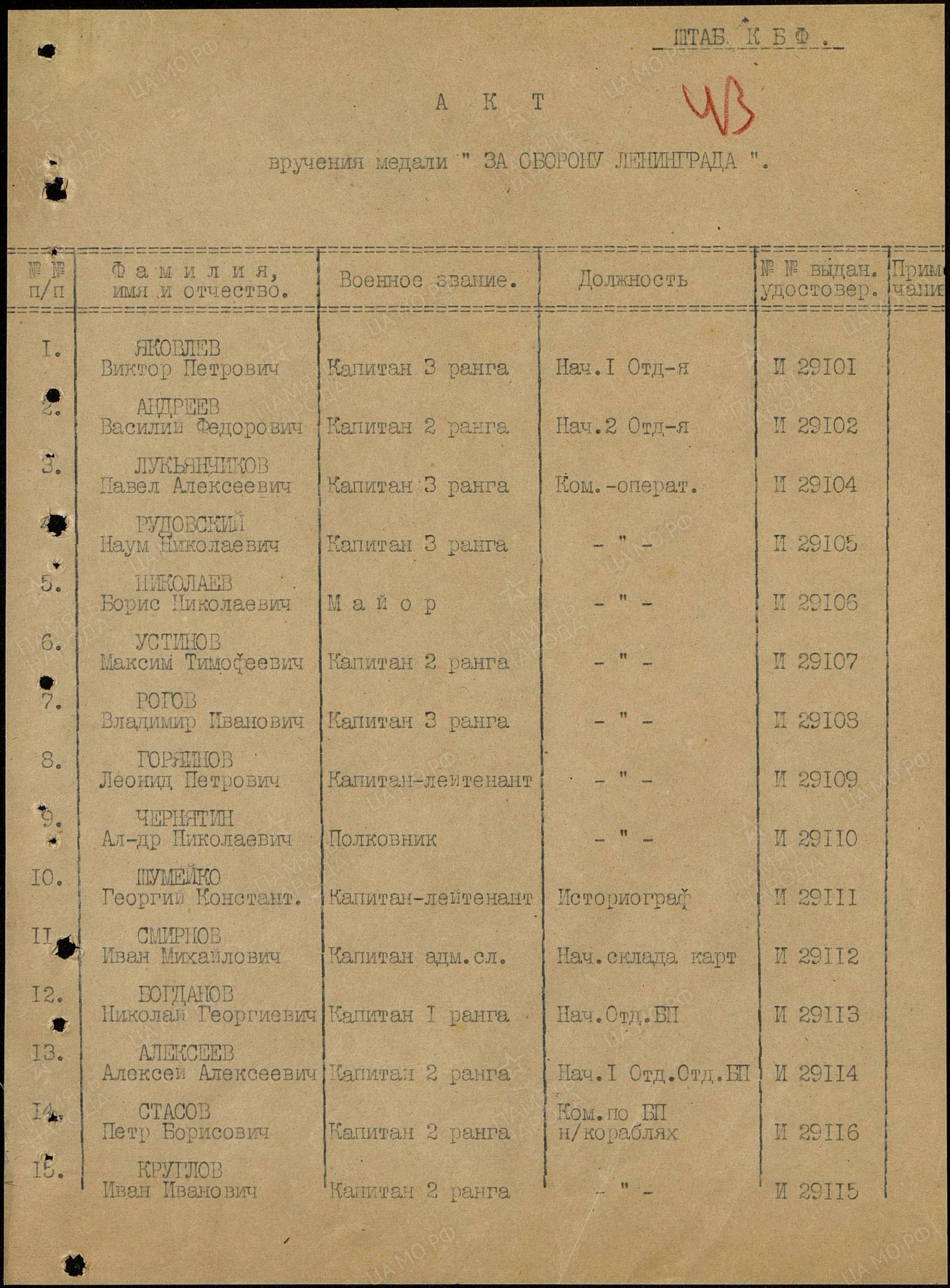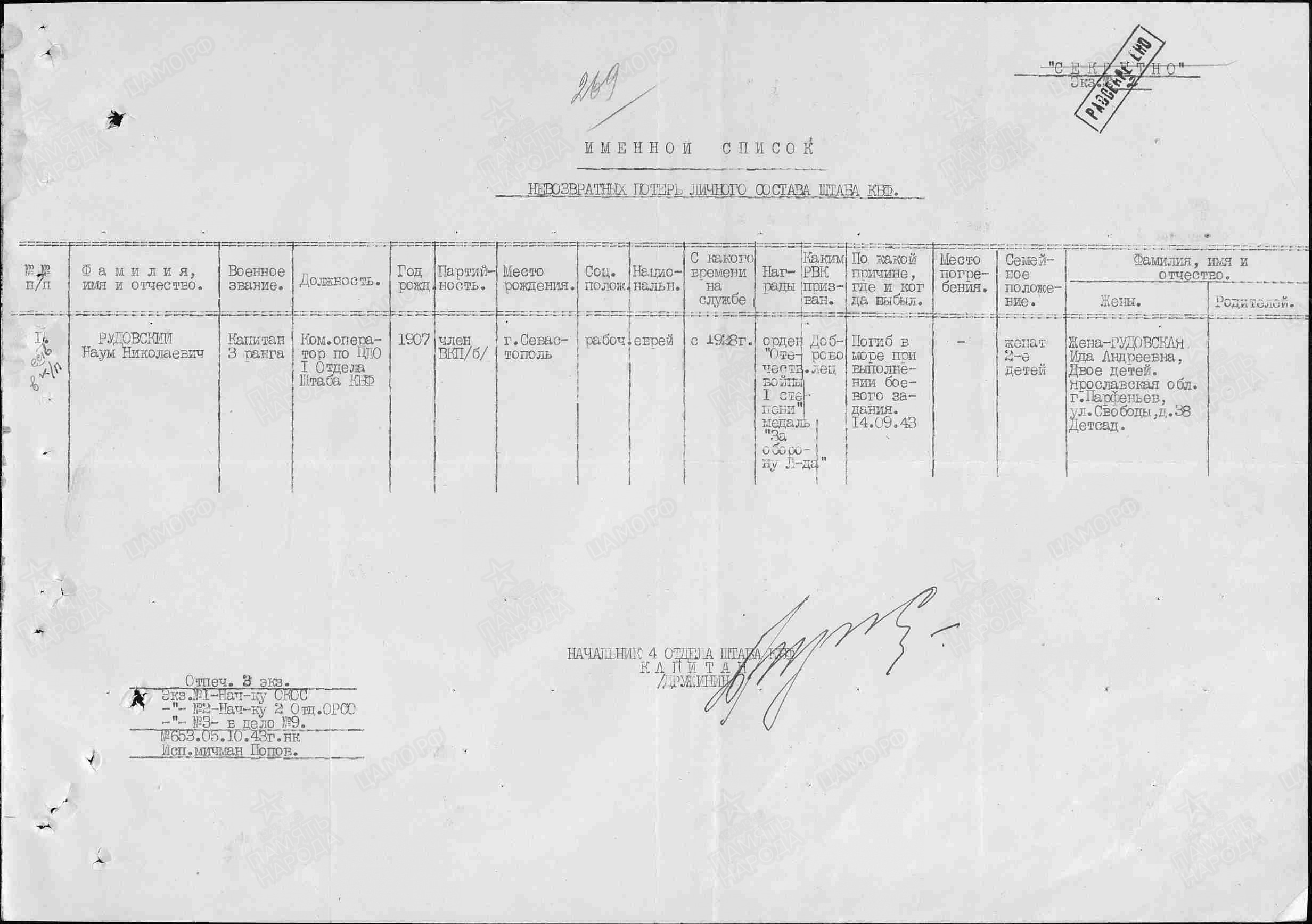 Капитан 3 ранга РУДОВСКИЙ НАУМ НИКОЛАЕВИЧ, 05.05.1905 года рождения, место рождения - Российская Империя, Таврическая губерния, Севастопольское граноначальство, уездный г. Севастополь (по административному делению СССР: Крымская АССР, г. Севастополь), еврей. В ВМФ призван в 1928 году и направлен на учебу в Военно - морское училище им. М.В. Фрунзе, г. Ленинград. Кадровый офицер. Участник боёв на озере Хасан (29 июля 1938 – 11 августа, 1938). В Великой Отечественно войне на Краснознамённом Балтийском флоте в должности (последняя): Командира оператора 1 отделения (оперативного) по противолодочной обороне штаба Краснознамённого Балтийского флота. Ранения: нет. Боевые награды: 1. Орден "ОТЕЧЕСТВЕННОЙ ВОЙНЫ" 1 СТЕПЕНИ; 2. Медаль "ЗА ОБОРОНУ ЛЕНИНГРАДА" с ЭЛЕКТРОННЫЙ БАНК ДОКУМЕНТОВ «ПОДВИГ НАРОДА В ВЕЛИКОЙ ОТЕЧЕСТВЕННОЙ ВОЙНЕ 1941-1945 ГГ.» http://podvignaroda.ru/?#tab=navHome С Великой Отечественной войны не вернулся: 14.09.1943 года, погиб, при подрыве катера тральщика, на мине. Извещение: Ленинградский ГВК, РСФСР, Ленинградская область, г. Ленинград, ул. Войнова, дом 40а,кв.№21, жена - Башлыкова - Рудовская Ида Андреевна (двое детей). Захоронен: тело предано морю. Вечная Слава и Память!