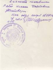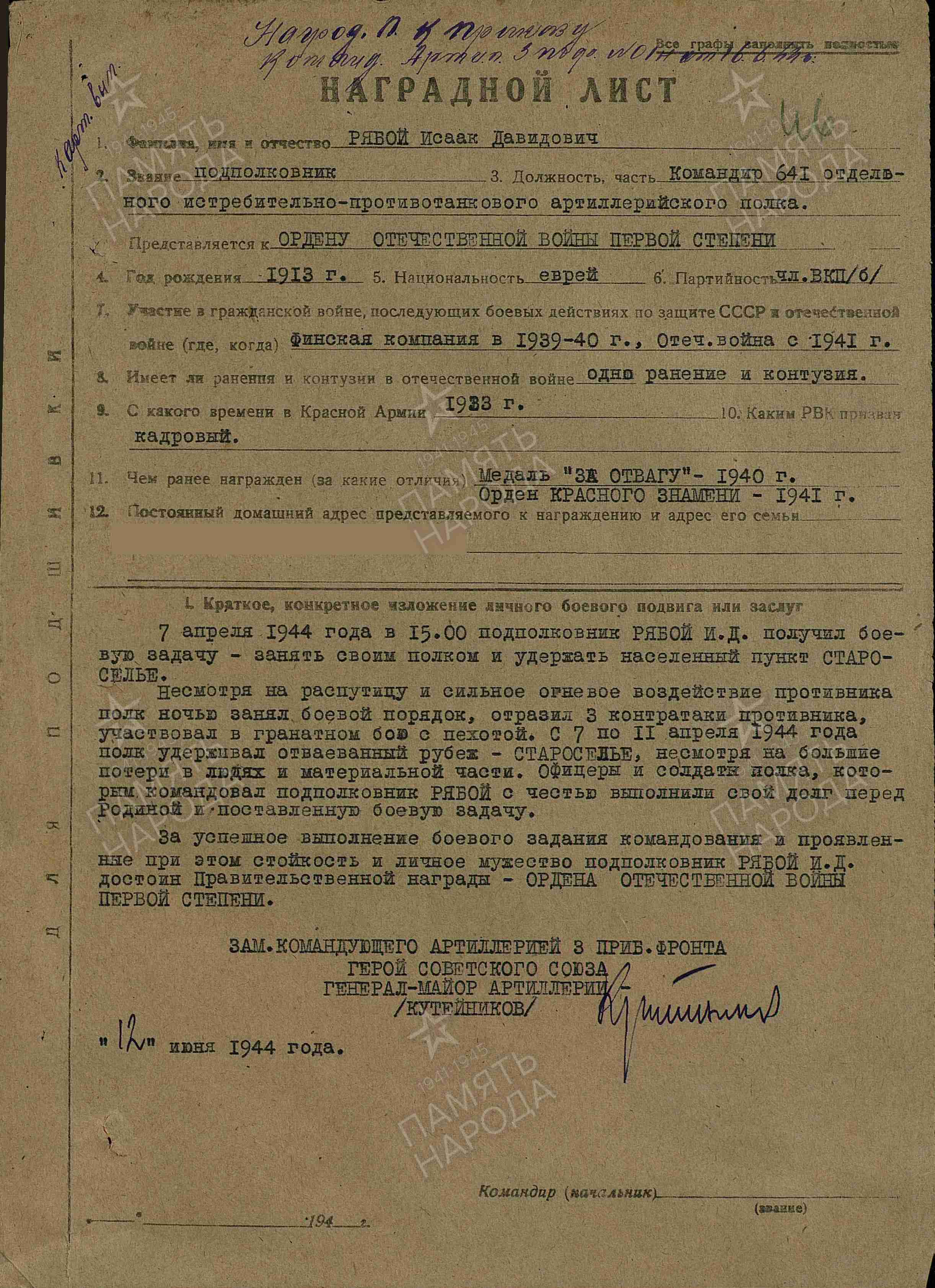 Гвардии полковник РЯБОЙ ИСААК ДАВЫДОВИЧ, 1913 года рождения, место рождения - Российская Империя, Киевская губерния, Уманский уезд, г. Умань (по административному делению СССР: Украинская ССР, Киевская область, Уманский район, г. Умань), еврей. В РККА призван Одесским ГВК, г. Одессы, Одесской области, Украинской ССР, в 1933 году. Кадровый офицер - артиллерист. Участник советско - финской войны (1939 - 1940 гг.). В Великой Отечественной войне с 06.1941 года (на Ленинградском, Северо - Западном, 3 Прибалтийском фронтах), в должности (последняя): Командира 641 отдельного истребительно - противотанкового артиллерийского полка, 54 армии, 3 Прибалтийского фронта. Ранения: одно ранение и контузия. Боевые награды: 1. Ордена: "АЛЕКСАНДРА НЕВСКОГО", "КРАСНОГО ЗНАМЕНИ" (2; № записи 32386017; Из НАГРАДНОГО ЛИСТА: