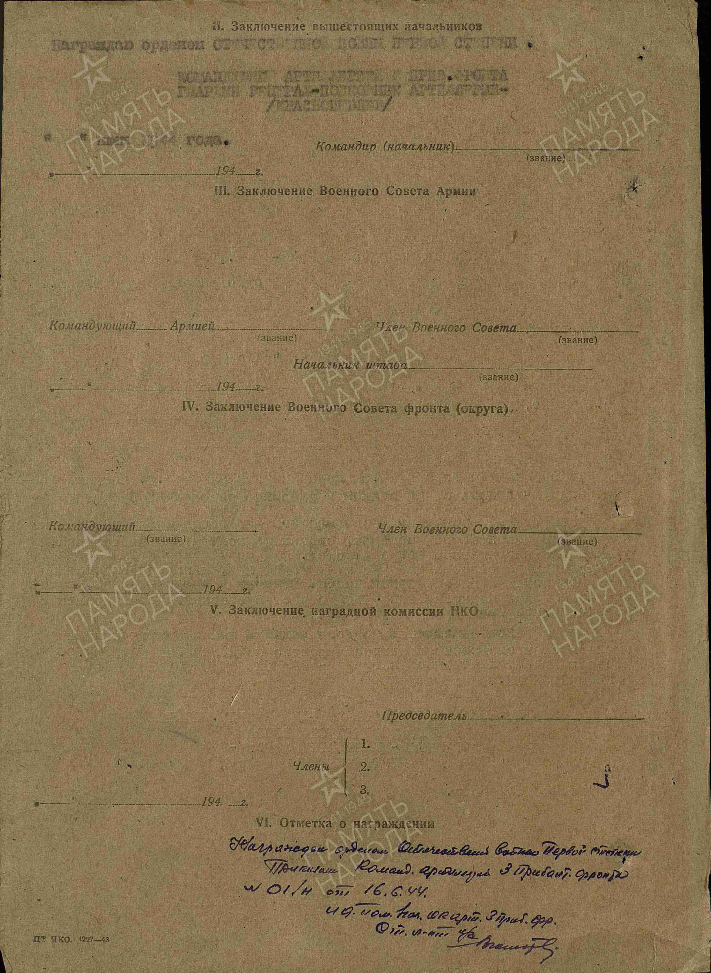 За боевую работу и личную храбрость, в выполнении заданий, достоин награждения орденом "КРАСНОЕ ЗНАМЯ". Командующий артиллерией 54 армии Генерал - майор артиллерии МИХАЛКИН. 16 апреля 1944 года"), "), "ОТЕЧЕСТВЕННОЙ ВОЙНЫ" 1 СТЕПЕНИ (2), "КРАСНОЙ ЗВЕЗДЫ"; 2. Медали: "ЗА ОТВАГУ", "ЗА БОЕВЫЕ ЗАСЛУГИ", "ЗА ОБОРОНУ ЛЕНИНГРАДА", "ЗА ПОБЕДУ НАД ГЕРМАНИЕЙ В ВЕЛИКОЙ ОТЕЧЕСТВЕННОЙ ВОЙНЕ 1941 - 1945 ГГ." с ЭЛЕКТРОННЫЙ БАНК ДОКУМЕНТОВ «ПОДВИГ НАРОДА В ВЕЛИКОЙ ОТЕЧЕСТВЕННОЙ ВОЙНЕ 1941-1945 ГГ.» http://podvignaroda.ru/?#tab=navHome Вернулся с Великой Отечественной войны. Послевоенная судьба: неизвестна. Вечная Память и Слава!