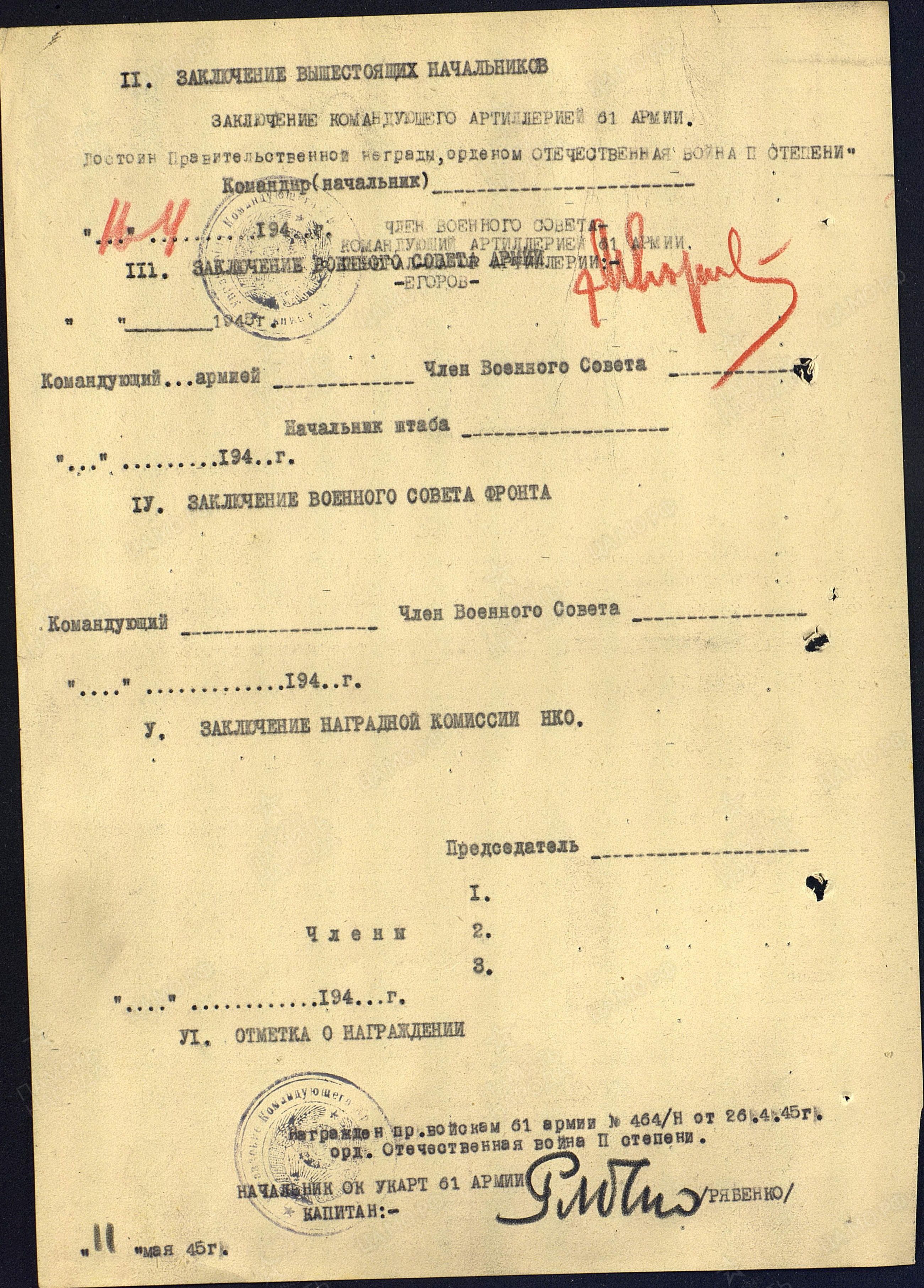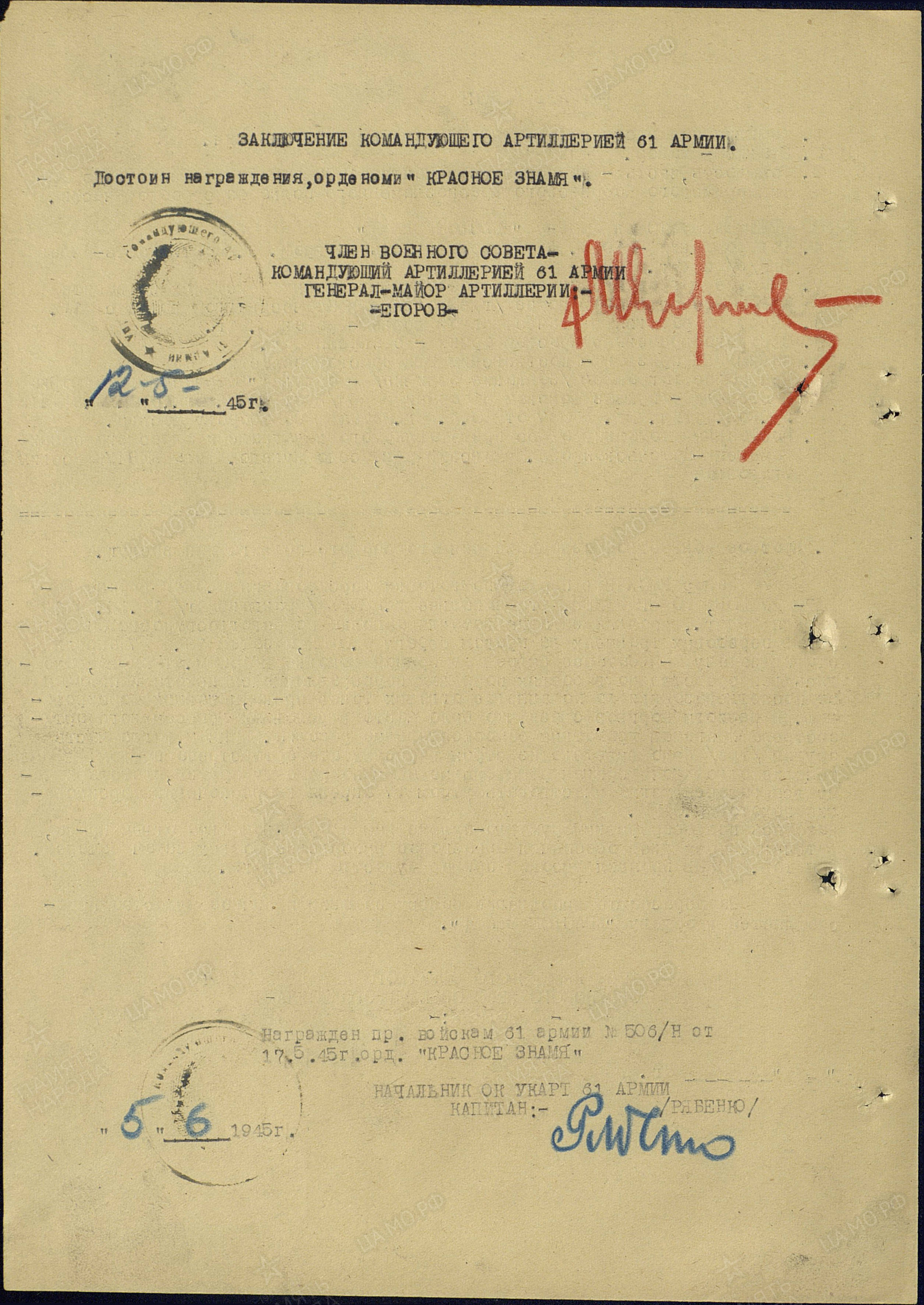 орден Красного Знамени, два ордена Отечественной Войны 1-й степени, орден Отечественной Войны 2-й степени, орден Красной Звезды, медаль "За Боевые Заслуги", медаль "За оборону Москвы" и др.медали.